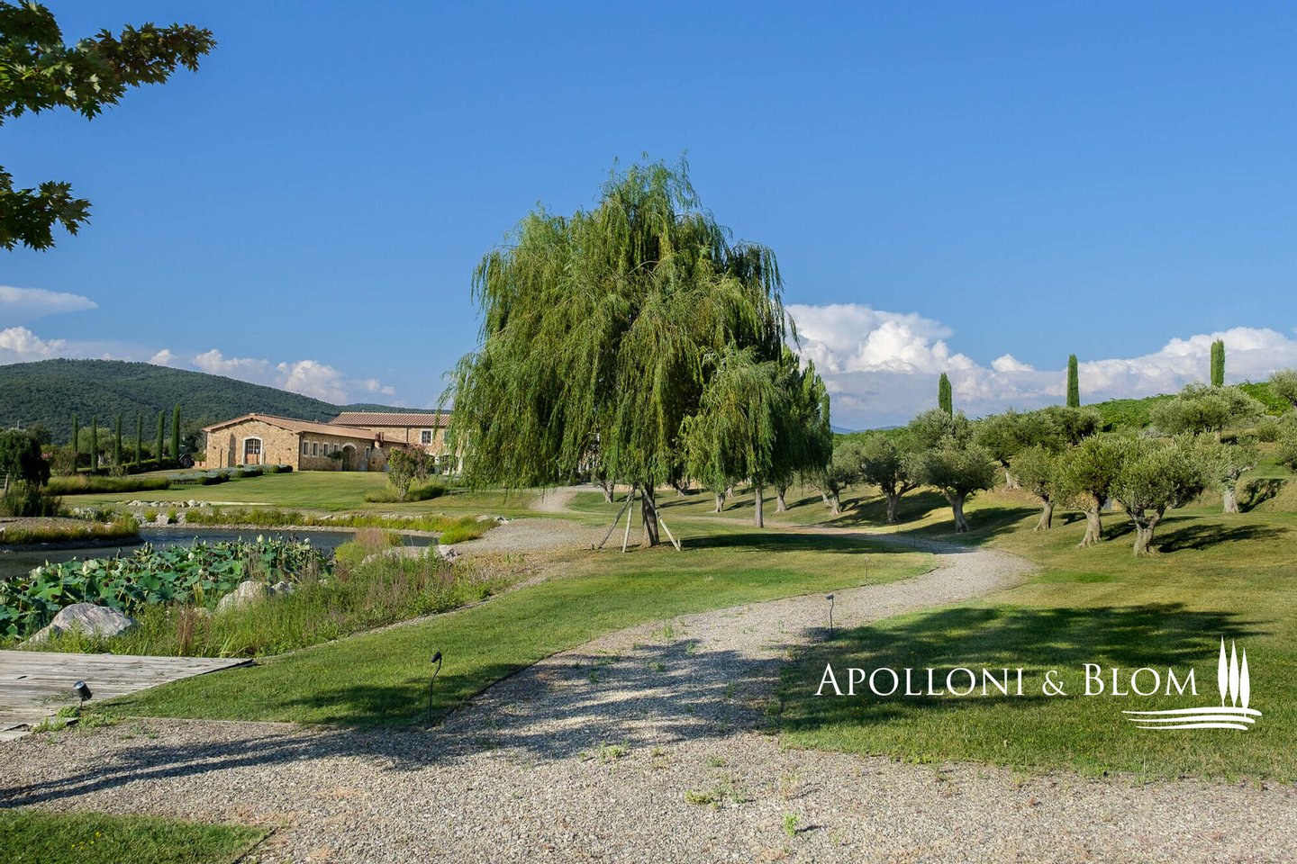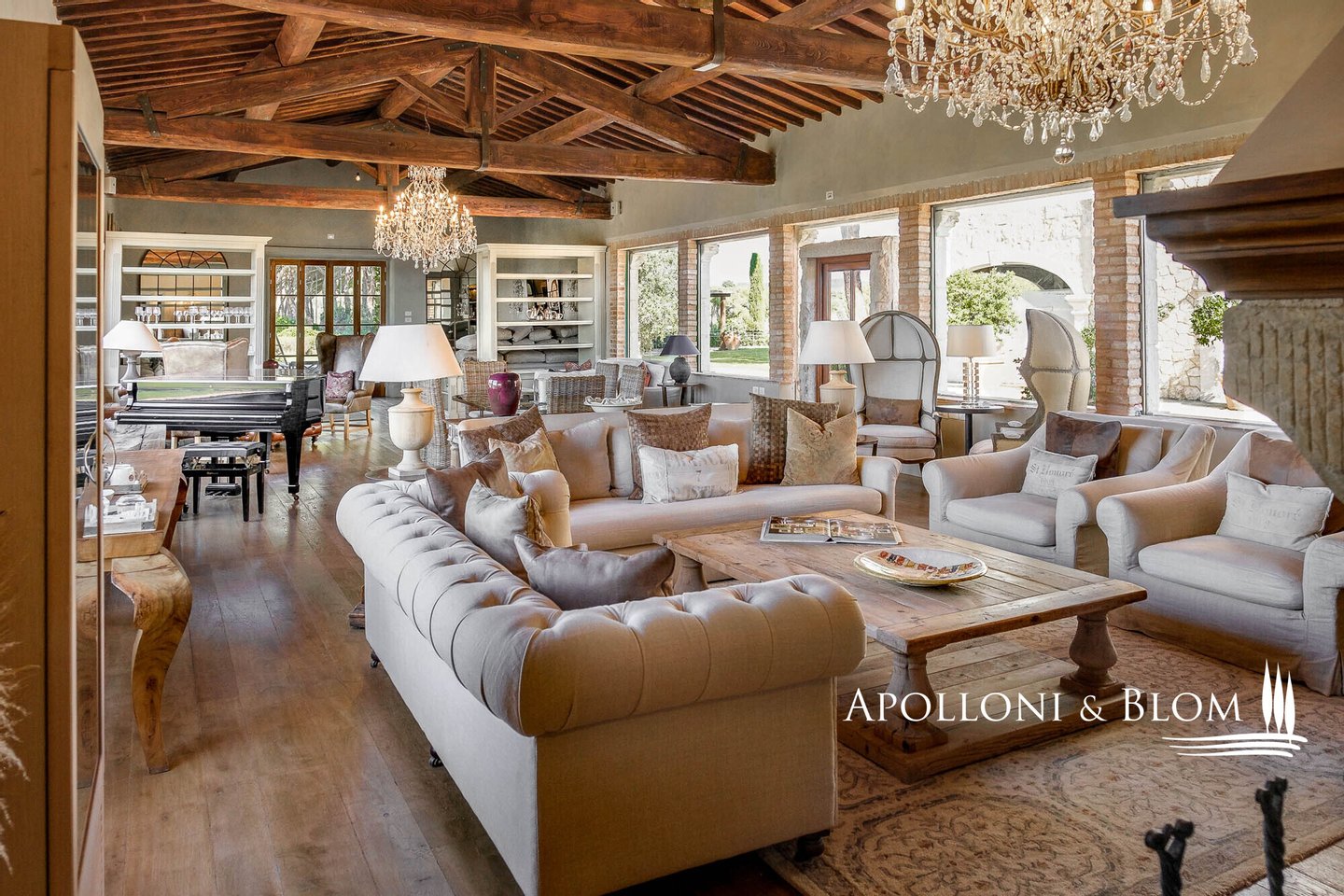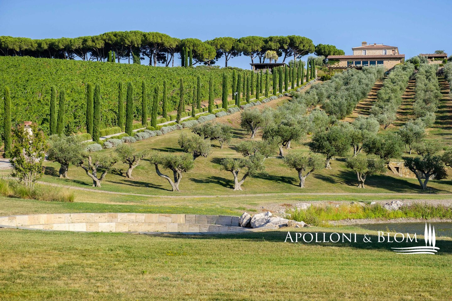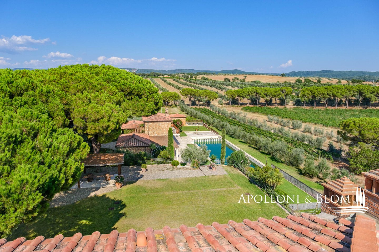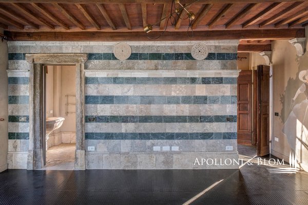Land: 33,81 Hektar einschließlich des Parks, ein Gemüsegarten mit einem Obstgarten von ca. 1 Hektar, 20,7 Hektar Ackerland, 7,4 Hektar Olivenhain mit 1.100 Bäumen, 3,7 Hektar Ackerland mit Baumbestand und Wald, 2,7 Hektar Weinberg mit Sangiovese, Merlot und Cabernet Sauvignon