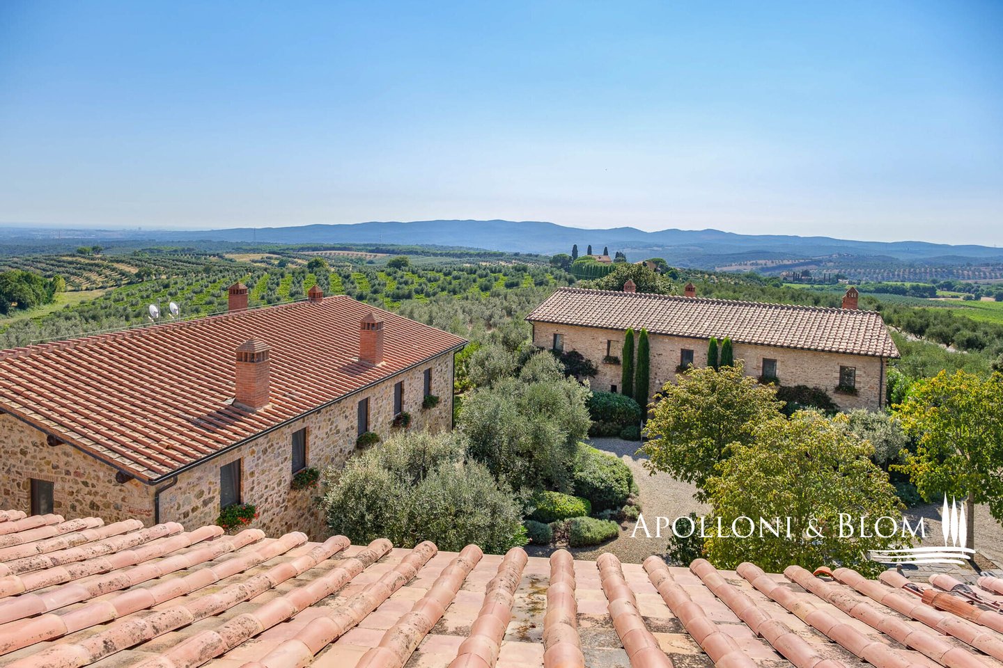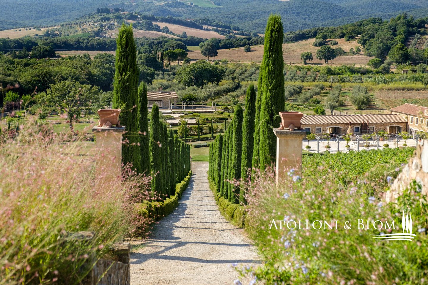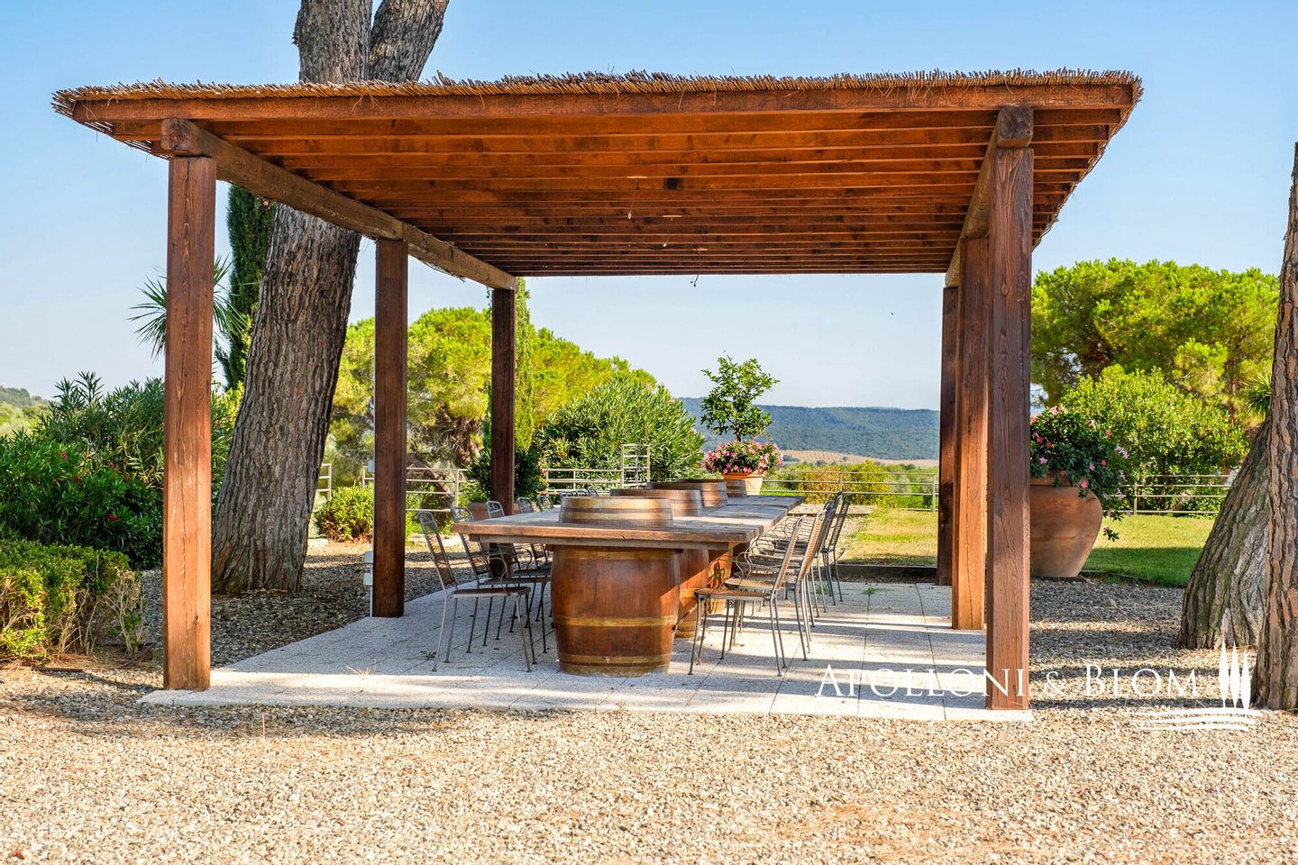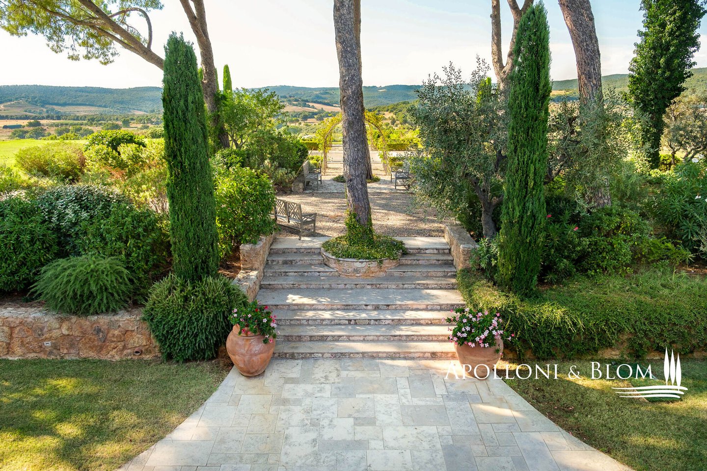 Land: 33,81 Hektar einschließlich des Parks, ein Gemüsegarten mit einem Obstgarten von ca. 1 Hektar, 20,7 Hektar Ackerland, 7,4 Hektar Olivenhain mit 1.100 Bäumen, 3,7 Hektar Ackerland mit Baumbestand und Wald, 2,7 Hektar Weinberg mit Sangiovese, Merlot und Cabernet Sauvignon