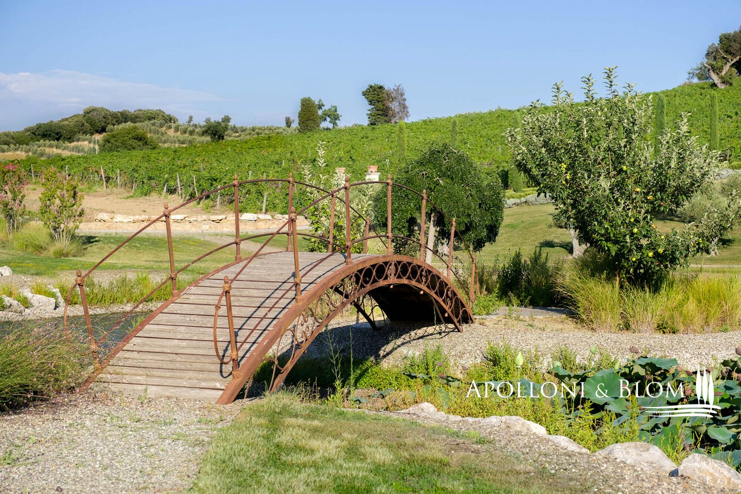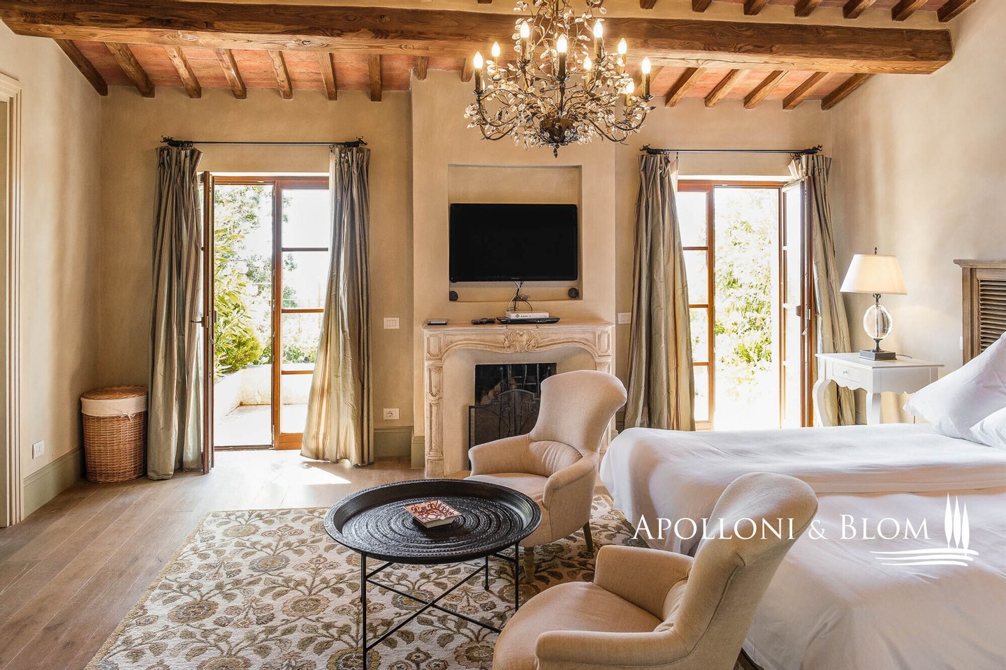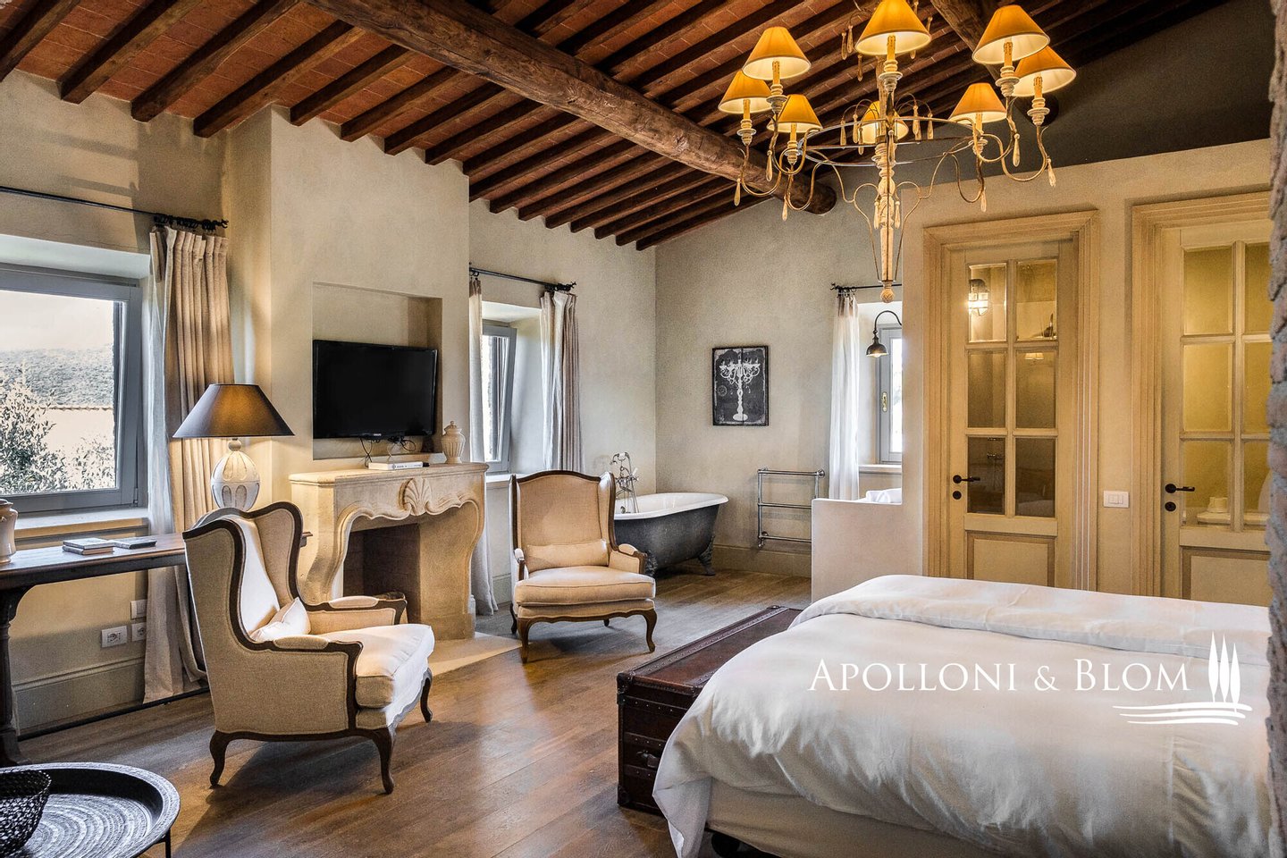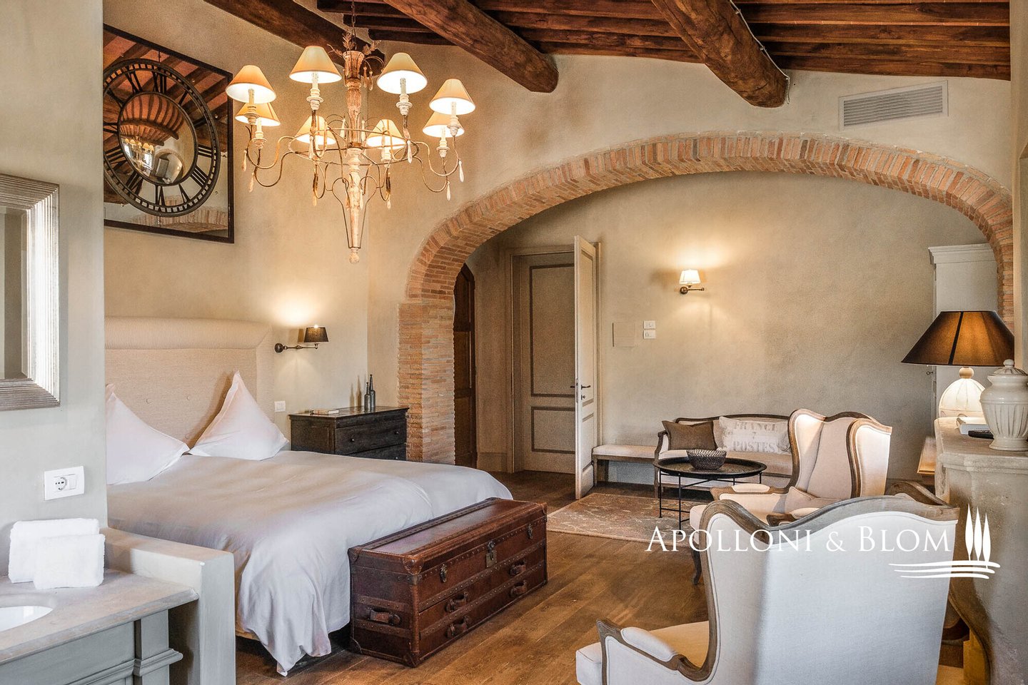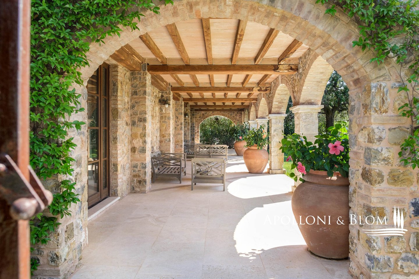 Land: 33,81 Hektar einschließlich des Parks, ein Gemüsegarten mit einem Obstgarten von ca. 1 Hektar, 20,7 Hektar Ackerland, 7,4 Hektar Olivenhain mit 1.100 Bäumen, 3,7 Hektar Ackerland mit Baumbestand und Wald, 2,7 Hektar Weinberg mit Sangiovese, Merlot und Cabernet Sauvignon