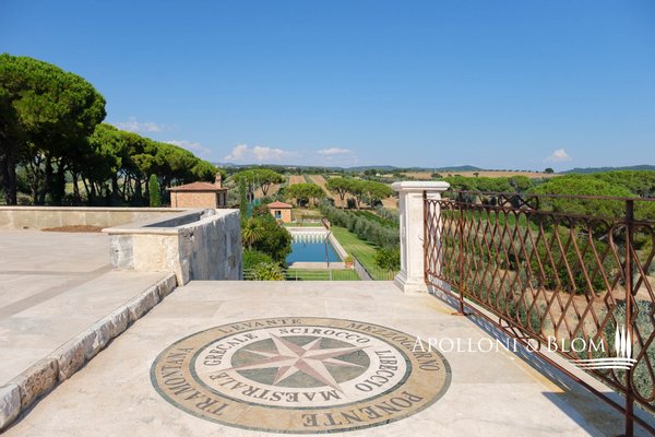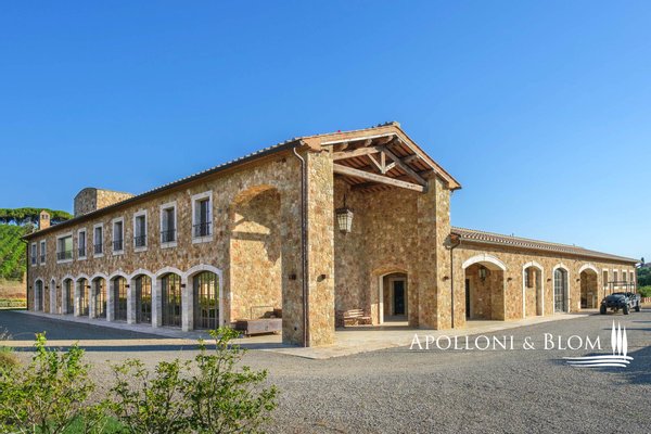 Luxuriöses Anwesen in der Maremma, Toskana, mit Park, Schwimmbad, Sportanlagen, Reitzentrum, Weinbergen und Weingut. Eingebettet in die malerische Landschaft der Alta Maremma, nur 15 km vom Hafen von Scarlino und den Stränden von Punta Ala entfernt, erstreckt sich das Anwesen über 33,81 Hektar Land, mit unterschiedlichen Höhenlagen und einer günstigen Südlage. Das Land ist abwechselnd mit Weinbergen und jahrhundertealten Olivenhainen bepflanzt und bietet so ein außergewöhnliches Ambiente. Auf den 2,7 Hektar Weinbergen werden hervorragende Weine aus Sangiovese, Merlot und Cabernet Sauvignon erzeugt. Eine von Zypressen gesäumte Allee führt zu einem alten steinernen Weiler mit einer Hauptvilla und weiteren Gebäuden, die auf einen Innenhof blicken, der einen atemberaubenden Blick auf den Park, die Hügel und die Stallungen bietet. Die sorgfältig restaurierte Hauptvilla bewahrt den rustikalen toskanischen Stil mit doppelhohen Decken, Holzbindern und Details aus Stein und Marmor. Die Villa erstreckt sich über drei Etagen und beherbergt großzügige Wohnbereiche, eine professionelle Küche, einen Kinoraum und fünf Schlafzimmer mit eigenem Bad. Ein Steingebäude mit Säulengängen und Glasfenstern bietet ein Panoramawohnzimmer mit zentralem Kamin und einem 360°-Blick auf das Anwesen. Zwei steinerne Bauernhäuser beherbergen Büros, Mehrzweckräume und zwölf Suiten mit Klimaanlage und Bädern mit Whirlpools. Der Park umfasst Blumenbeete, einen Springbrunnen, aromatische Pflanzen, Rasenflächen, ein Sportzentrum mit Golf-, Volleyball- und Tennisplätzen sowie ein Schwimmbecken aus Travertin mit Poolhaus. Außerhalb des Hauptgebäudes befinden sich ein Gemüsegarten mit Obstgarten, ein künstlicher See, ein Reitzentrum mit Boxen, Paddocks und einem Sandplatz sowie eine Hubschrauberplattform. Die Ölmühle und die 1.100 Olivenbäume produzieren extra natives Olivenöl aus 0 km. Die bezaubernde Lage und das ganzjährig günstige Klima machen diese Residenz zum idealen Ort, um mit Familie und Freunden zu leben, unvergessliche Veranstaltungen auszurichten oder Reisende zu empfangen, die die Maremma und die Toskana entdecken möchten.
