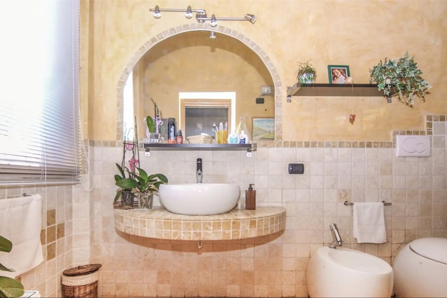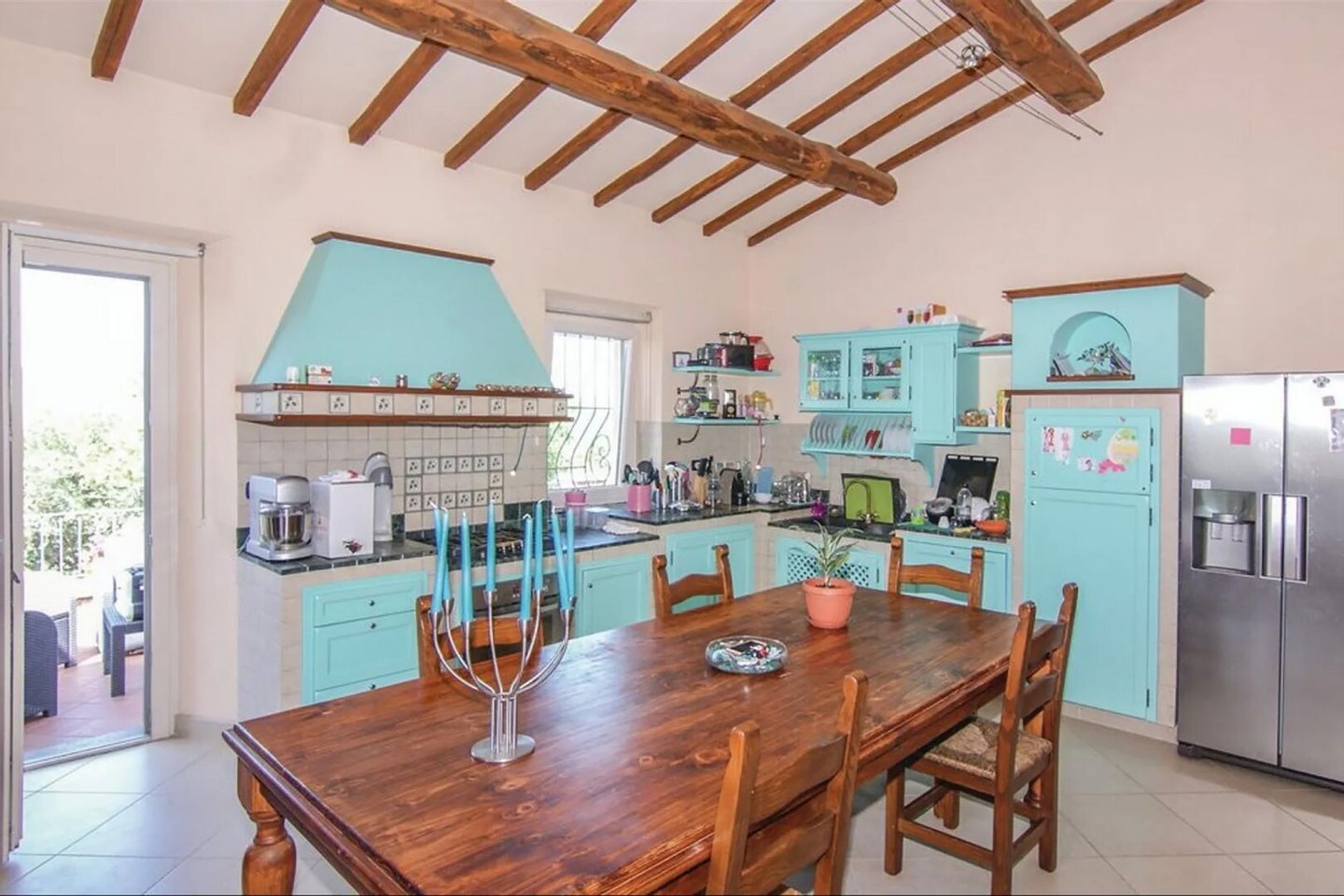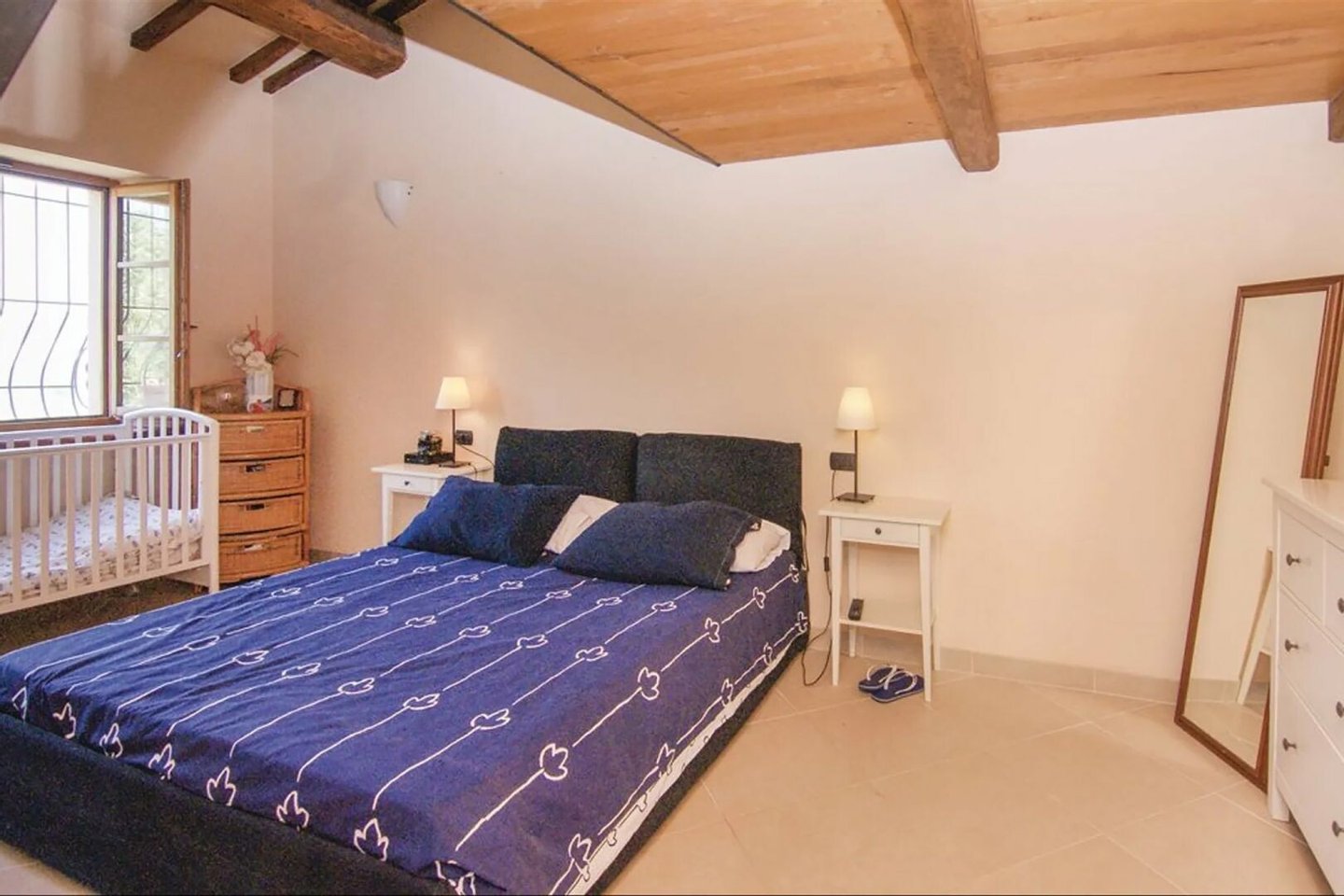 Obergeschoss, 120 qm: Wohnzimmer von 50 qm mit Kamin, Küche von 30 qm mit Zugang zur Terrasse, 2 Schlafzimmer, 2 Bäder, Mezzanin, überdachte Terrasse mit Glastür