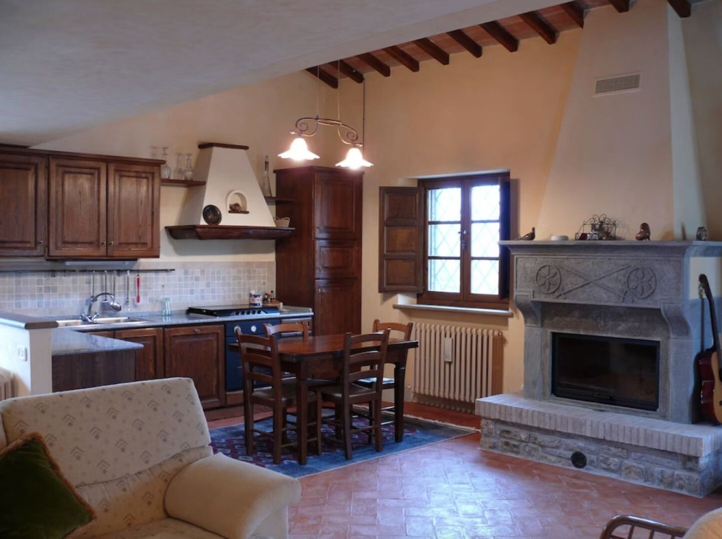 2. HAUSHALT: eine Wohnung im Erdgeschoss mit einer großen Suite mit Bad, ein Wohnzimmer mit friesiertem Kamin, eine offene Küche aus massivem Kastanienholz, ein Zwischengeschoss mit einem reizenden kleinen Wohnzimmer mit Oberlicht und Treppe aus Pietra Serena und Eisen, eine große Suite mit Bad im ersten Stock mit einer schönen Außentreppe aus Stein mit Panoramabalkon für einen unabhängigen Eingang
