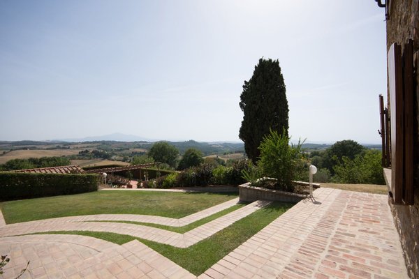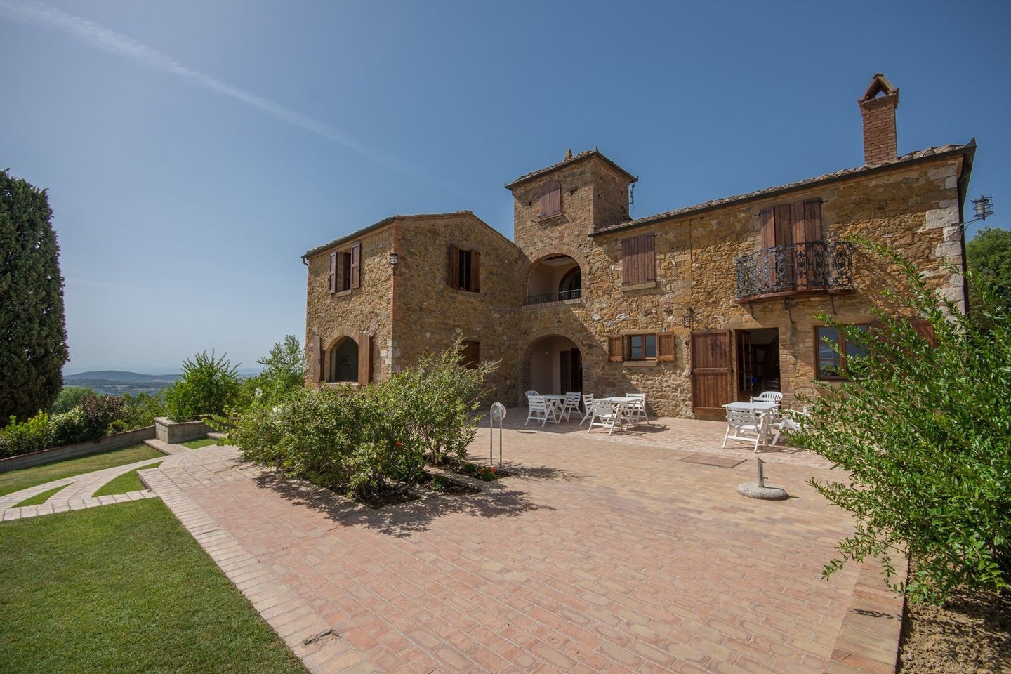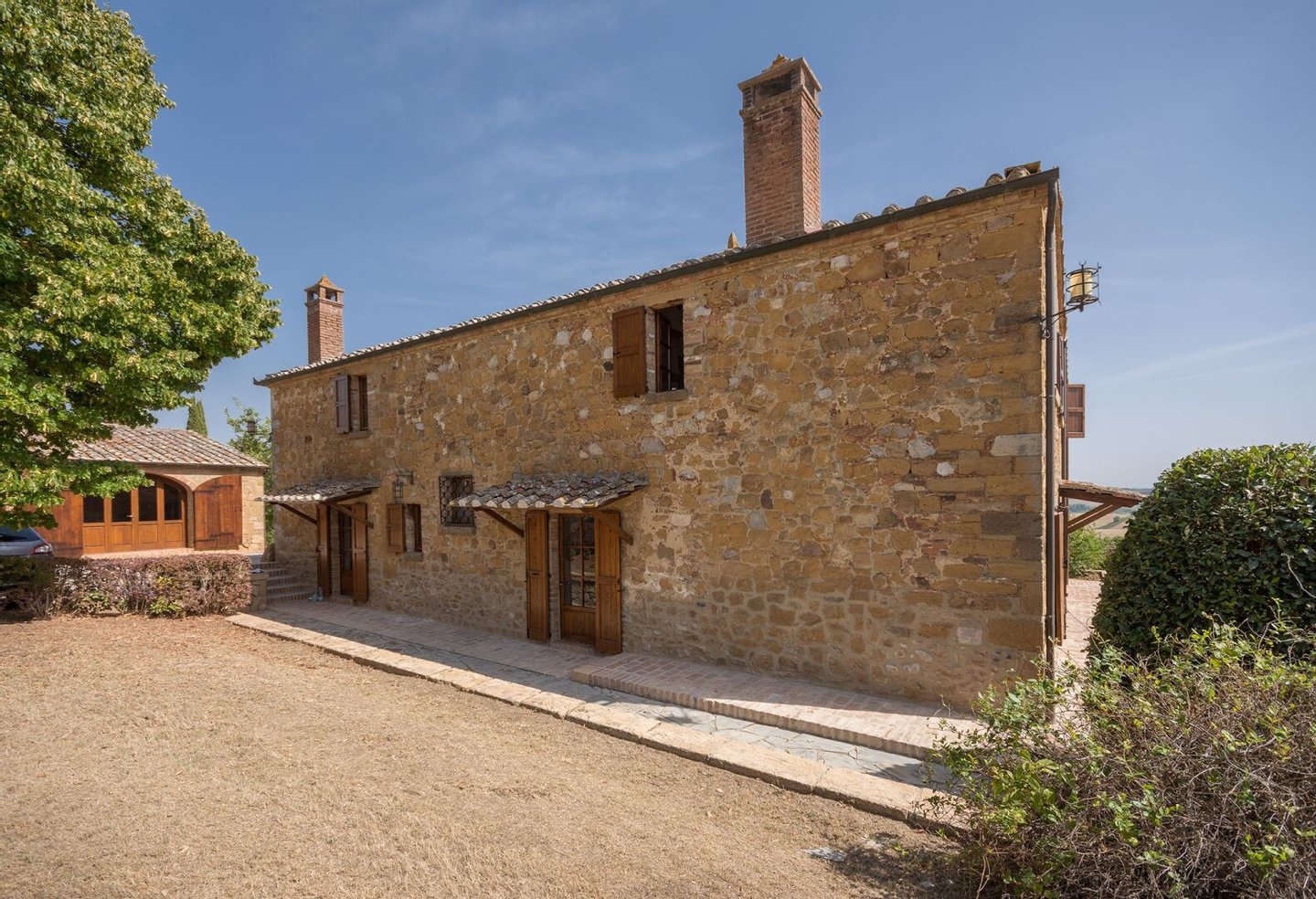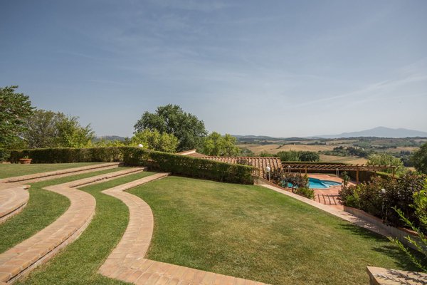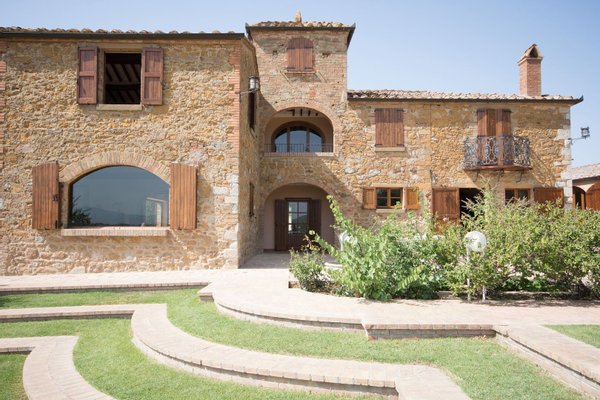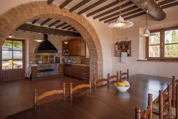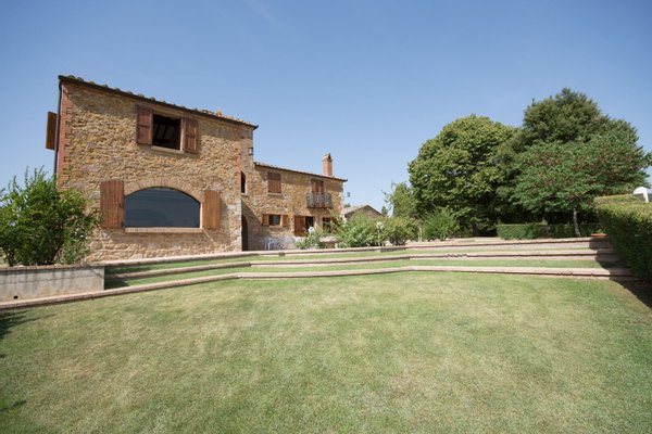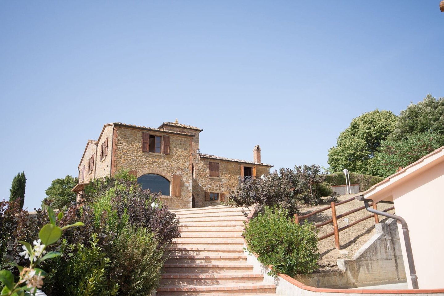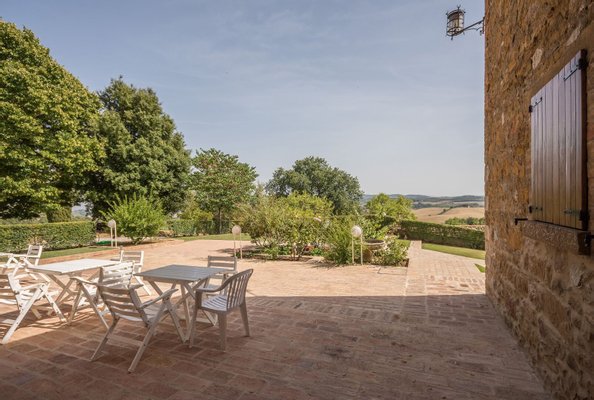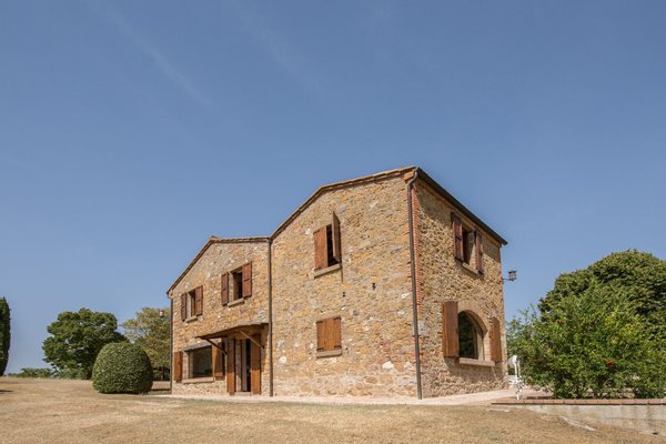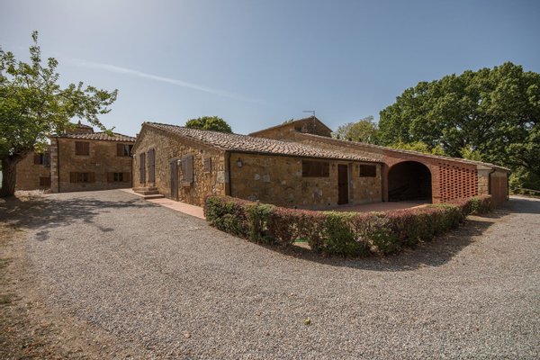 Renoviertes Bauernhaus aus dem 19. Jahrhundert mit zwei Nebengebäuden, Garten mit Schwimmbad, Nebengebäuden und Ackerland zwischen Pienza und Montepulciano, Siena, zu verkaufen. Zwischen dem Val d'Orcia und dem Valdichiana, südlich von Siena, in den Hügeln zwischen Pienza und Montepulciano, auf 3,8 Hektar privatem Land, ist Casale Montecchi ein ehemaliges Bauernhaus aus dem 19. Jahrhundert auf zwei Ebenen mit Steinfassaden, renoviert im Jahr 2017 unter Beibehaltung der Loggien, Bögen und einem kleinen Turm auf dem Dach und beherbergt eine elegante Residenz im rustikalen toskanischen Stil mit Wohnräumen mit Kaminen, freiliegenden Holzbalkendecken und majestätischen Ziegelbögen. Alle Einbauten sind aus traditionellem Holz und haben Doppelverglasung, jedes Zimmer hat viel natürliches Licht und große Fenster bieten einen Panoramablick auf den Garten und die sanften Hügel der sienesischen Landschaft. Im ersten Stock gibt es ein Hauptschlafzimmer mit Zugang zu einem Balkon, ein komplett mit Marmor verkleidetes Bad mit Doppelwaschbecken, Badewanne und Dusche, eine Garderobe, drei weitere Schlafzimmer und zwei Bäder. Der gleiche rustikale Stil wurde für die beiden Gästewohnungen gewählt, eine davon mit direktem Zugang zum Pool, beide mit zwei Zimmern, großen Öffnungen und Kaminen. Der Garten wurde mit Ziegeln und Rasenterrassen angelegt, die über Stufen zum Pool führen. Ein Schuppen/Garage von über 100 Quadratmetern, ein zweites landwirtschaftliches Nebengebäude für die Lagerung, ein Brunnen und ein Olivenhain vervollständigen Casale Montecchi, ein bezaubernder Ort in ruhiger und zurückhaltender Lage, aber in der Nähe aller wichtigen Kunstzentren und Dienstleistungen, ideal für das Leben mit Familie und Freunden oder für kurze touristische Vermietungen und die Beherbergung von Reisenden aus der ganzen Welt für ihren Urlaub.