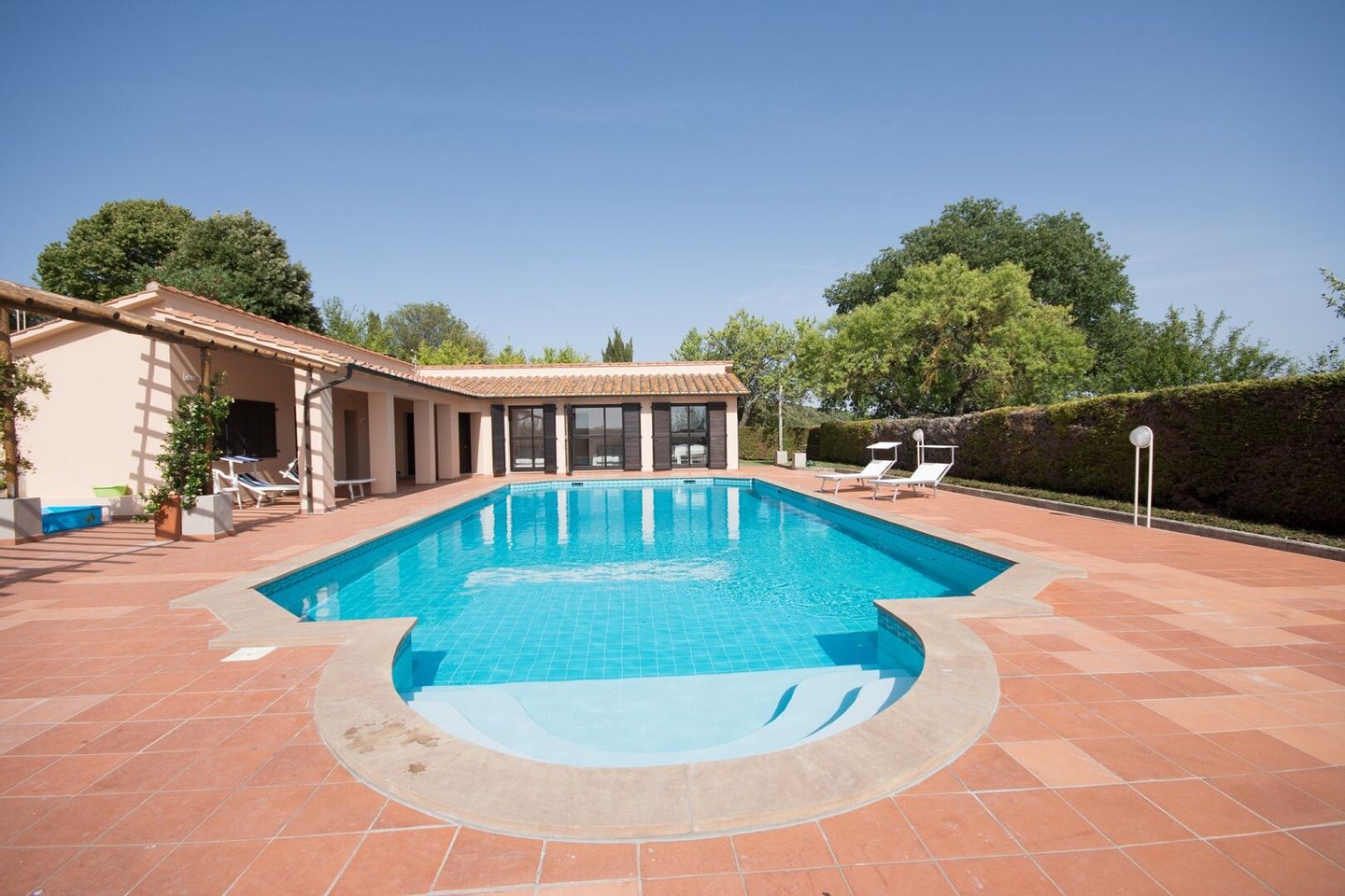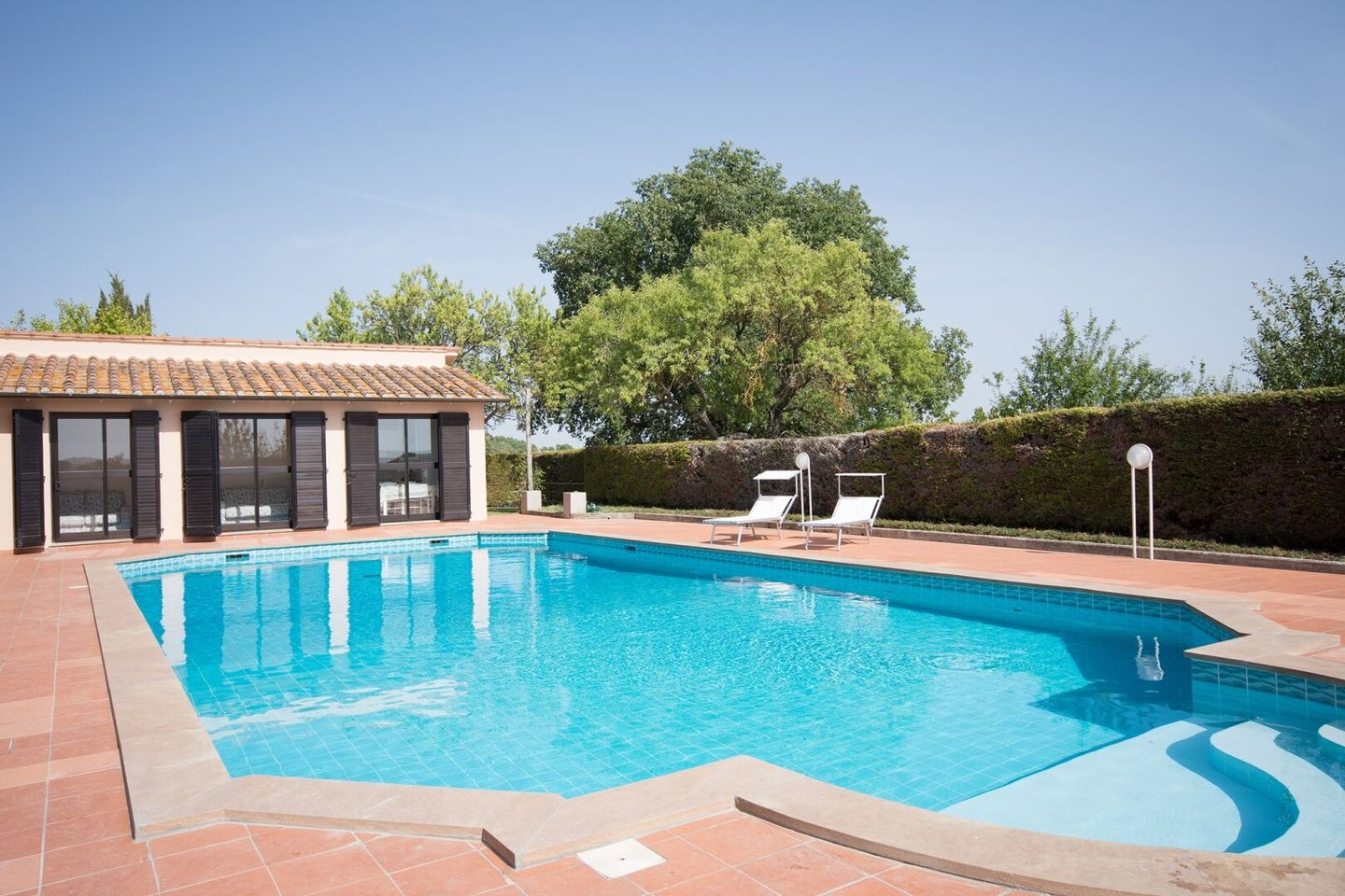 Dependance 2 von 84 qm auf einer Ebene: Eingang, Esszimmer, Küche, Abstellraum, 2 Schlafzimmer, 1 Bad, Pool-Service-Räume
