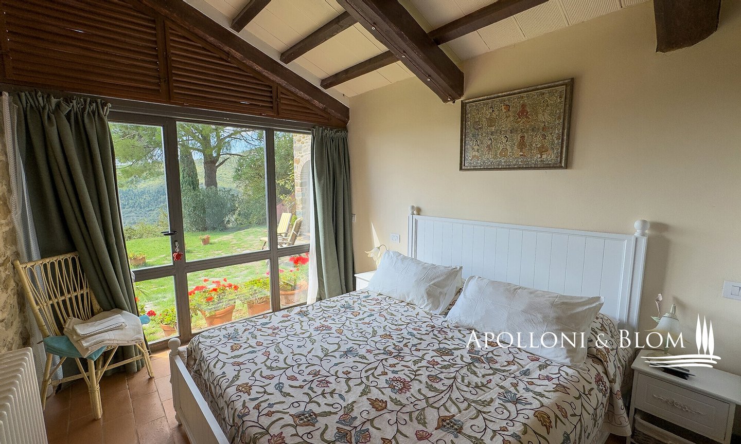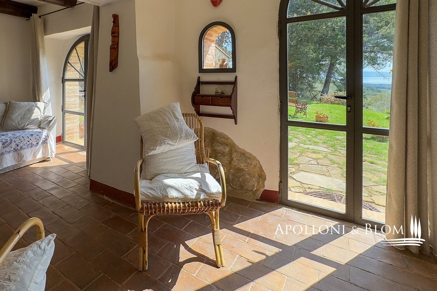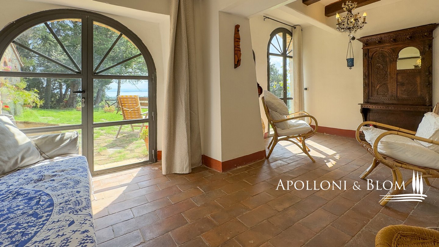 Mit freiem Blick auf den See, Landhaus mit 5 Schlafzimmern, Gästeanbau, Schwimmbad, Garten mit Rosengarten, Olivenhain, zu verkaufen in Tuoro sul Trasimeno, Perugia. Traditionelle Zimmer im rustikalen Stil mit spektakulärem Panoramablick auf den See,