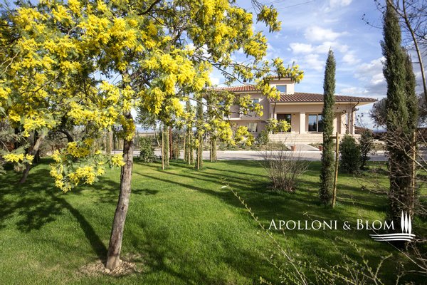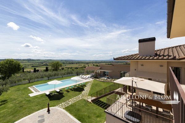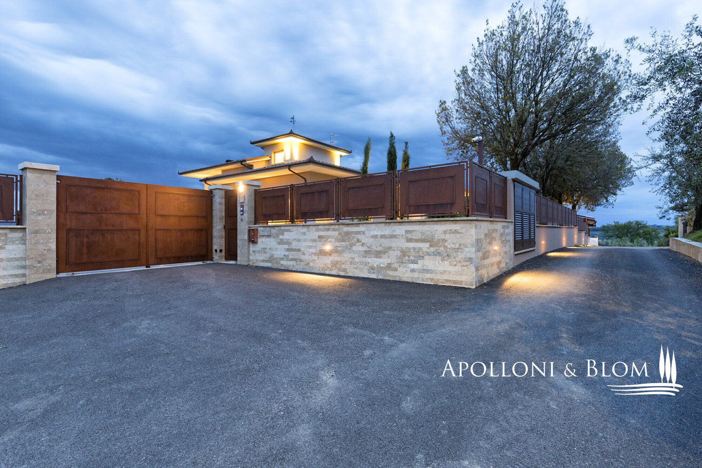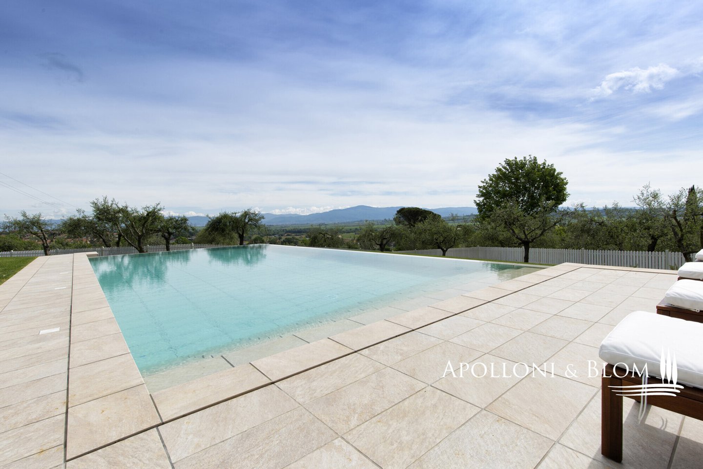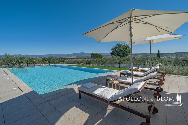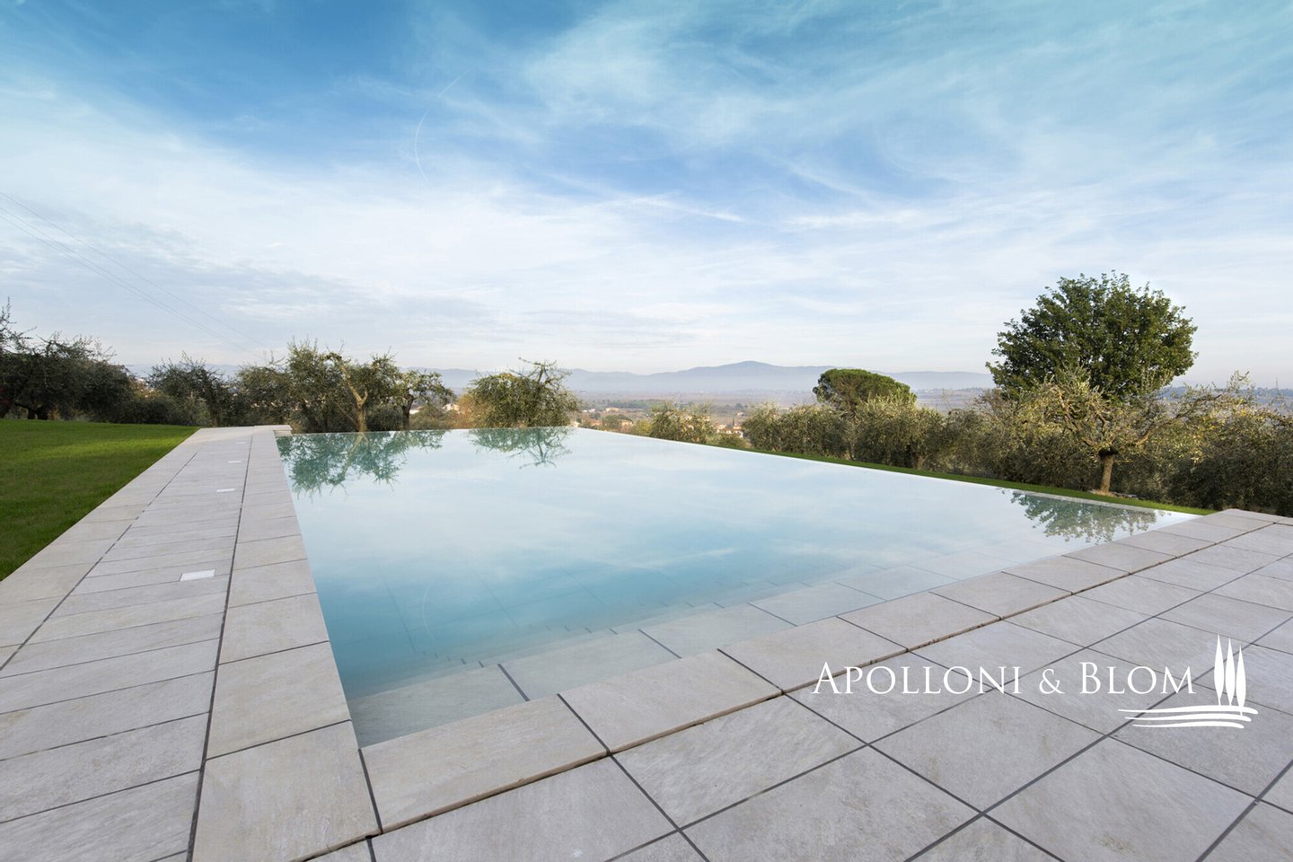 Ruhig gelegene Luxusvilla A4 mit Nebengebäude, Schwimmbad, Photovoltaikanlage und Olivenhain in Foiano della Chiana zu verkaufen. In einer der aussichtsreichsten und reserviertesten Gegenden des Val di Chiana, verbindet diese prestigeträchtige Luxusvilla zum Verkauf in Foiano della Chiana Eleganz, Komfort und Nachhaltigkeit. Das 2019 mit modernsten Technologien errichtete Anwesen ist mit einer 10,8-kW-Photovoltaikanlage und einer 8-kW-Solarthermieanlage für die Erzeugung von Strom und Warmwasser ausgestattet, die maximale Energieeffizienz und Autonomie garantieren. Die auf drei Ebenen verteilte Villa mit einer Gesamtfläche von etwa 820 Quadratmetern verfügt über eine sehr hochwertige Ausstattung: massive Eichen- und Travertinböden, Fußbodenheizung mit Wärmepumpen und Pelletöfen, kontrollierte mechanische Belüftung, Fensterrahmen aus Eiche und Aluminium mit Dreifachverglasung, motorisierte Innenrollläden, fortschrittliche Haustechnik, Videoüberwachungssystem mit Außenkameras und doppelte Alarmanlage. Im Außenbereich wird die Villa durch einen 12x6 m großen Infinity-Pool mit rutschfester Sonnenterrasse, einen perfekt gepflegten Garten von ca. 4.000 m² mit automatischem Bewässerungssystem und einen 3 ha großen Olivenhain mit ca. 3.000 Bäumen, der ebenfalls mit Tropfbewässerung ausgestattet ist, bereichert. Die Lage mit freiem Blick auf etwa 80 Kilometer toskanische Landschaft garantiert Privatsphäre und natürliche Schönheit. Das Anwesen wird durch ein unabhängiges 60 Quadratmeter großes Nebengebäude vervollständigt, das ideal für Gäste oder Personal ist, sowie durch einen Wellnessbereich mit Jacuzzi und türkischem Bad, eine 75 Quadratmeter große Garage und zahlreiche Nebenräume. Nur 900 Meter von den wichtigsten Dienstleistungen entfernt und mit perfekter Anbindung an die bekanntesten touristischen Zentren der Toskana und Umbriens, stellt diese Villa eine exklusive Lösung dar, die sich sowohl als prestigeträchtige Privatresidenz als auch als Beherbergungsbetrieb auf hohem Niveau eignet.