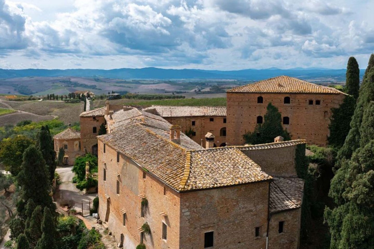 Außergewöhnliche Aussicht, Schloss aus dem 14. Jahrhundert mit Nebengebäuden, Privatkirche, zu restaurieren mit genehmigtem Projekt, in der Nähe von Montalcino zu verkaufen. Ein mittelalterliches Juwel von ca. 3900 Quadratmetern mit unglaublichem