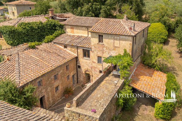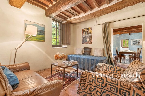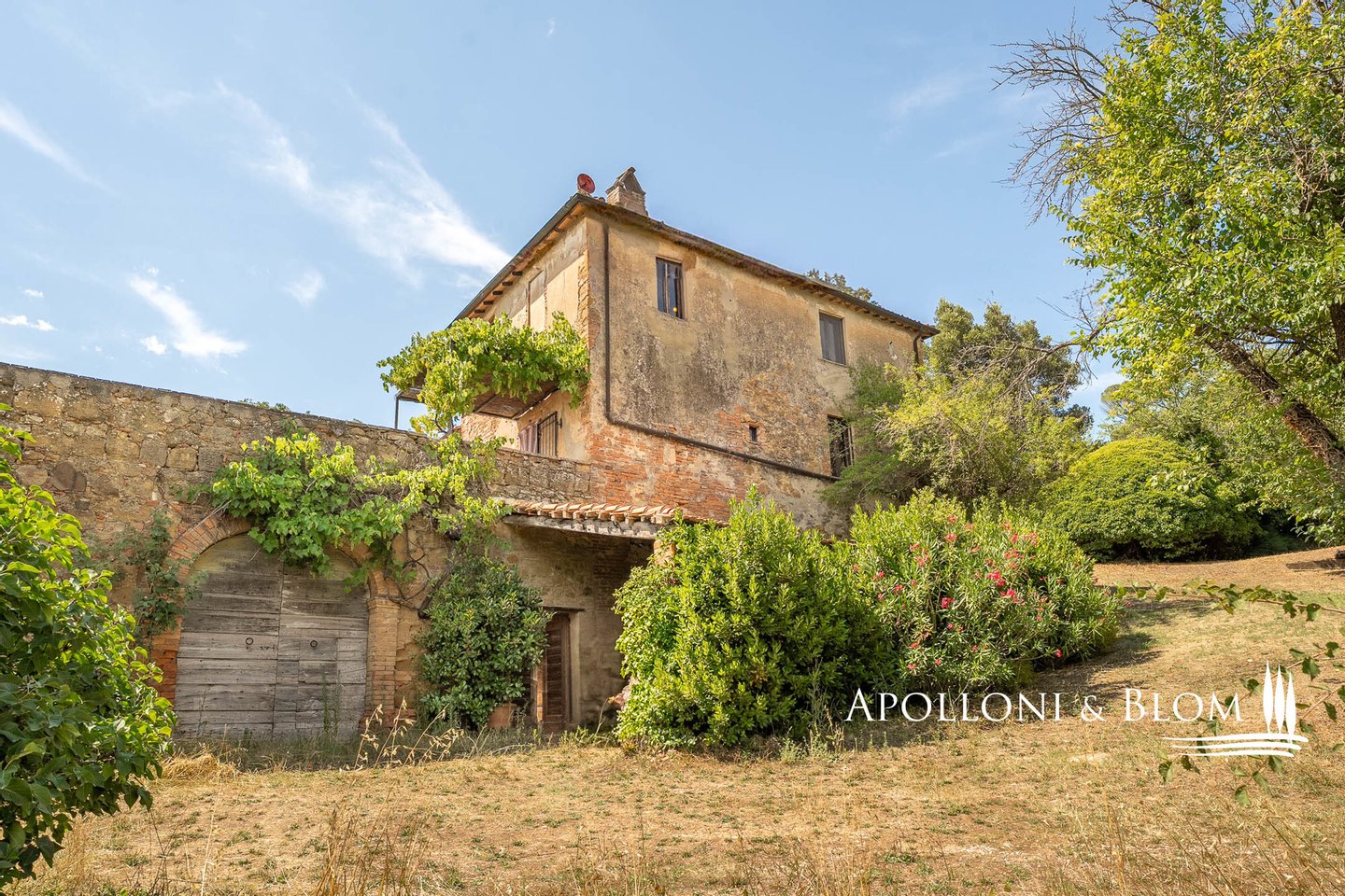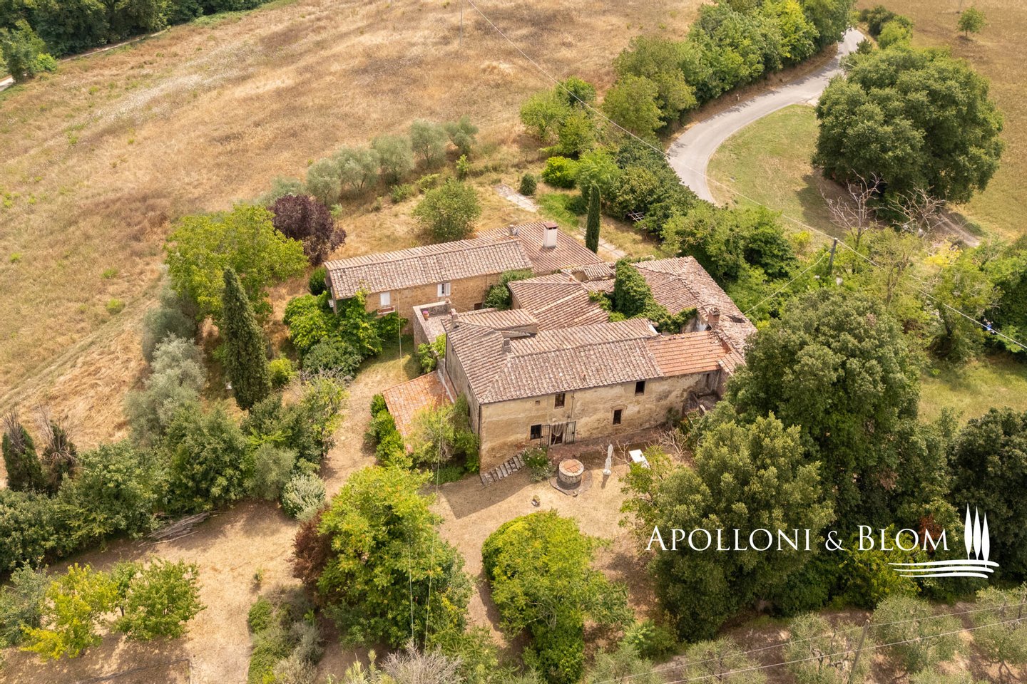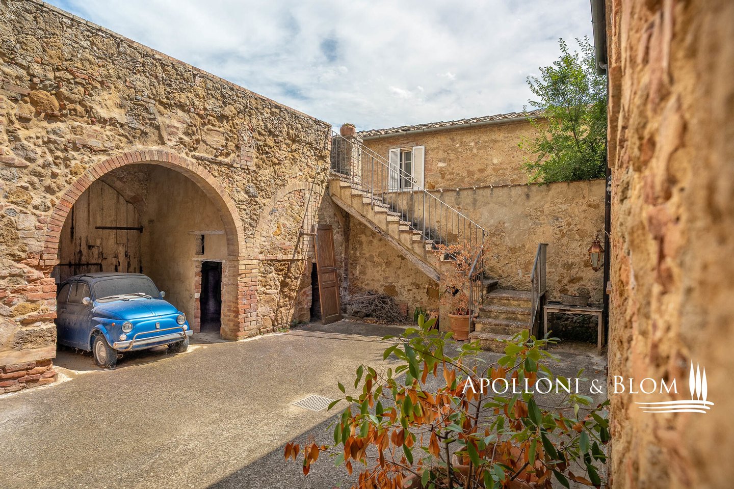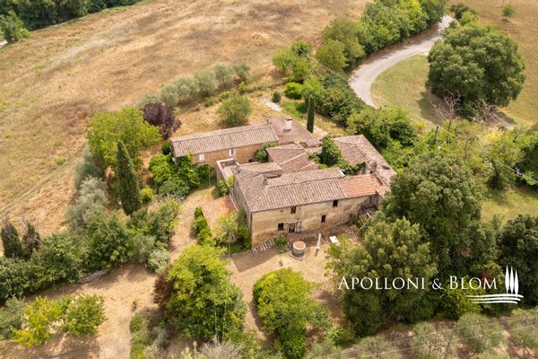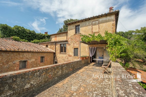 Bauernhaus mit schönem Innenhof, Terrasse und Olivenhain bei Trequanda, Siena - Toskana. Versteckt unter dem Hügel von Castelmuzio, umgeben von Bäumen und windgeschützt, mit offenem Blick nach Süden, ist dieses Bauernhaus ein wahres Juwel für seine gegliederte Struktur, seine komfortablen Innen- und Außenräume und für die authentische Atmosphäre, die trotz der jüngsten, minimalen Restaurierung erhalten wurde. Am Ende eines kurzen Stücks unbefestigter Straße empfängt uns das Bauernhaus, das auf drei Seiten frei ist, durch eine alte Holztür, die in einen schönen Hof führt, in dem sich der Haupteingang und die Räume für die landwirtschaftliche Nutzung befinden. Über eine schöne Treppe aus lokalem Travertin gelangt man in den ersten Stock, wo sich der Wohnbereich mit einem großen Wohnzimmer und einer Küche mit einem wunderschönen antiken Kamin befindet, von wo aus man auf die Terrasse gelangt, die eine ganze Seite des Hofes einnimmt und von der aus man ein wunderschönes Panorama und die Sonne genießen kann, die diese Seite des Anwesens den ganzen Tag über küsst. Ein Arbeitszimmer und ein intimes Wohnzimmer vervollständigen diese Ebene. Im Obergeschoss befinden sich drei Schlafzimmer und ein Badezimmer, in denen die Familie und Freunde untergebracht werden können, in einem authentischen Ambiente, in dem man sich das Landleben einer längst vergangenen Zeit vorstellen kann. In einem Flügel des Anwesens befindet sich eine unabhängige Zwischengeschosswohnung mit direktem Zugang zum Innenhof, die mit einer Kochnische, einem Badezimmer, einem Doppelzimmer und einem Arbeitszimmer ausgestattet ist. Der Außenbereich wird durch einen vom Hauptgebäude abgetrennten Anbau bereichert, in dem ein perfekt funktionierender Ofen und ein Holzschuppen untergebracht sind, sowie durch einen Brunnen zum Sammeln von Regenwasser und einen an das Gebäude angelehnten Schuppen, in dem sich derzeit zwei Wasserzisternen befinden. Ringsherum schmücken aromatische Pflanzen, Glyzinien, Flieder und Olivenbäume den Außenbereich und verströmen angenehme Düfte. Dieses Bauernhaus ist die perfekte Lösung für diejenigen, die in das authentische Landleben eintauchen und seine Privatsphäre genießen oder es mit Freunden und Verwandten teilen möchten, mit der Möglichkeit, den gesamten Komplex zu kaufen (Anzeigen TRQ3109 und TRQ3106).