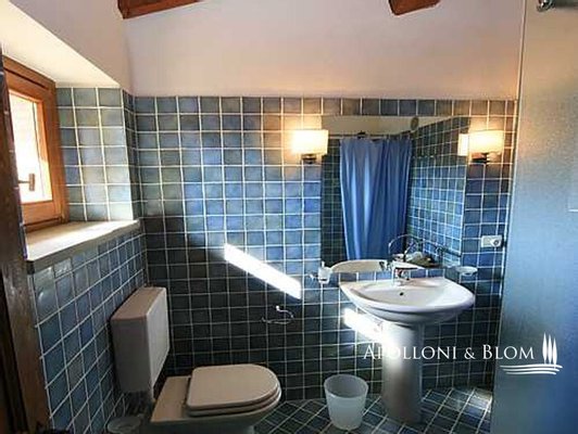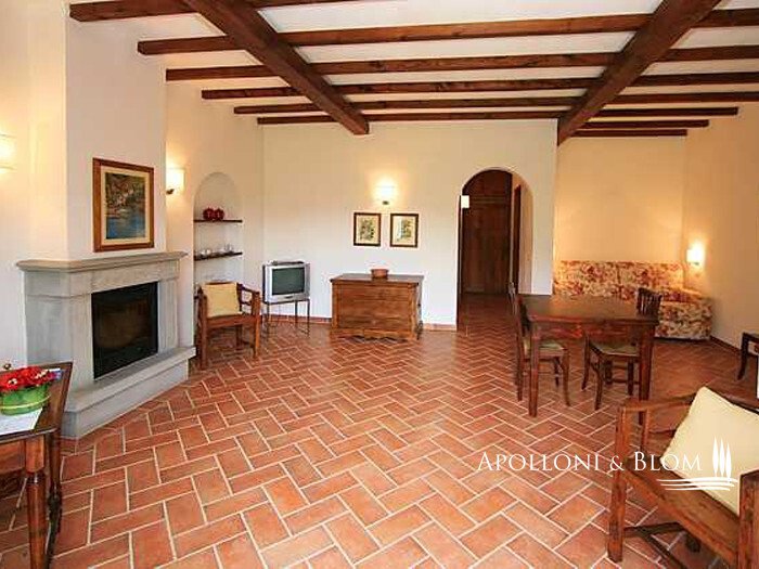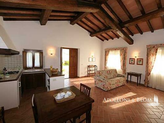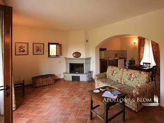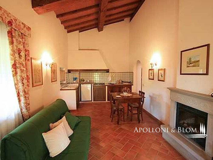 Zweites Bauernhaus La Chiesina, ca. 160 m² groß, 2004/2005 komplett umgebaut, in der Nähe des Eingangstors gelegen, mit 2 Wohnungen, bestehend aus einem Wohnzimmer mit Kamin, gemauerter Küchenzeile, 1 Schlafzimmer und 1 Bad mit Dusche