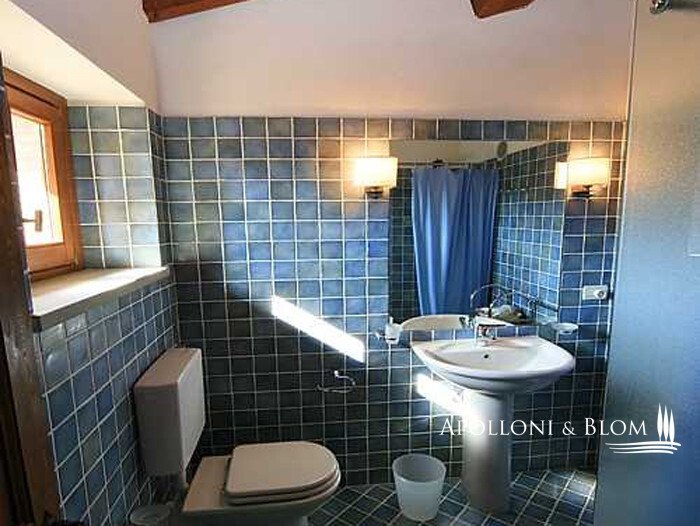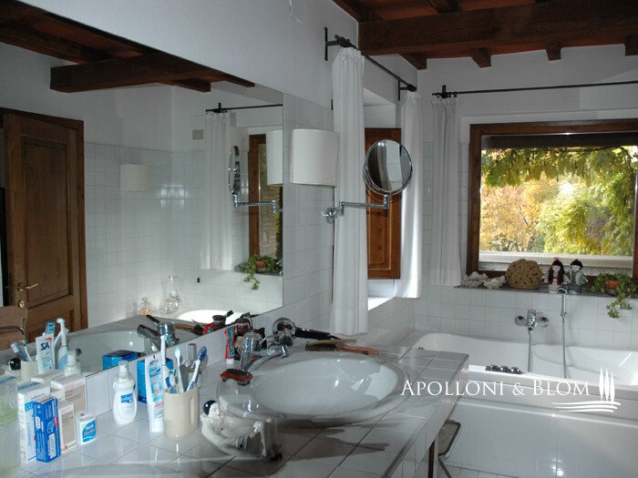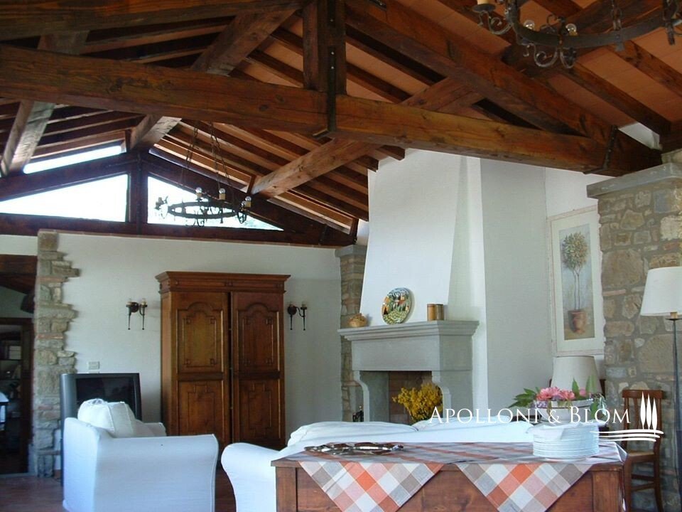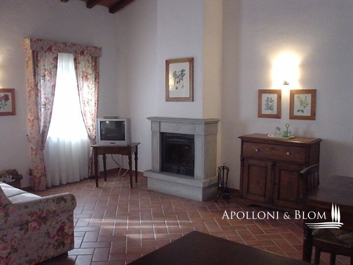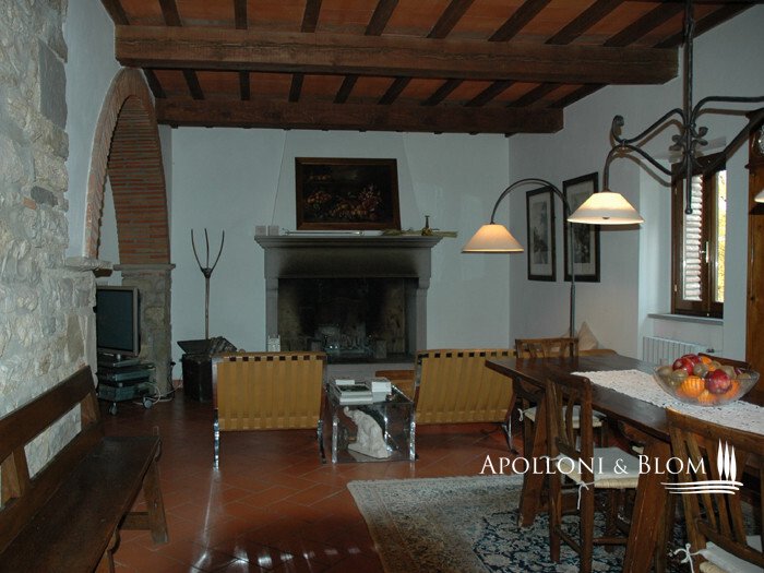 Obergeschoss: Wohnung von 100 qm auf zwei Etagen, im Erdgeschoss Wohn-/Esszimmer mit Eckkamin aus Pietra Serena für Heizung in allen Räumen, gemauerte Kochnische, Zugang zu 35 qm Terrasse, 1 Bad Im ersten Stock: 2 Doppelschlafzimmer, 1 Badezimmer