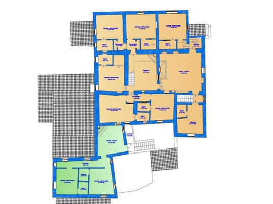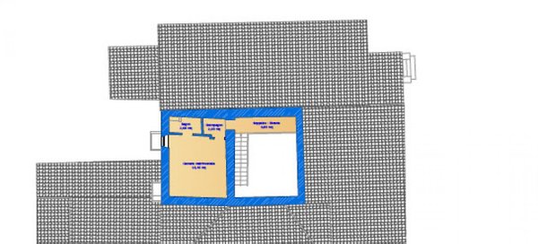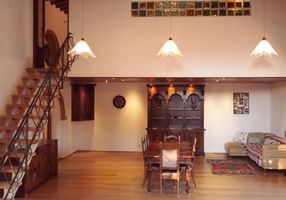 Wohnung 5 - mit doppeltem Zugang, sowohl von der Innen- als auch von der Außentreppe, umfasst ein Wohnzimmer mit Kamin, ein Esszimmer mit Küche und Kamin, 7 Schlafzimmer mit eigenem Bad, 2 davon mit Panoramabalkon. Vom Wohnzimmer aus gelangt man in den zweiten Stock, in dem sich ein weiteres Schlafzimmer mit Bad befindet