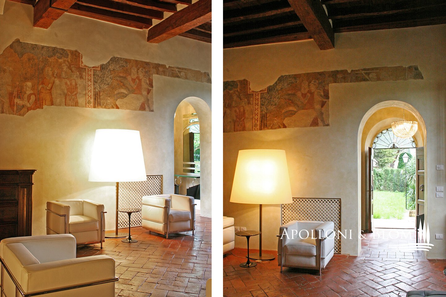 Zeitlose Eleganz zwischen Kunst und Geschichte, Teil einer Landvilla mit Fresken, feinen Oberflächen, Garten, zu verkaufen in der Gegend von Castello in Florenz. Vor den Toren des ersten Hügels im Norden von Florenz, in einem ländlichen Wohngebiet,