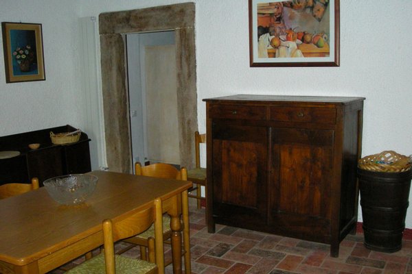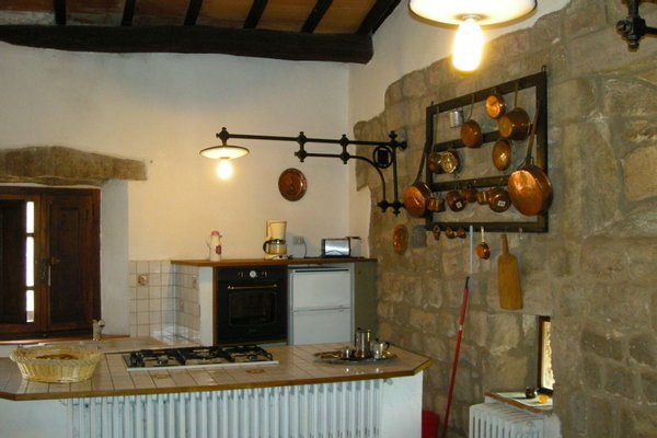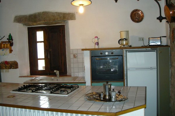 Erster Stock: Eingang zum Wohnzimmer, Küche mit Kamin, Schlafzimmer, Badezimmer