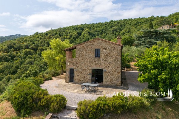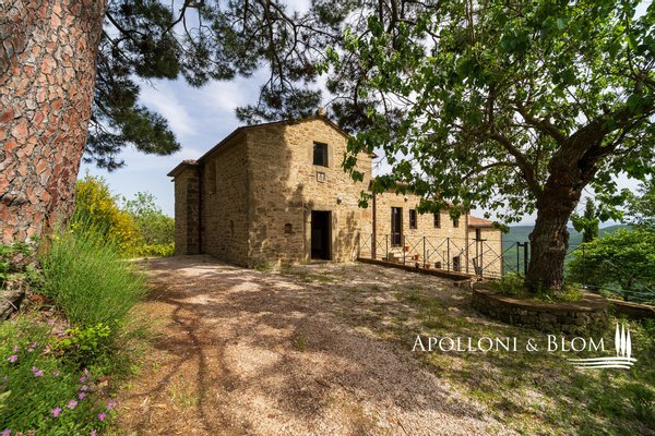 Steinkloster aus dem 18. Jahrhundert mit ehemaliger Kirche, renoviert mit Schwimmbad, Garten und Gästehaus zu verkaufen mit Grundstück in Lisciano Niccone. Auf 500 m ü.d.M., in einer hügeligen Lage, die die Landschaft um den Trasimenischen See dominiert, in einem privaten Park von 3 Hektar mit Wäldern und Olivenhainen, hat eine kürzliche Renovierung ein altes Kloster mit schönen Steingebäuden von insgesamt 612 qm wieder zum Leben erweckt. Das Haupthaus ist mit der alten Kirche durch eine über 7 m hohe Holzbalkendecke verbunden und wurde in einen majestätischen 100 m² großen Saal umgewandelt, während die alte Krypta, die in den Felsen gegraben wurde, heute einen Weinkeller zur Lagerung von Weinen beherbergt. Authentische Elemente in Kombination mit modernster Ausstattung schaffen eine einzigartige Atmosphäre mit Bögen, Steinwänden, Kaminen, Terrakottaböden und Holzeinbauten. Im Erdgeschoss grenzt der Wohnbereich an den Garten und die Terrassen und umfasst ein Wohnzimmer mit Kamin, eine Küche, ein Arbeitszimmer, ein Badezimmer und eine Waschküche. Vom großen Eingangsbereich aus gelangt man über eine zentrale Treppe in das Obergeschoss, in dem sich vier Schlafzimmer und drei Bäder befinden. Der Garten bietet einen Panoramablick und beherbergt einen terrassenförmig angelegten Swimmingpool mit Sonnenterrasse. Etwas getrennt von der Hauptvilla befindet sich ein Gästehaus mit eigener Zufahrt und privatem Garten, das komplett im rustikalen Stil renoviert wurde und über drei Schlafzimmer und drei Bäder verfügt. In einer privaten Umgebung, mitten auf dem Land, aber in der Nähe von allen Geschäften und Dienstleistungen, elegant restauriert und bereit zu leben, ist das Anwesen ideal als Familienhaus oder um Reisende für ihren Urlaub zu beherbergen.