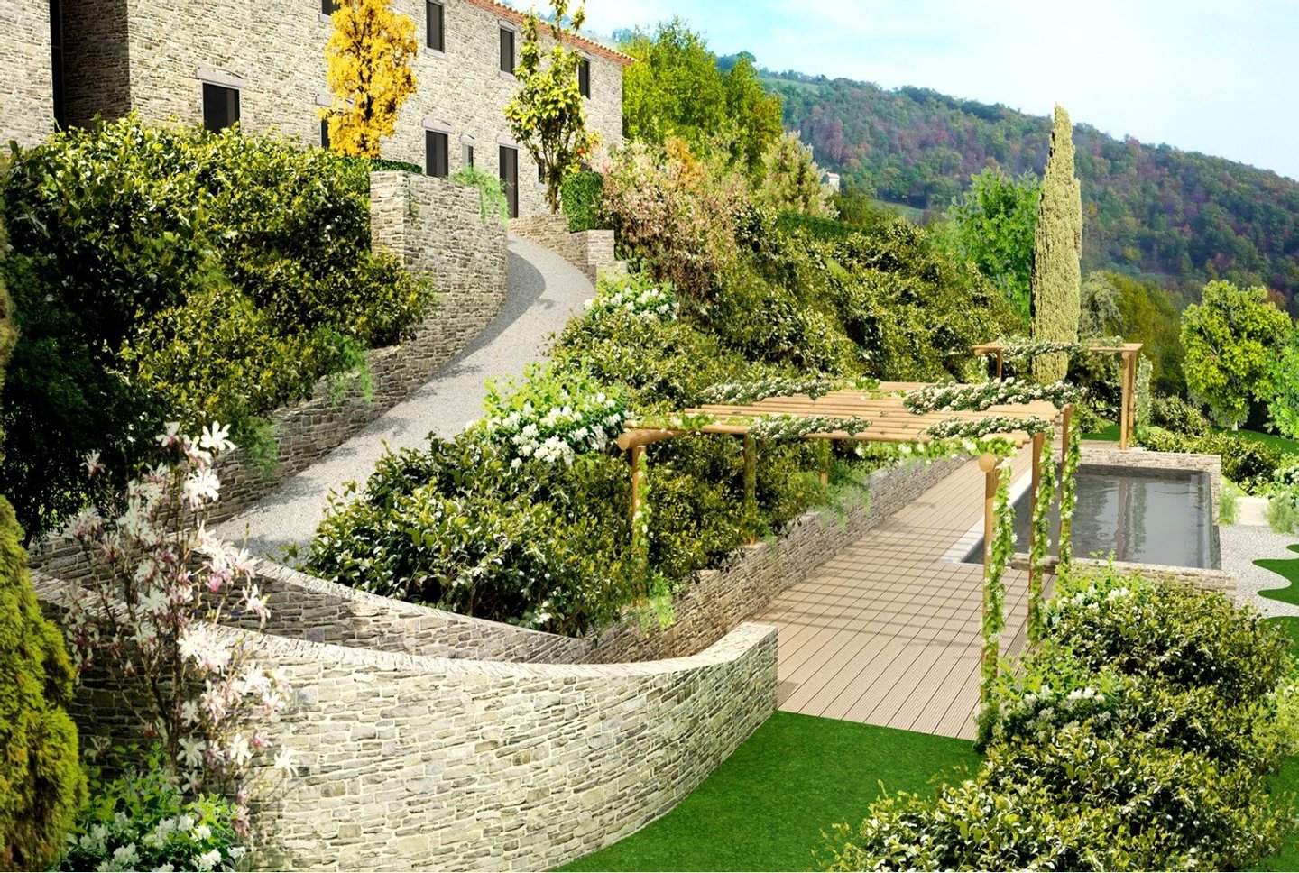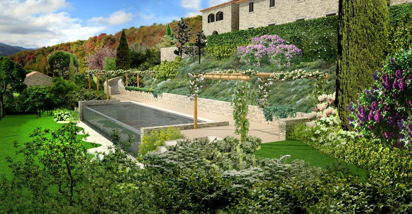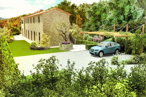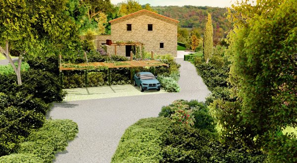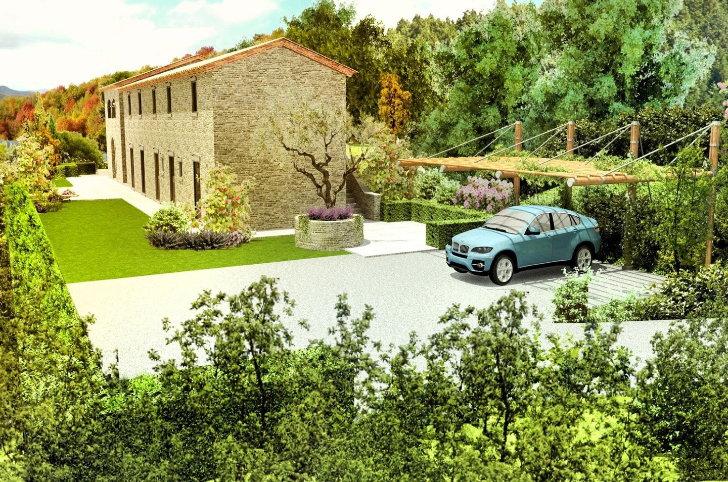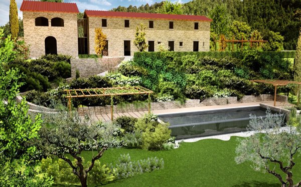 Land: Ungefähr 2,5 Hektar Land, das bereits für die Anlage des Gartens und des Swimmingpools nach dem Projekt eines bekannten Landschaftsarchitekten vorbereitet ist.