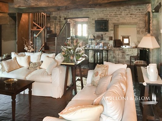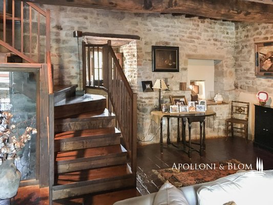 Erster Stock, mit Zugang von außen und innen: zentrales Wohnzimmer mit großem Kamin, Küche, weiteres Wohnzimmer mit Steinkamin, 2 Schlafzimmer, Badezimmer