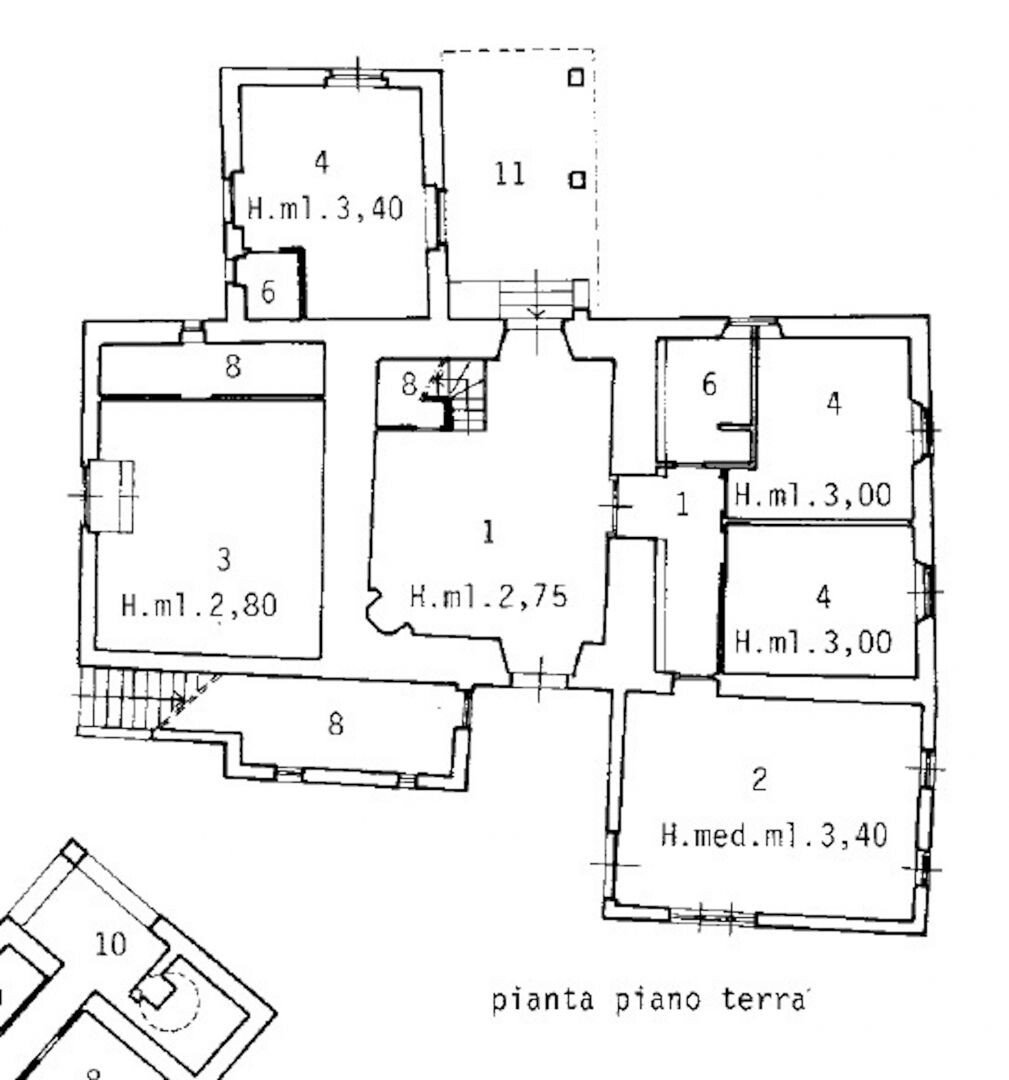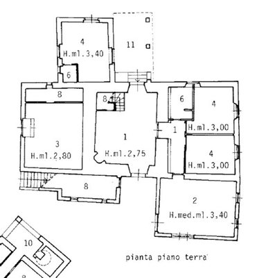 Typ: Anwesen von 1160 qm brutto insgesamt bestehend aus Haupthaus auf drei Ebenen von ca. 637 qm, Dependance auf zwei Ebenen von 70 qm brutto, Anhang von 86 qm brutto plus Veranda von 60 qm brutto. Werkzeugschuppen von 307 qm brutto, mit Land und Schwimmbad.