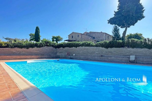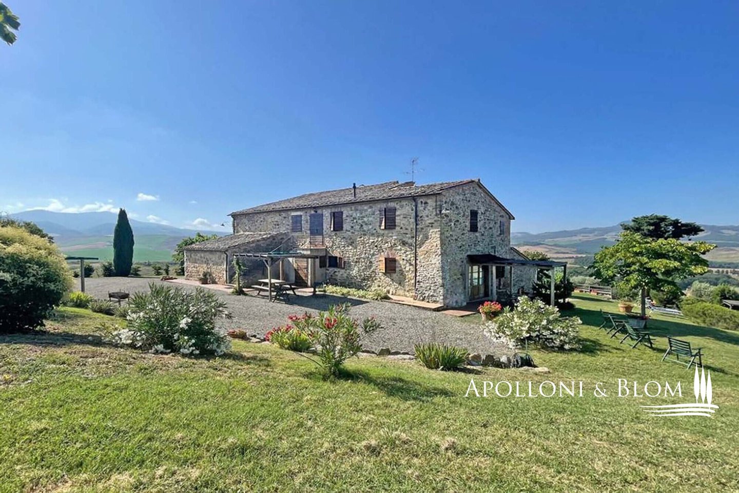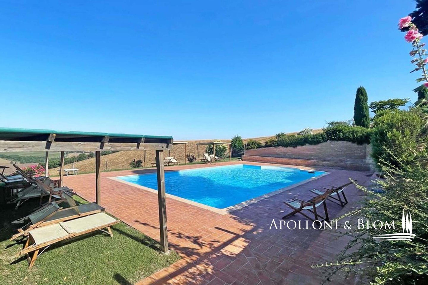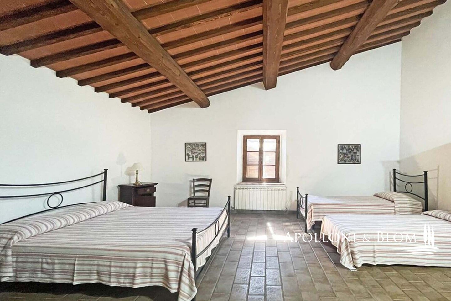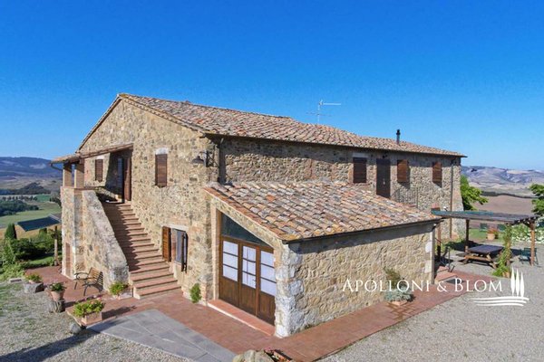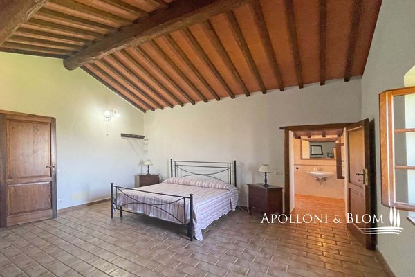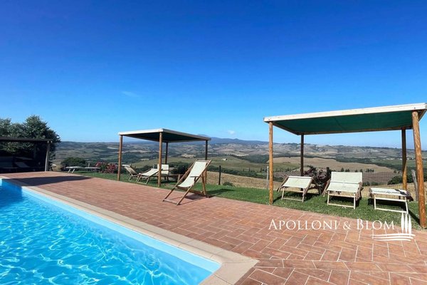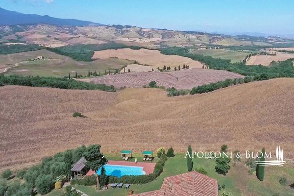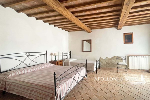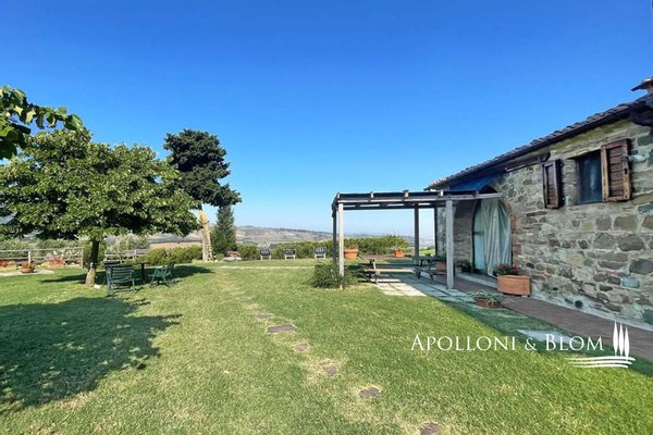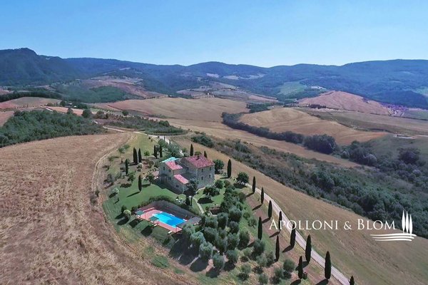 In den toskanischen Hügeln, in einer privilegierten Lage, ein Bauernhof mit weitem Panoramablick, Land und Schwimmbad in der Nähe von Sarteano, Siena - Toskana. Es handelt sich um ein Bauernhaus mit Schwimmbad, das auf zwei Ebenen in fünf unabhängige Wohnungen von 496 Quadratmetern aufgeteilt ist, die alle gut eingerichtet und sehr geräumig sind und mit allem Komfort ausgestattet sind, wobei der rustikale toskanische Stil respektiert wird, sowie 160 Hektar Land. Das Bauernhaus mit seiner gegliederten Form und Steinstruktur stammt aus dem 18. Jahrhundert und wurde um das Jahr 2000 herum fachmännisch restauriert, wobei die ursprünglichen Merkmale sowohl in Form als auch in Material erhalten wurden. Das Dach wurde ordnungsgemäß isoliert. Das Anwesen, ca. 6 km von der nächsten Stadt und ca. 20 km von Pienza entfernt, erreicht man nach ca. 1 km Fahrt über eine unbefestigte Straße in gutem Zustand. Die Fassaden sind aus Stein und Sichtmauerwerk, die Innenböden aus Holzbalken und Terrakottafliesen. Der Stall wurde ebenfalls restauriert, seine Decken weisen typische Gewölbe auf, und die alte Krippe ist heute eine reizvolle Sitzbank. In diesem Landhaus gibt es auch eine Außentreppe aus Stein, die in der typischen Loggia endet. Die Einrichtungsgegenstände sind aus edlem Kastanienholz, und die Heizung wird mit Flüssiggas betrieben. Im gepflegten Garten befindet sich ein Panoramaschwimmbad mit Blick auf das Val d'Orcia und den Monte Amiata, der sich in seiner ganzen Pracht am Horizont abzeichnet, mit römischer Treppe, Hydromassage und großer gepflasterter Sonnenterrasse. Mit seiner großzügigen Fläche und der unvergleichlichen Aussicht ist das Bauernhaus ein beneidenswertes Feriendomizil in einem der schönsten Täler der Welt.