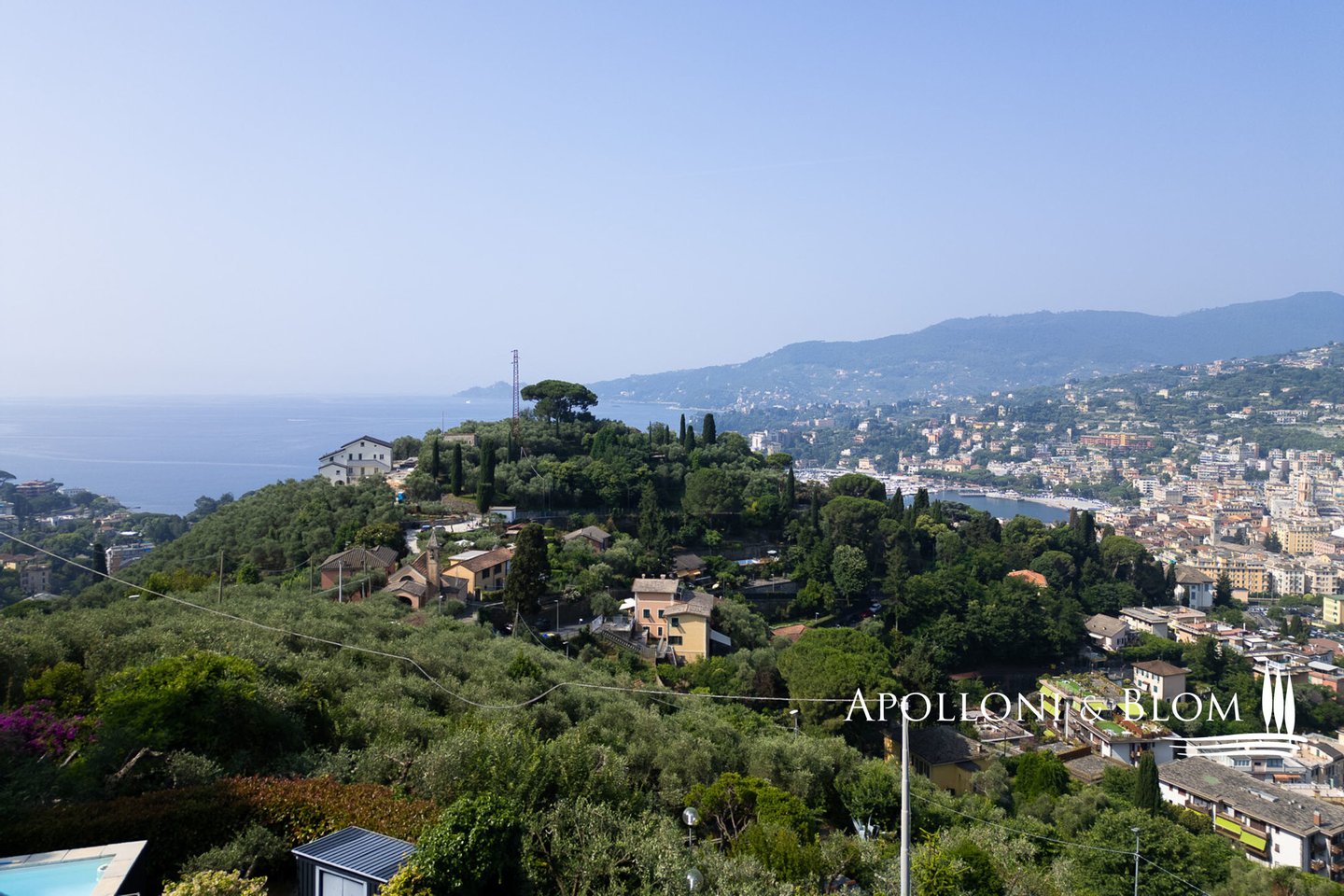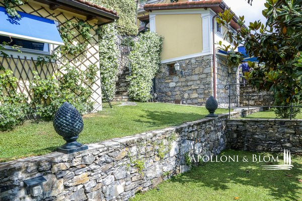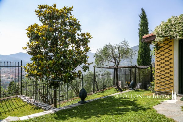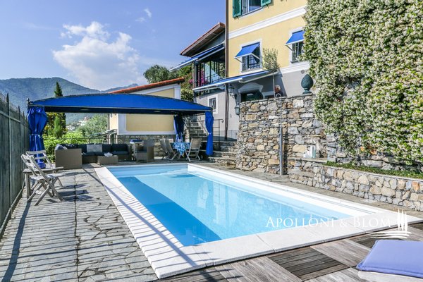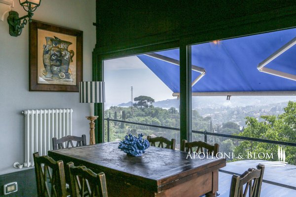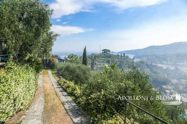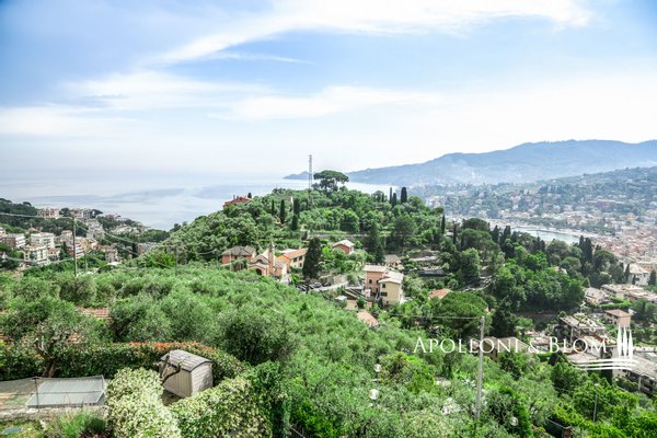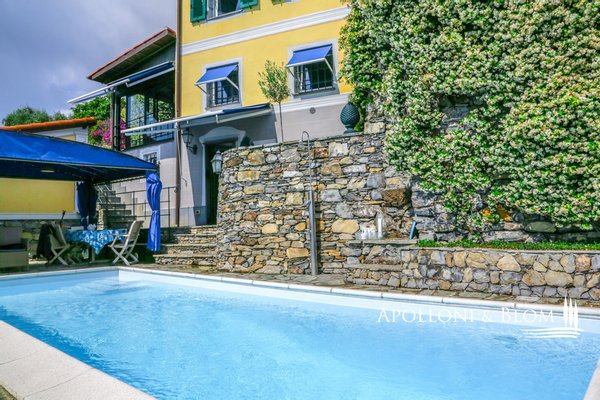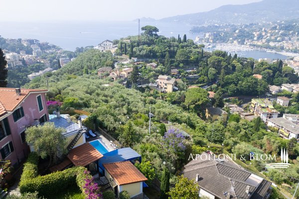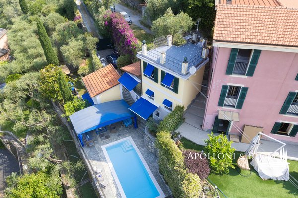 Mit Blick auf den Golf von Portofino, in perfektem ligurischen Stil auf drei Ebenen mit Terrassen, Schwimmbad, Garten und Abhängigkeit zu verkaufen in der Nähe von Rapallo. Eingebettet auf den ersten Hügeln von Rapallo, in einer der begehrtesten