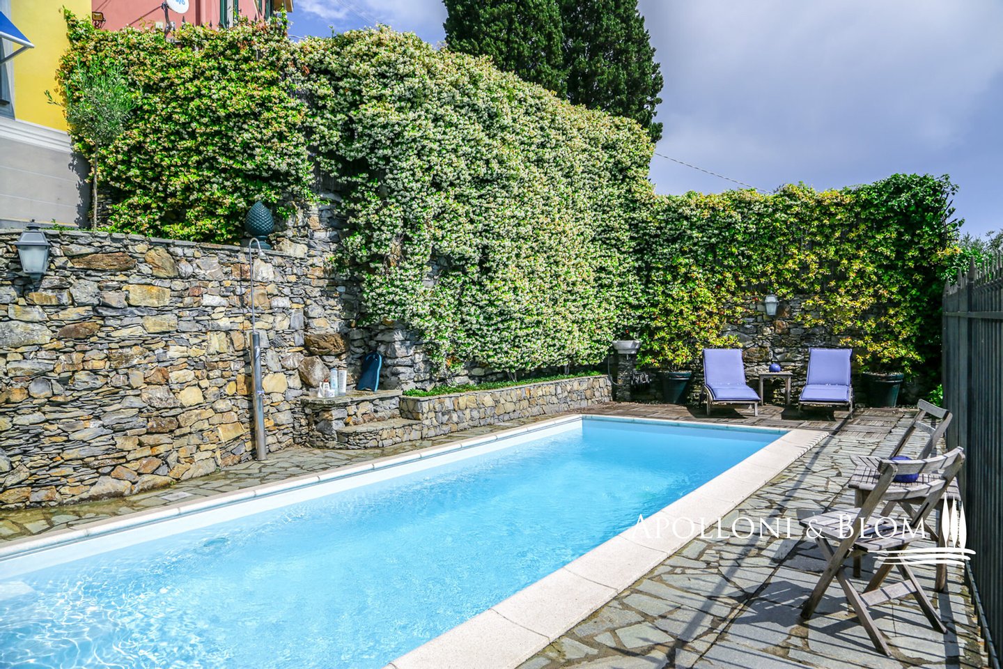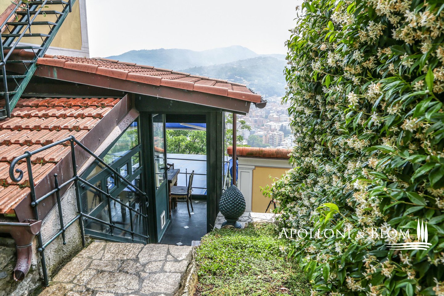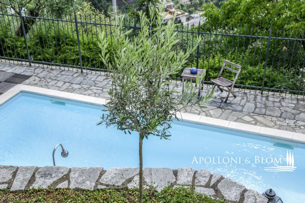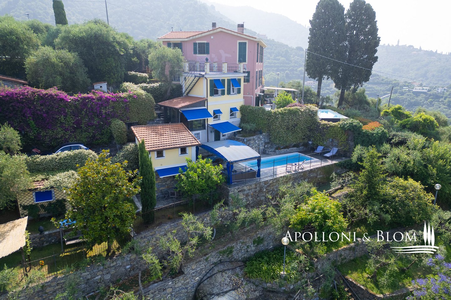 Mit Blick auf den Golf von Portofino, in perfektem ligurischen Stil auf drei Ebenen mit Terrassen, Schwimmbad, Garten und Abhängigkeit zu verkaufen in der Nähe von Rapallo. Eingebettet auf den ersten Hügeln von Rapallo, in einer der begehrtesten