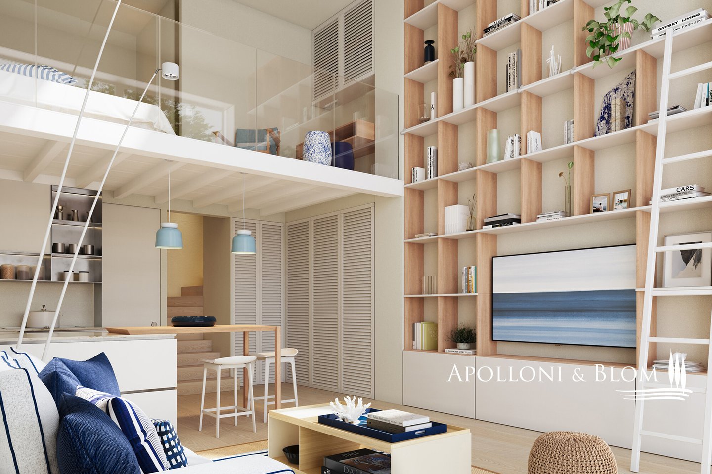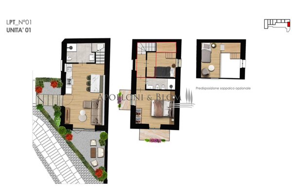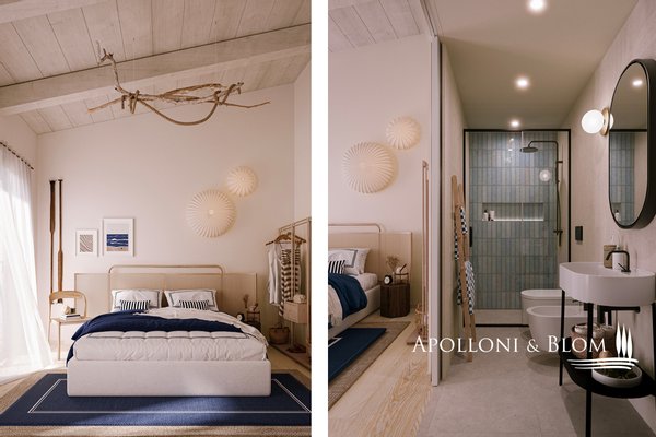 Obergeschoss: 1 Doppelschlafzimmer mit 2 Balkonen, 1 Badezimmer, 1 Einzelschlafzimmer mit Loft-Option für dritten Schlafbereich