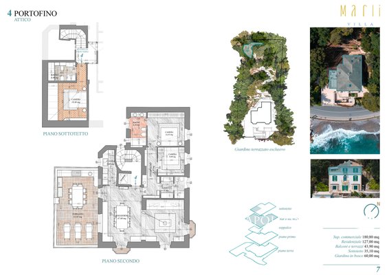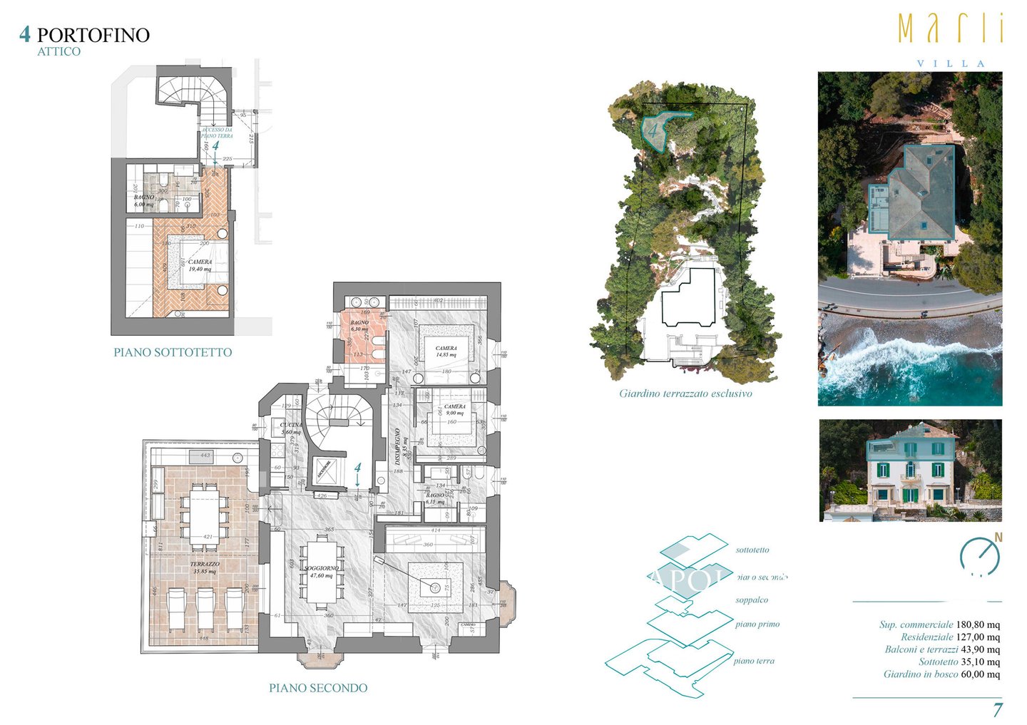Mit der Renovierung werden vier Wohneinheiten geschaffen: "1 - Punta Pedale", "2 - Paraggi", "3 - La Cervara", und "4 - Portofino". Der private Park der Villa Marli mit einer Fläche von ca. 5.000 Quadratmetern ist sowohl über einen Zugang am Meer als auch über ein Tor am oberen Ende der Via Repellini zu erreichen. In diesem Park verfügt jede Wohnung über einen eigenen, unabhängigen Raum (der nach Wunsch des Kunden eingerichtet werden kann), von dem aus man im Schatten jahrhundertealter Bäume einen fantastischen Blick von Chiavari bis nach Portofino genießen kann. "Portofino": ein exklusives Penthouse im zweiten Stock mit außergewöhnlichem Meerblick und direktem Blick auf Punta Pedale sowie einem privaten Anbau. Der Wohnbereich umfasst eine große und funktionelle Küche, einen geräumigen Essbereich mit einem Tisch für bis zu 10 Personen und ein großes Wohnzimmer mit einem großen Sofa und Sesseln. Der gesamte Wohnbereich ist nach Südosten ausgerichtet und bietet durch die großen Fenster, die traditionelle und einzigartige geometrische Formen aufweisen, einen endlosen Blick aufs Meer. Der Wohnbereich bietet direkten Zugang zur exklusiven, gepflasterten Außenterrasse. Innenbereich Schlafbereich: Ein Standard-Doppelzimmer, ein komplettes Bad und ein Hauptschlafzimmer mit eigenem Bad. Exklusive Außenbereiche: Die Einzigartigkeit und der absolute Wert der Wohnung "PORTOFINO" liegt in der fantastischen, gepflasterten Außenterrasse von ca. 43 Quadratmetern, die vom Wohnbereich aus zugänglich ist und einen privilegierten Blick auf das Meer von Chiavari bis Portofino bietet. Auf dieser exklusiven Terrasse, die mit fein gearbeiteten hellen Steinelementen gepflastert ist, können große Tische für bis zu 12-14 Personen aufgestellt, geräumige Lounges mit Polstermöbeln geschaffen und eine Außenküche eingerichtet werden. Zusätzlich zu dem gepflasterten Außenbereich verfügt die Wohnung über einen exklusiven, privaten und unabhängigen Raum im Park. Dieser ca. 50 Quadratmeter große Raum kann nach den Wünschen des Kunden eingerichtet werden und bietet einen fantastischen Blick auf das Meer von Chiavari bis Portofino. Anbau im Dachgeschoss: Die Wohnung "PORTOFINO" verfügt über einen bequemen und sehr nützlichen privaten und unabhängigen Raum im Dachgeschoss, der mit dem Aufzug und über das gemeinsame Treppenhaus der Villa erreichbar ist; es handelt sich um einen kleinen Anbau, der perfekt ist, um Ihren Gästen Privatsphäre und Unabhängigkeit zu gewährleisten.