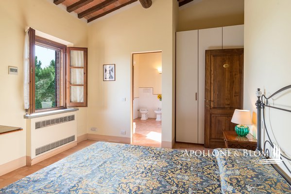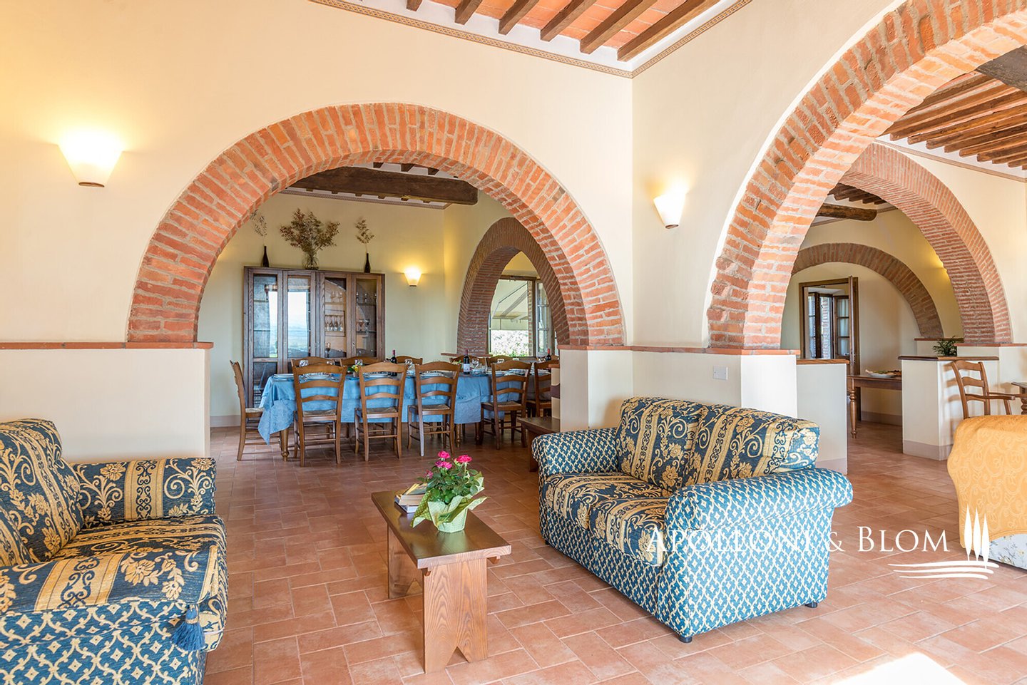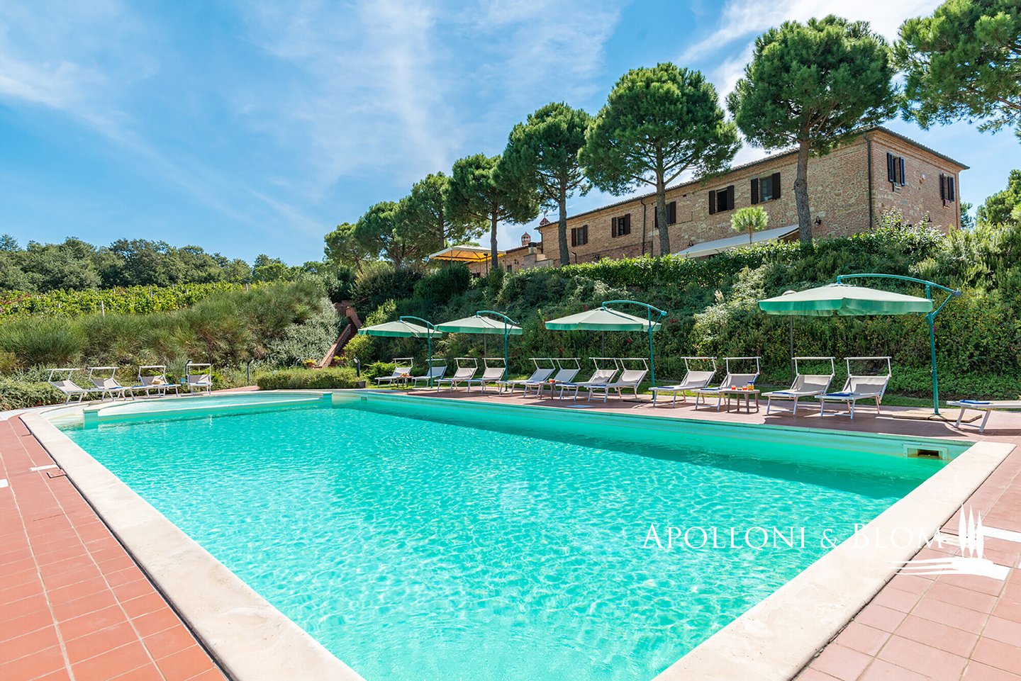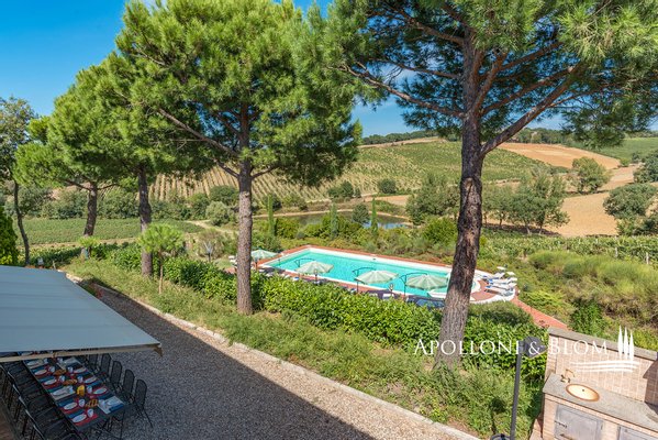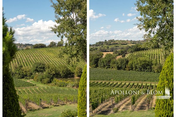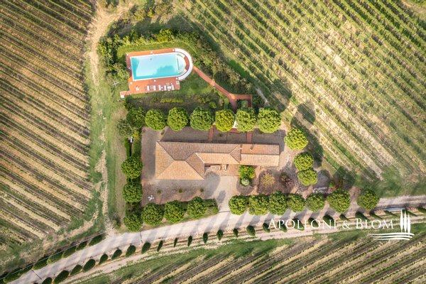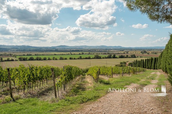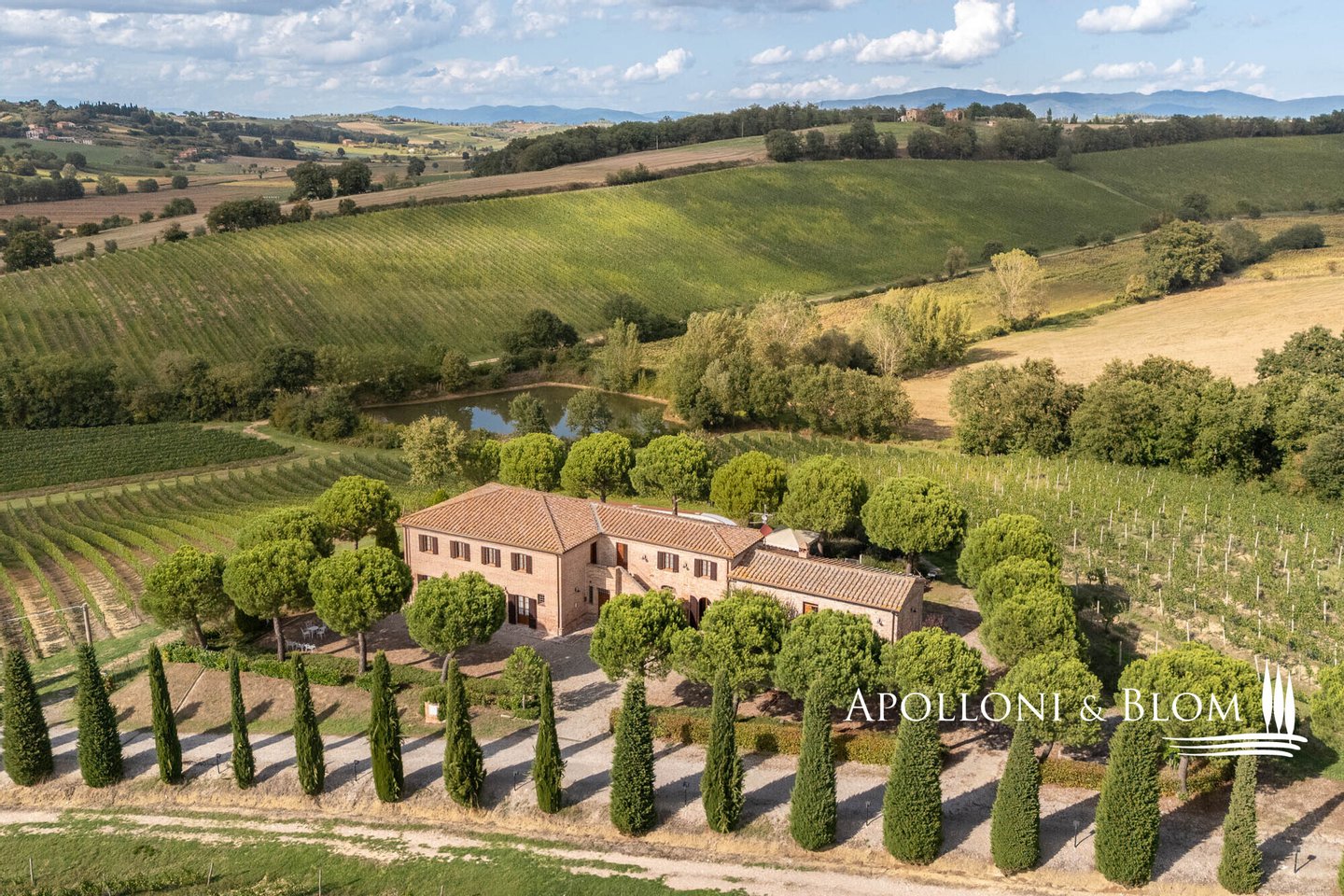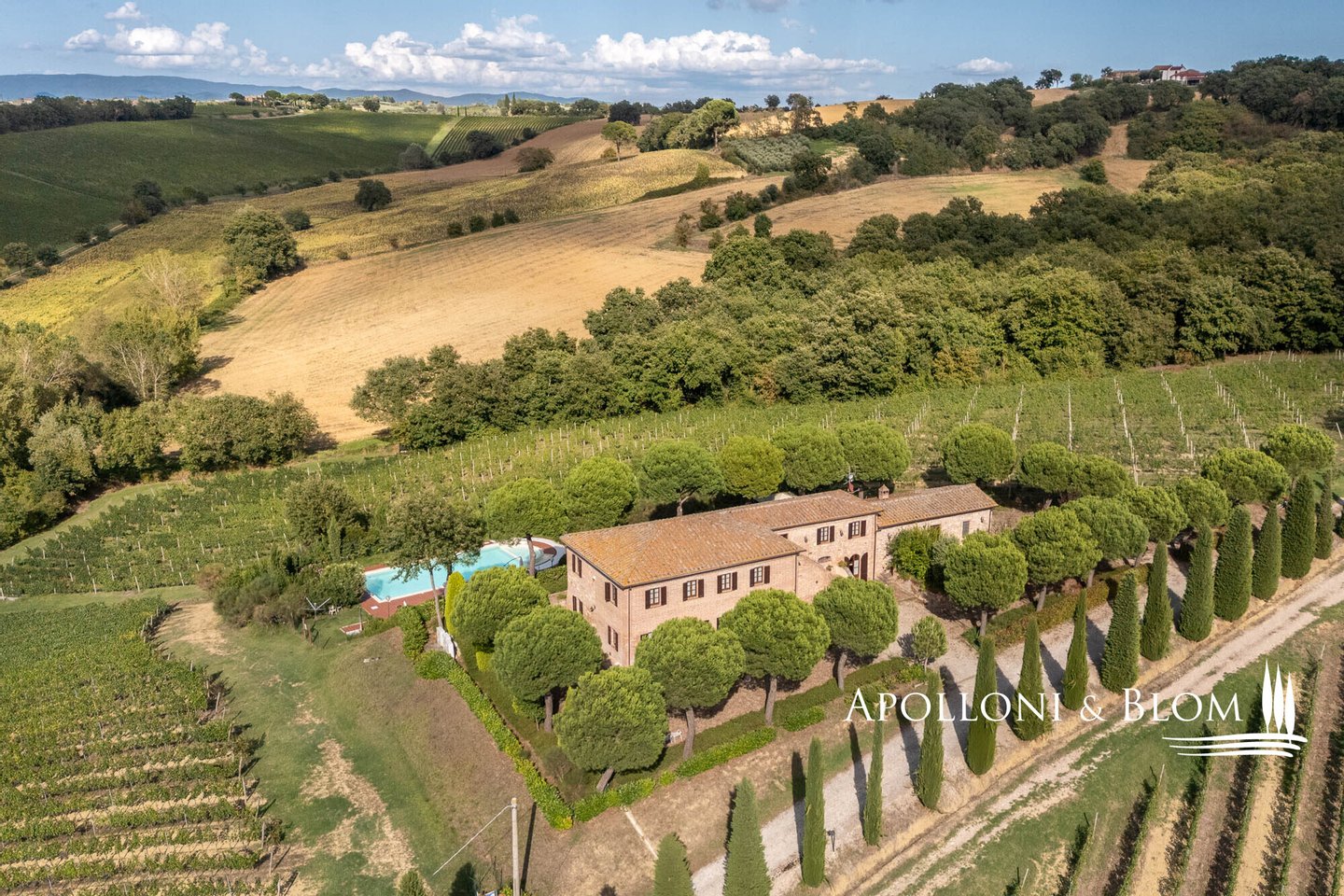 Auf einer Anhöhe mit endlosem Blick, mit landwirtschaftlichen Flächen, die mit Weinbergen bepflanzt sind, steht ein renoviertes Bauernhaus mit Pool zum Verkauf in Montepulciano. In beherrschender Lage auf einer Hügelkuppe mit Blick auf das Valdichiana bietet diese prestigeträchtige Landvilla eine majestätische, von Zypressen gesäumte Auffahrt, die sanft zum Gipfel des Hügels führt, wo sich das Anwesen zu einem ungehinderten Panoramablick öffnet, der Weinberge und mittelalterliche Dörfer umfasst. Mit ihrer zeitlosen Architektur, die mit viel Liebe zum Detail restauriert wurde, und ihren 6 Hektar Ackerland verkörpert die Villa sowohl ländliche Authentizität als auch raffinierten Komfort. Auf zwei Etagen mit einer Fläche von ca. 535 Quadratmetern sind Backstein- und Steinfassaden, klassische Holzfensterläden und ein gepflegter Garten mit jahrhundertealten Kiefern und duftenden Hecken erhalten geblieben. Bei der Restaurierung wurde der rustikale Charme von handgefertigten Terrakottaböden, freiliegenden Balken und Backsteinbögen mit modernem Komfort wie Klimaanlage und doppelt verglasten Fenstern mit Moskitonetzen kombiniert. Im Erdgeschoss befindet sich eine Halle, in der vier große Backsteinbögen gemütliche Wohnbereiche und einen Esstisch für bis zu 20 Personen umrahmen. Von der Küche aus gelangt man direkt in den Garten und auf eine schattige Terrasse, die sich hervorragend für Mahlzeiten im Freien eignet und einen bezaubernden Blick auf den Pool und die umliegende Landschaft bietet. Vom Garten aus gelangt man zu zwei separaten Gästezimmern und einer Ein-Zimmer-Wohnung, die sich ideal für den Besuch von Freunden oder Dienstpersonal eignet. Im Obergeschoss befinden sich vier weitere Doppelschlafzimmer, alle mit warmem Tageslicht und weitem Blick auf die Weinberge und Valdichiana. Alle acht Zimmer haben ein eigenes Bad, vier davon mit Whirlpool. Der Garten wird durch einen Swimmingpool mit Terrakotta-Solarium bereichert. Auf drei Hektar Weinbergen wird der prestigeträchtige Rosso di Montepulciano DOC aus Sangiovese-Trauben angebaut, flankiert von drei Hektar Wald, die das Anwesen vervollständigen. Ideal gelegen, nur wenige Minuten von Montepulciano, Cortona und dem Trasimeno-See und nur 20 Minuten von der Autobahn A1 entfernt. Ideal als privater Wohnsitz oder als exklusiver Rückzugsort, um Gäste zu empfangen und ihnen das authentischste toskanische Erlebnis zu bieten - inmitten von edlen Weinen, zeitlosen Landschaften und einer Atmosphäre von natürlicher, schlichter Eleganz.