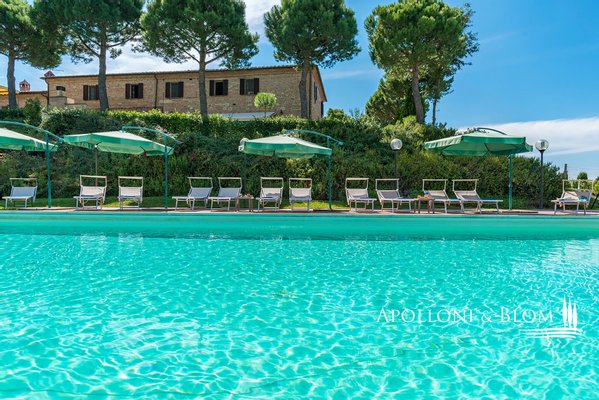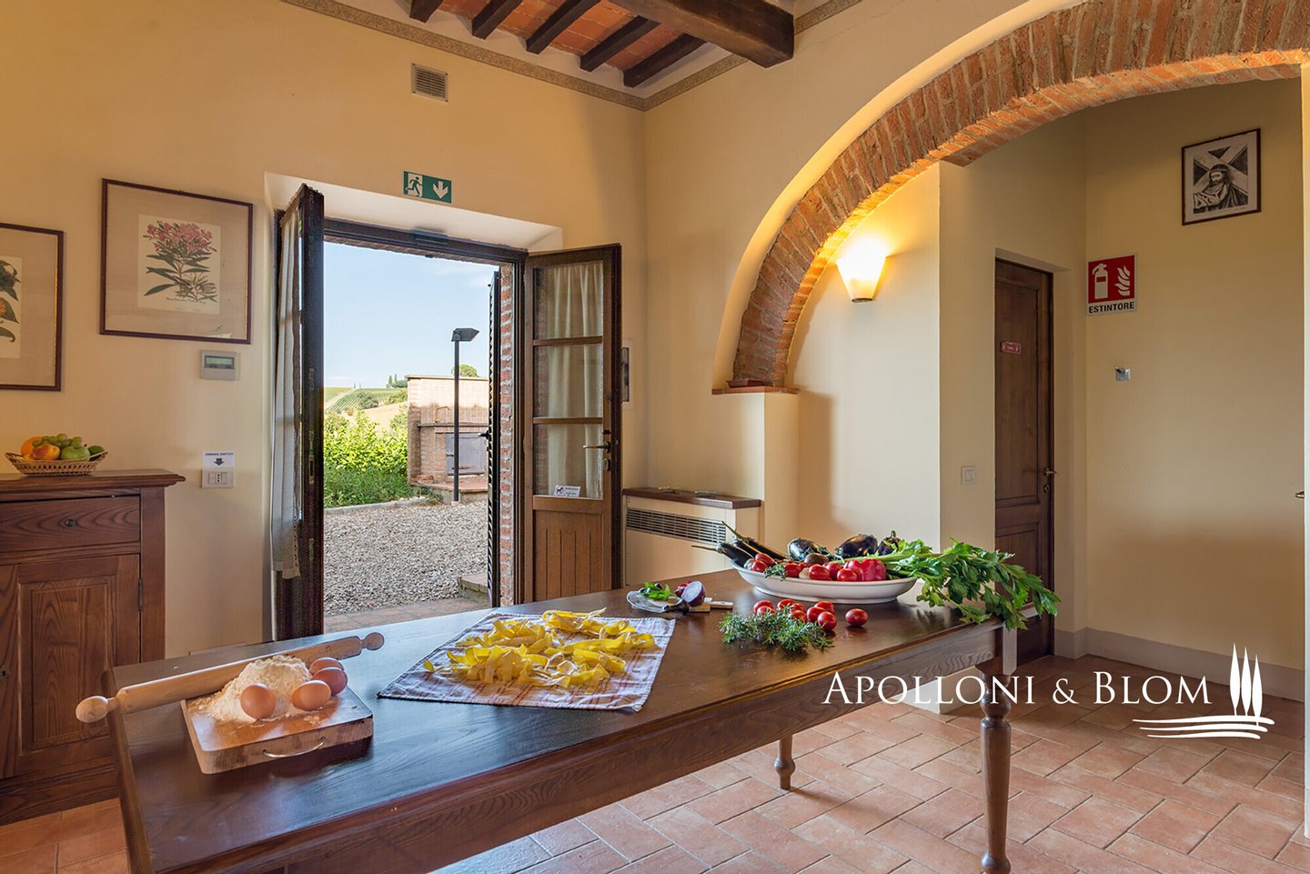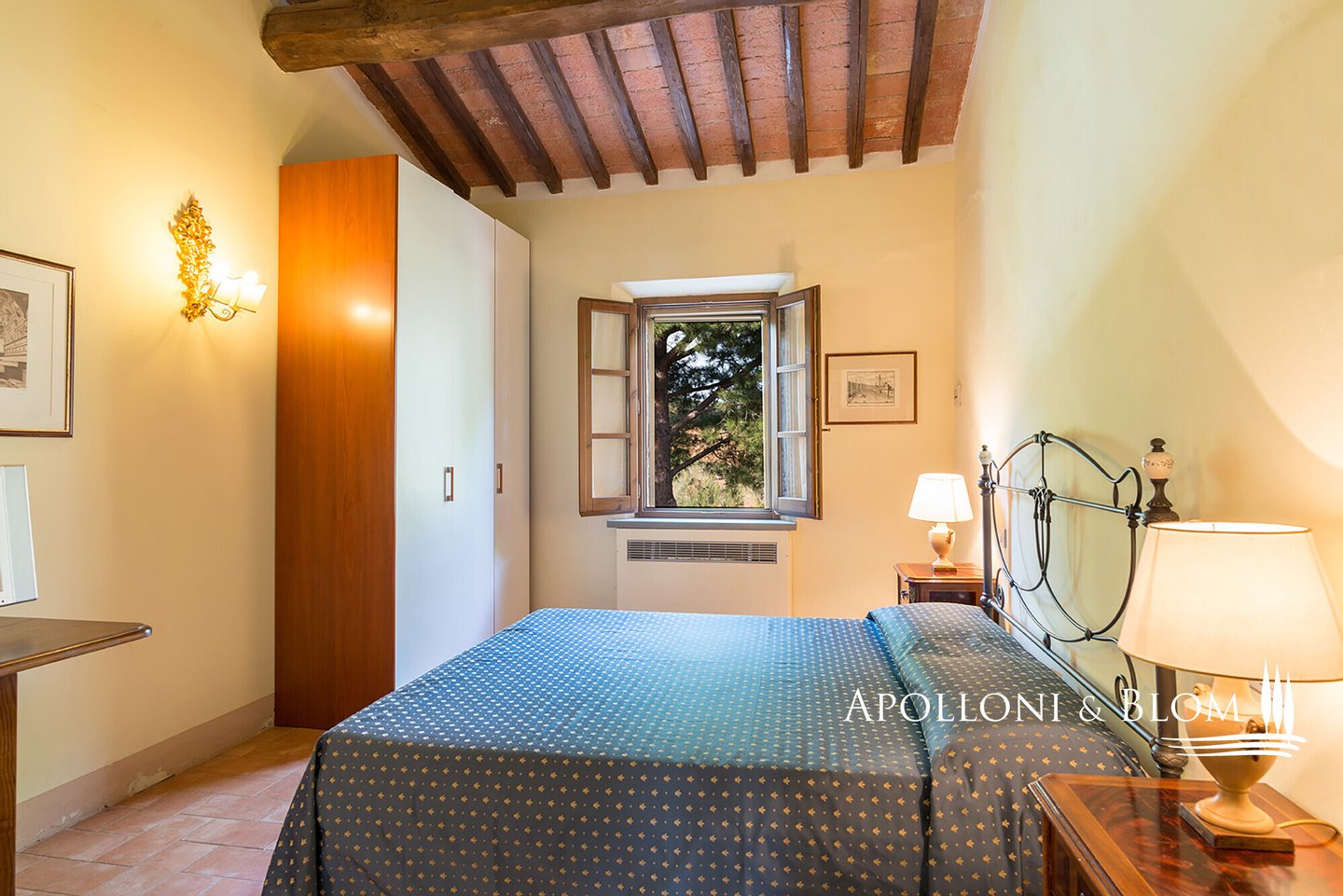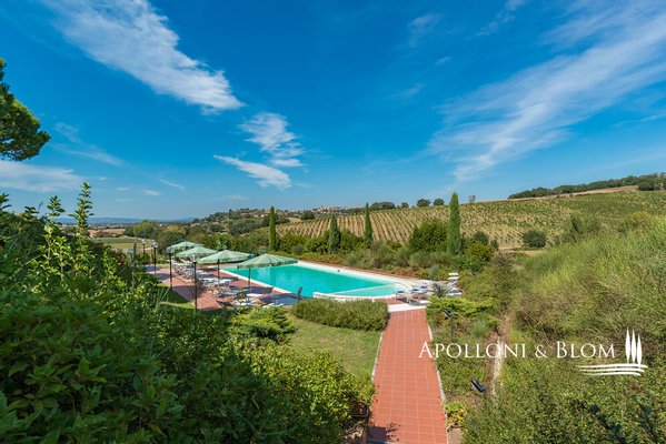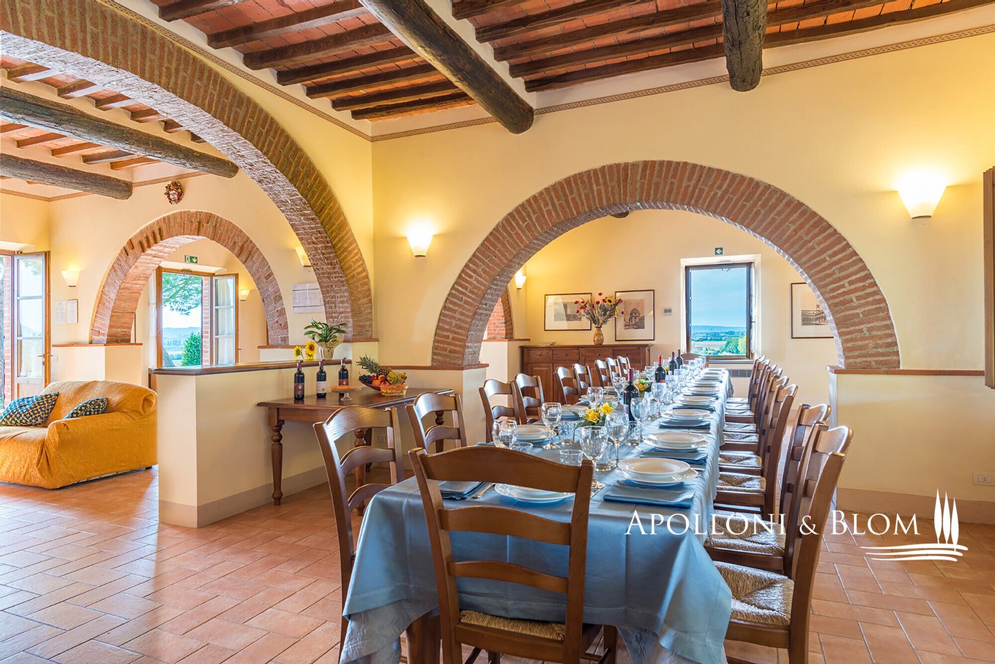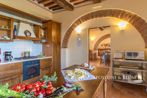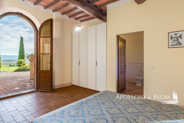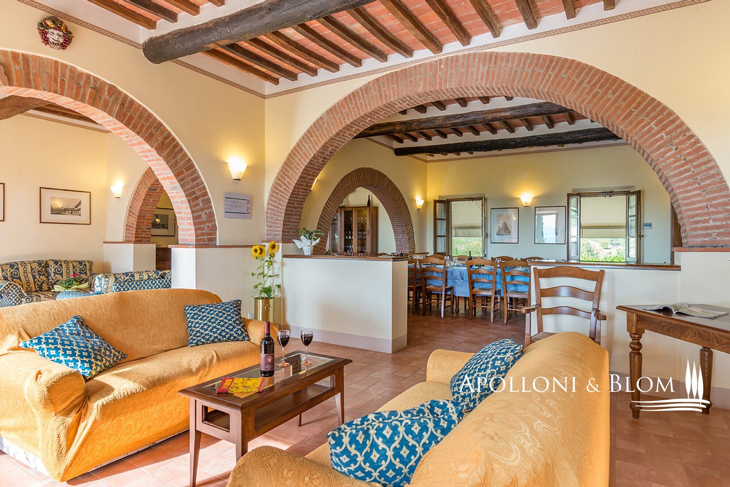 Auf einer Anhöhe mit endlosem Blick, mit landwirtschaftlichen Flächen, die mit Weinbergen bepflanzt sind, steht ein renoviertes Bauernhaus mit Pool zum Verkauf in Montepulciano. In beherrschender Lage auf einer Hügelkuppe mit Blick auf das Valdichiana bietet diese prestigeträchtige Landvilla eine majestätische, von Zypressen gesäumte Auffahrt, die sanft zum Gipfel des Hügels führt, wo sich das Anwesen zu einem ungehinderten Panoramablick öffnet, der Weinberge und mittelalterliche Dörfer umfasst. Mit ihrer zeitlosen Architektur, die mit viel Liebe zum Detail restauriert wurde, und ihren 6 Hektar Ackerland verkörpert die Villa sowohl ländliche Authentizität als auch raffinierten Komfort. Auf zwei Etagen mit einer Fläche von ca. 535 Quadratmetern sind Backstein- und Steinfassaden, klassische Holzfensterläden und ein gepflegter Garten mit jahrhundertealten Kiefern und duftenden Hecken erhalten geblieben. Bei der Restaurierung wurde der rustikale Charme von handgefertigten Terrakottaböden, freiliegenden Balken und Backsteinbögen mit modernem Komfort wie Klimaanlage und doppelt verglasten Fenstern mit Moskitonetzen kombiniert. Im Erdgeschoss befindet sich eine Halle, in der vier große Backsteinbögen gemütliche Wohnbereiche und einen Esstisch für bis zu 20 Personen umrahmen. Von der Küche aus gelangt man direkt in den Garten und auf eine schattige Terrasse, die sich hervorragend für Mahlzeiten im Freien eignet und einen bezaubernden Blick auf den Pool und die umliegende Landschaft bietet. Vom Garten aus gelangt man zu zwei separaten Gästezimmern und einer Ein-Zimmer-Wohnung, die sich ideal für den Besuch von Freunden oder Dienstpersonal eignet. Im Obergeschoss befinden sich vier weitere Doppelschlafzimmer, alle mit warmem Tageslicht und weitem Blick auf die Weinberge und Valdichiana. Alle acht Zimmer haben ein eigenes Bad, vier davon mit Whirlpool. Der Garten wird durch einen Swimmingpool mit Terrakotta-Solarium bereichert. Auf drei Hektar Weinbergen wird der prestigeträchtige Rosso di Montepulciano DOC aus Sangiovese-Trauben angebaut, flankiert von drei Hektar Wald, die das Anwesen vervollständigen. Ideal gelegen, nur wenige Minuten von Montepulciano, Cortona und dem Trasimeno-See und nur 20 Minuten von der Autobahn A1 entfernt. Ideal als privater Wohnsitz oder als exklusiver Rückzugsort, um Gäste zu empfangen und ihnen das authentischste toskanische Erlebnis zu bieten - inmitten von edlen Weinen, zeitlosen Landschaften und einer Atmosphäre von natürlicher, schlichter Eleganz.
