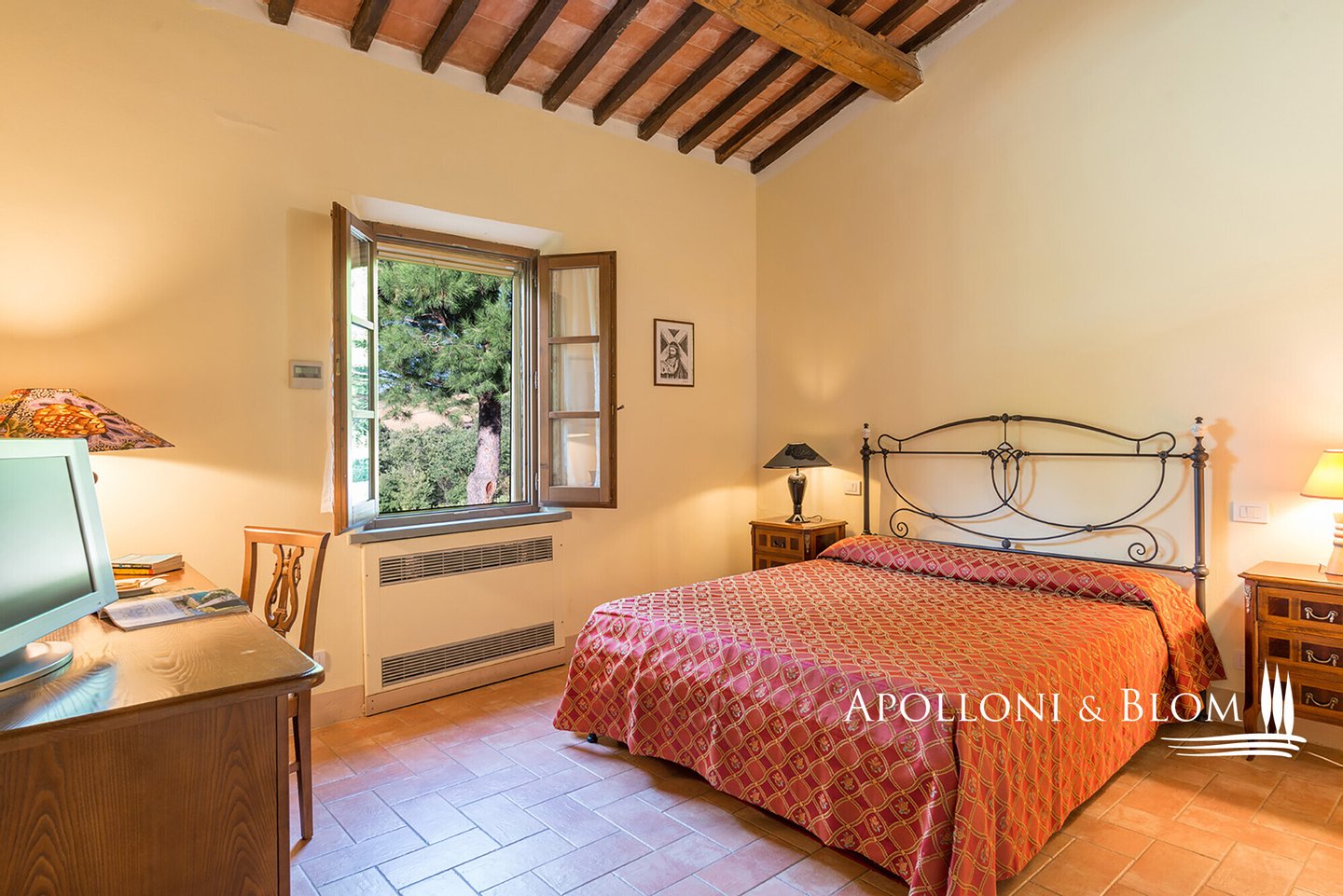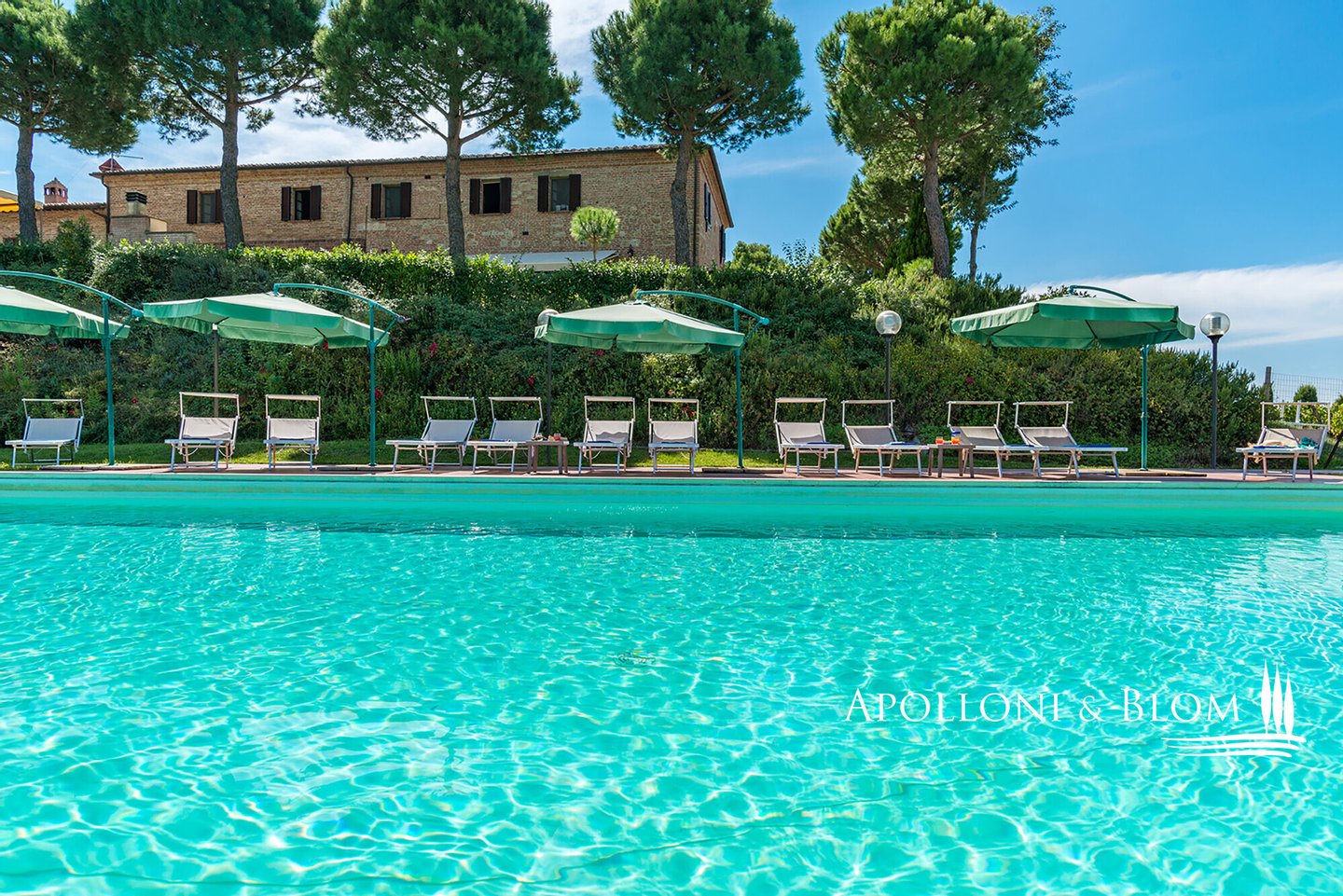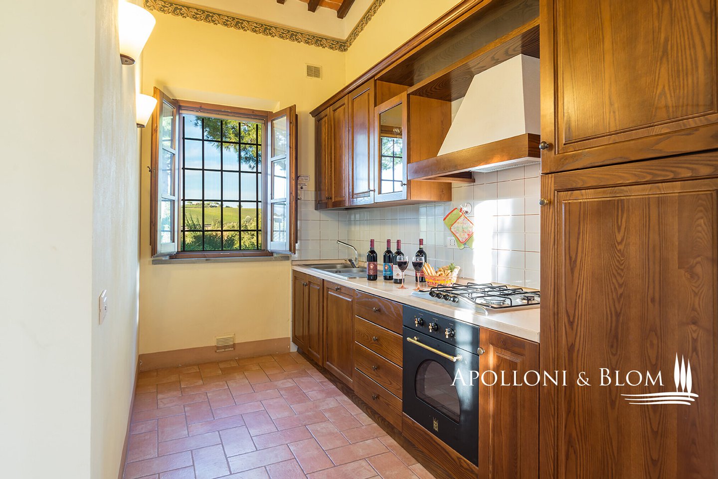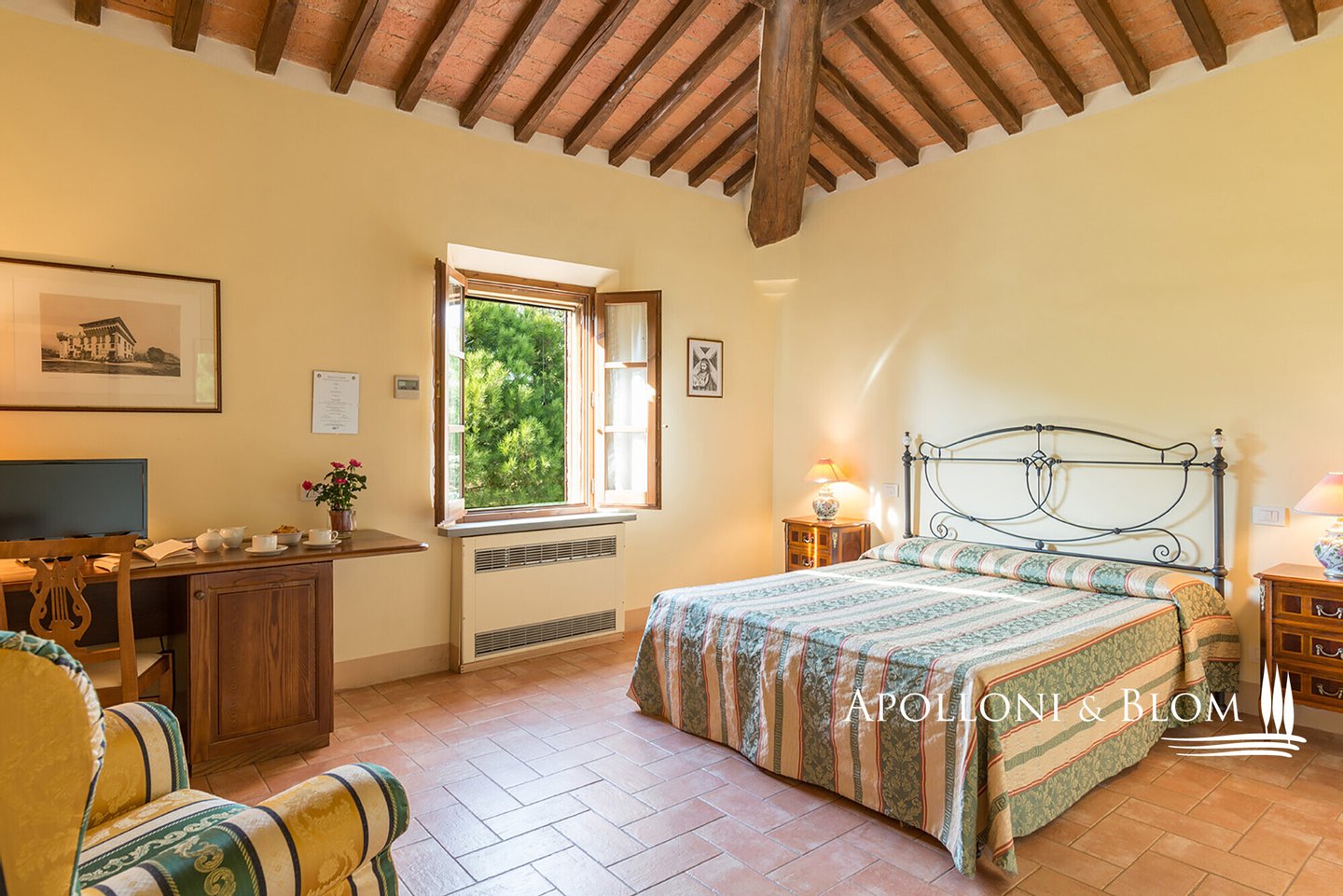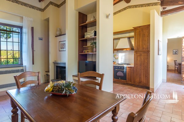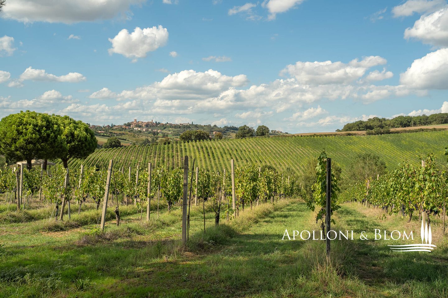 Auf einer Anhöhe mit endlosem Blick, mit landwirtschaftlichen Flächen, die mit Weinbergen bepflanzt sind, steht ein renoviertes Bauernhaus mit Pool zum Verkauf in Montepulciano. In beherrschender Lage auf einer Hügelkuppe mit Blick auf das Valdichiana bietet diese prestigeträchtige Landvilla eine majestätische, von Zypressen gesäumte Auffahrt, die sanft zum Gipfel des Hügels führt, wo sich das Anwesen zu einem ungehinderten Panoramablick öffnet, der Weinberge und mittelalterliche Dörfer umfasst. Mit ihrer zeitlosen Architektur, die mit viel Liebe zum Detail restauriert wurde, und ihren 6 Hektar Ackerland verkörpert die Villa sowohl ländliche Authentizität als auch raffinierten Komfort. Auf zwei Etagen mit einer Fläche von ca. 535 Quadratmetern sind Backstein- und Steinfassaden, klassische Holzfensterläden und ein gepflegter Garten mit jahrhundertealten Kiefern und duftenden Hecken erhalten geblieben. Bei der Restaurierung wurde der rustikale Charme von handgefertigten Terrakottaböden, freiliegenden Balken und Backsteinbögen mit modernem Komfort wie Klimaanlage und doppelt verglasten Fenstern mit Moskitonetzen kombiniert. Im Erdgeschoss befindet sich eine Halle, in der vier große Backsteinbögen gemütliche Wohnbereiche und einen Esstisch für bis zu 20 Personen umrahmen. Von der Küche aus gelangt man direkt in den Garten und auf eine schattige Terrasse, die sich hervorragend für Mahlzeiten im Freien eignet und einen bezaubernden Blick auf den Pool und die umliegende Landschaft bietet. Vom Garten aus gelangt man zu zwei separaten Gästezimmern und einer Ein-Zimmer-Wohnung, die sich ideal für den Besuch von Freunden oder Dienstpersonal eignet. Im Obergeschoss befinden sich vier weitere Doppelschlafzimmer, alle mit warmem Tageslicht und weitem Blick auf die Weinberge und Valdichiana. Alle acht Zimmer haben ein eigenes Bad, vier davon mit Whirlpool. Der Garten wird durch einen Swimmingpool mit Terrakotta-Solarium bereichert. Auf drei Hektar Weinbergen wird der prestigeträchtige Rosso di Montepulciano DOC aus Sangiovese-Trauben angebaut, flankiert von drei Hektar Wald, die das Anwesen vervollständigen. Ideal gelegen, nur wenige Minuten von Montepulciano, Cortona und dem Trasimeno-See und nur 20 Minuten von der Autobahn A1 entfernt. Ideal als privater Wohnsitz oder als exklusiver Rückzugsort, um Gäste zu empfangen und ihnen das authentischste toskanische Erlebnis zu bieten - inmitten von edlen Weinen, zeitlosen Landschaften und einer Atmosphäre von natürlicher, schlichter Eleganz.