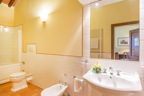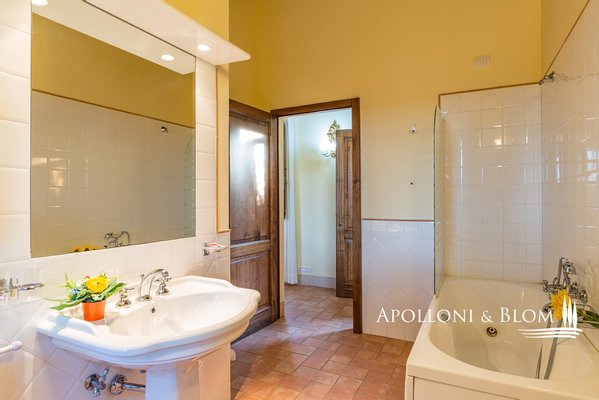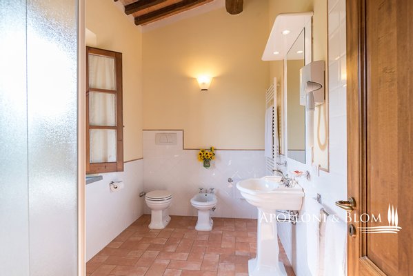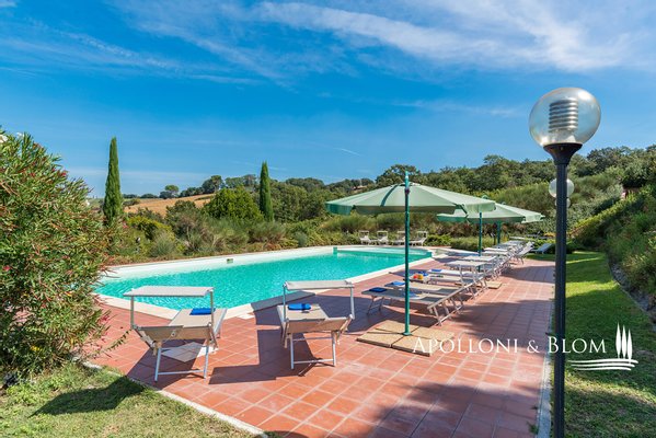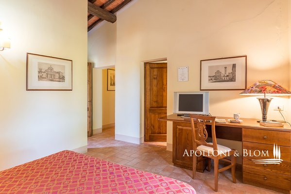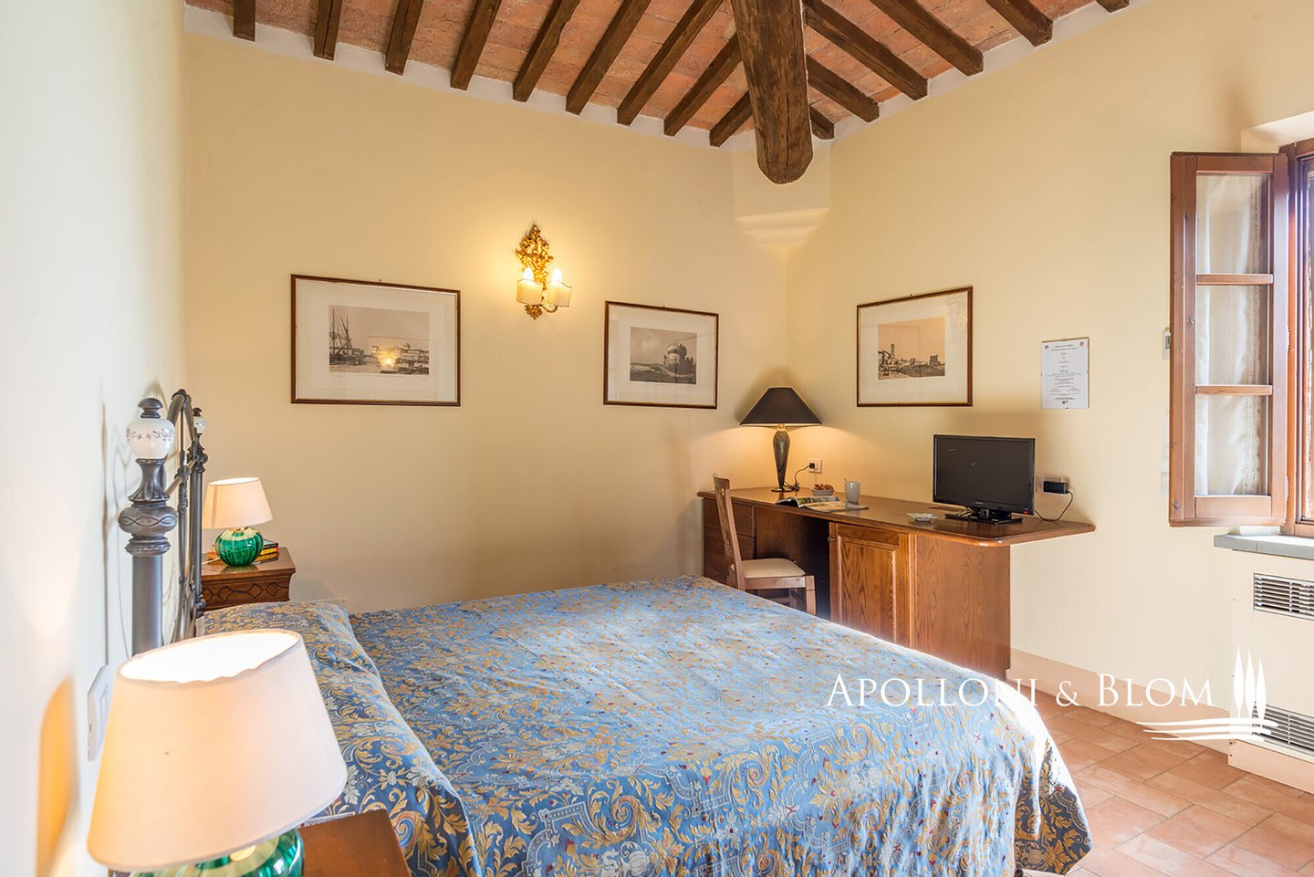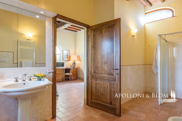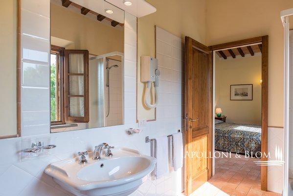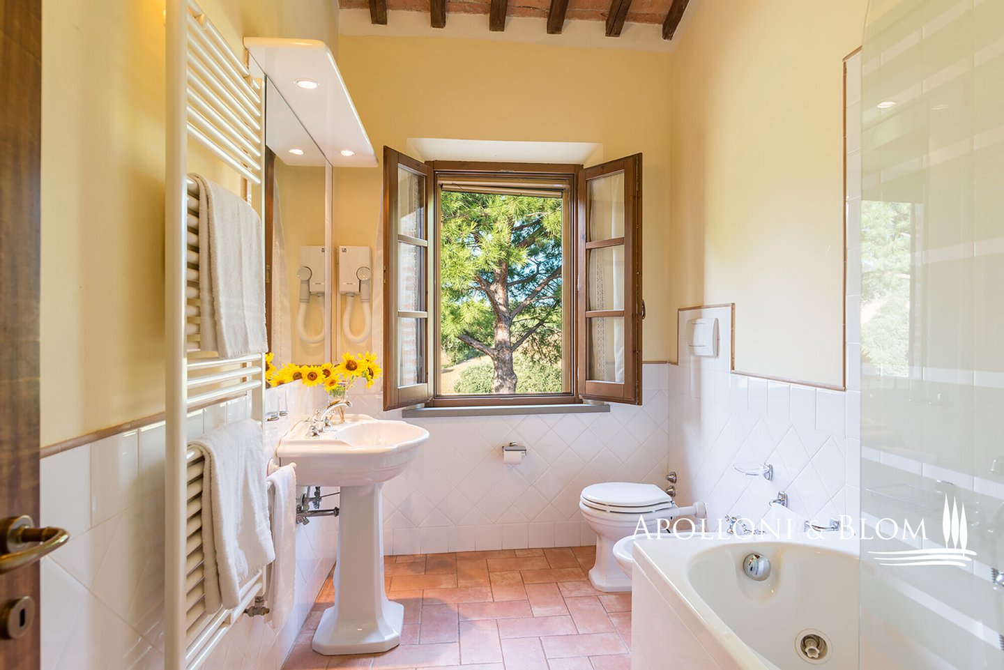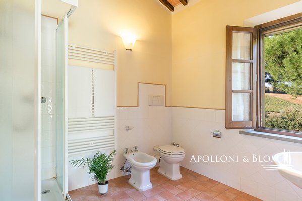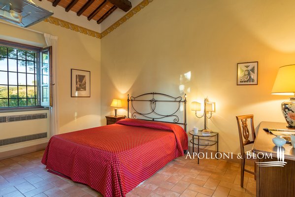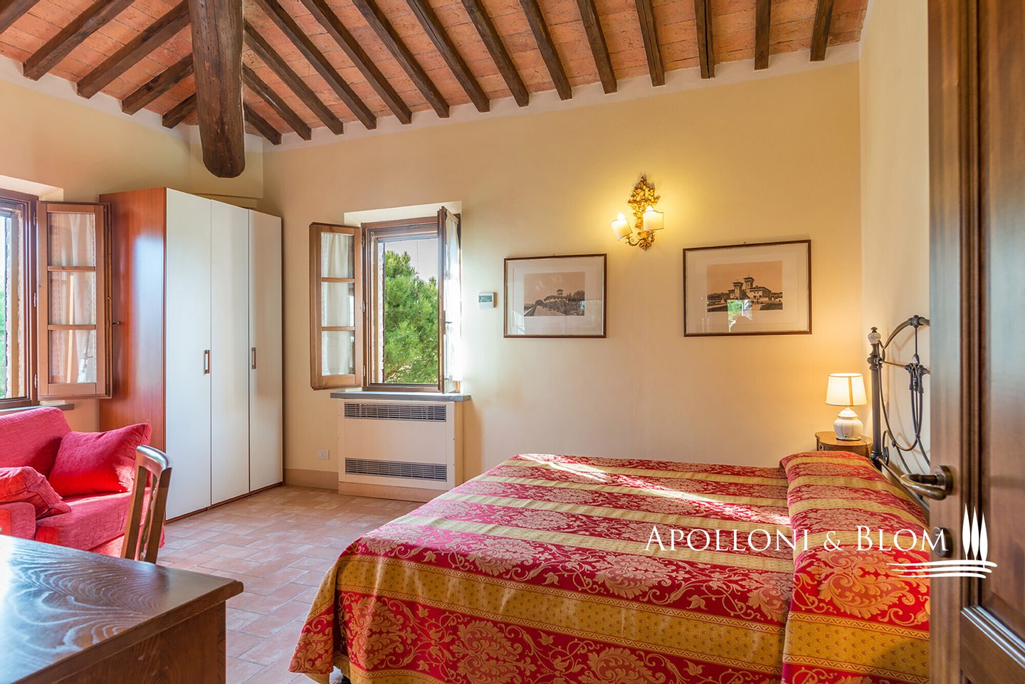 Auf einer Anhöhe mit endlosem Blick, mit landwirtschaftlichen Flächen, die mit Weinbergen bepflanzt sind, steht ein renoviertes Bauernhaus mit Pool zum Verkauf in Montepulciano. In beherrschender Lage auf einer Hügelkuppe mit Blick auf das Valdichiana bietet diese prestigeträchtige Landvilla eine majestätische, von Zypressen gesäumte Auffahrt, die sanft zum Gipfel des Hügels führt, wo sich das Anwesen zu einem ungehinderten Panoramablick öffnet, der Weinberge und mittelalterliche Dörfer umfasst. Mit ihrer zeitlosen Architektur, die mit viel Liebe zum Detail restauriert wurde, und ihren 6 Hektar Ackerland verkörpert die Villa sowohl ländliche Authentizität als auch raffinierten Komfort. Auf zwei Etagen mit einer Fläche von ca. 535 Quadratmetern sind Backstein- und Steinfassaden, klassische Holzfensterläden und ein gepflegter Garten mit jahrhundertealten Kiefern und duftenden Hecken erhalten geblieben. Bei der Restaurierung wurde der rustikale Charme von handgefertigten Terrakottaböden, freiliegenden Balken und Backsteinbögen mit modernem Komfort wie Klimaanlage und doppelt verglasten Fenstern mit Moskitonetzen kombiniert. Im Erdgeschoss befindet sich eine Halle, in der vier große Backsteinbögen gemütliche Wohnbereiche und einen Esstisch für bis zu 20 Personen umrahmen. Von der Küche aus gelangt man direkt in den Garten und auf eine schattige Terrasse, die sich hervorragend für Mahlzeiten im Freien eignet und einen bezaubernden Blick auf den Pool und die umliegende Landschaft bietet. Vom Garten aus gelangt man zu zwei separaten Gästezimmern und einer Ein-Zimmer-Wohnung, die sich ideal für den Besuch von Freunden oder Dienstpersonal eignet. Im Obergeschoss befinden sich vier weitere Doppelschlafzimmer, alle mit warmem Tageslicht und weitem Blick auf die Weinberge und Valdichiana. Alle acht Zimmer haben ein eigenes Bad, vier davon mit Whirlpool. Der Garten wird durch einen Swimmingpool mit Terrakotta-Solarium bereichert. Auf drei Hektar Weinbergen wird der prestigeträchtige Rosso di Montepulciano DOC aus Sangiovese-Trauben angebaut, flankiert von drei Hektar Wald, die das Anwesen vervollständigen. Ideal gelegen, nur wenige Minuten von Montepulciano, Cortona und dem Trasimeno-See und nur 20 Minuten von der Autobahn A1 entfernt. Ideal als privater Wohnsitz oder als exklusiver Rückzugsort, um Gäste zu empfangen und ihnen das authentischste toskanische Erlebnis zu bieten - inmitten von edlen Weinen, zeitlosen Landschaften und einer Atmosphäre von natürlicher, schlichter Eleganz.