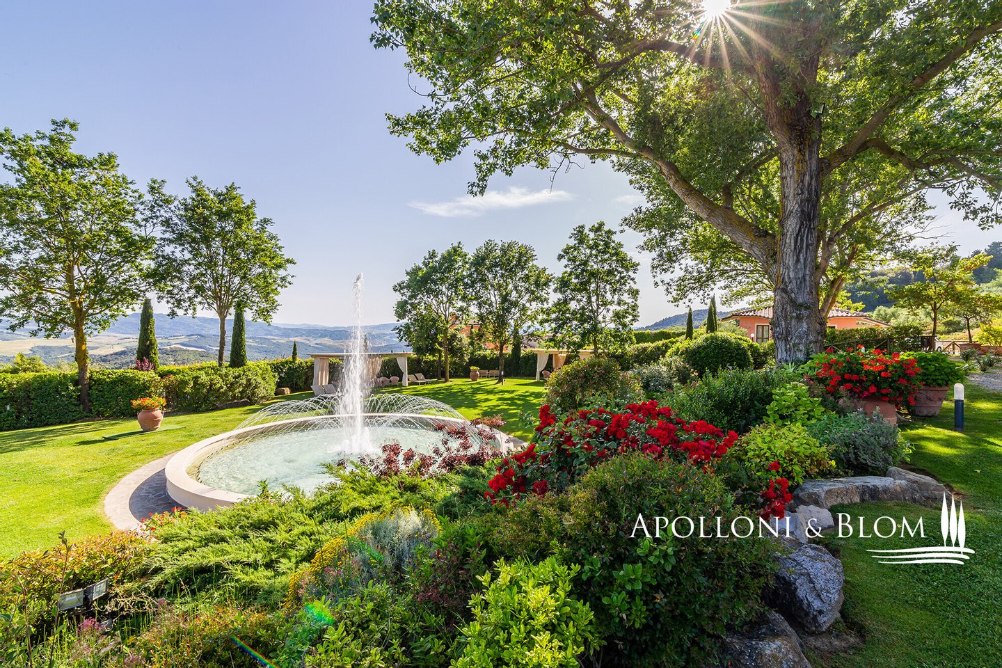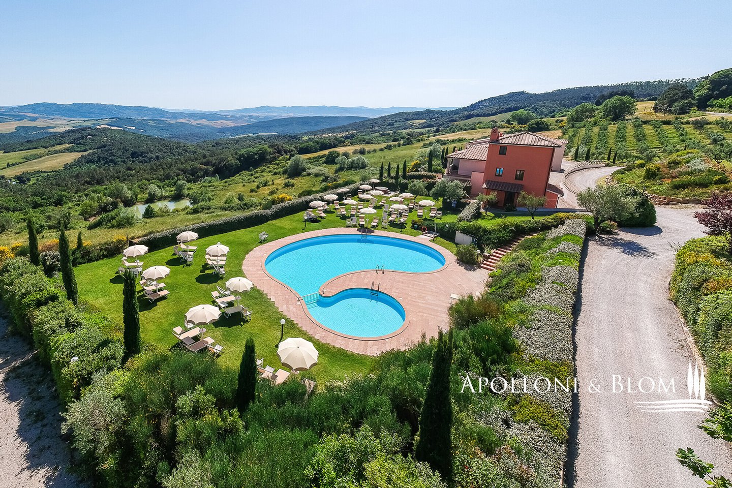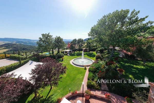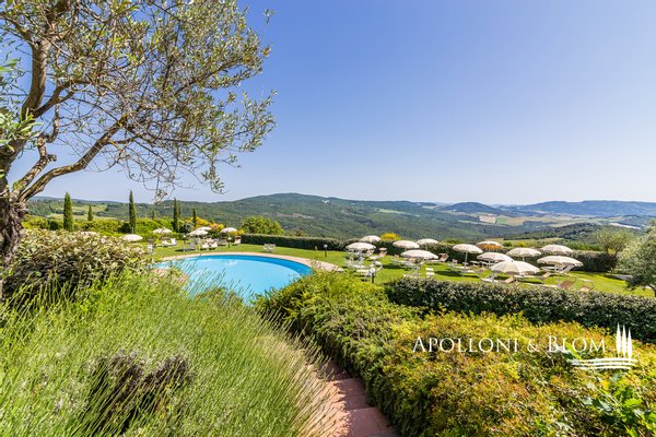 Ein bezaubernder, fein restaurierter Ort mit Schwimmbad, 34 Zimmern, Weinberg und Olivenhain mit Panoramablick auf Volterra zu verkaufen. Inmitten der authentischsten Hügel der Toskana, auf einer Höhe von ca. 400 Metern, steht ein altes Jagdschloss