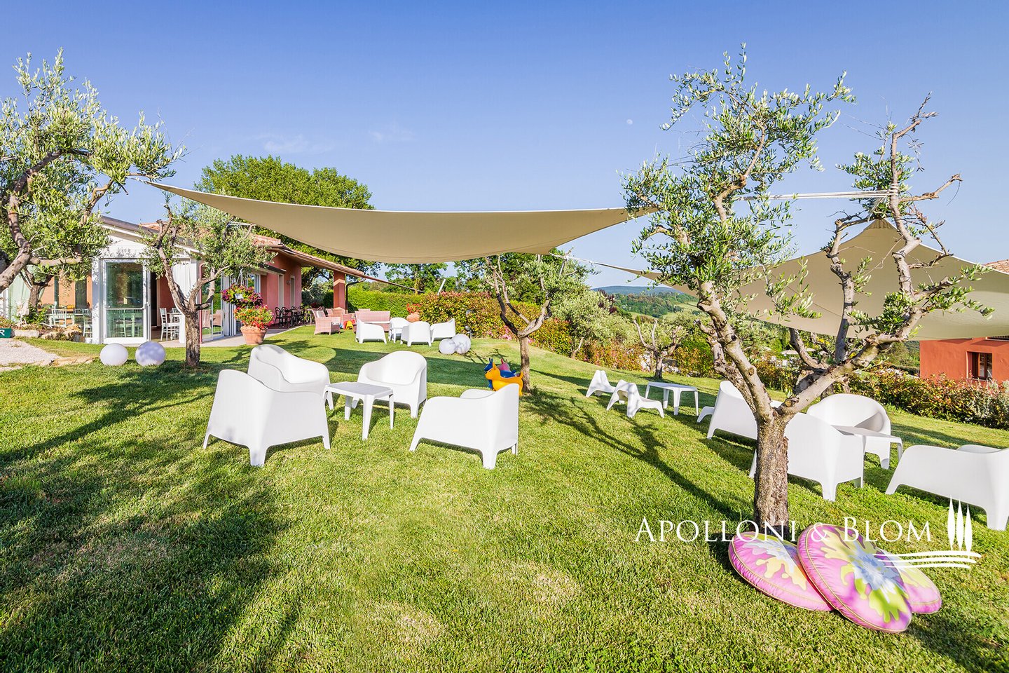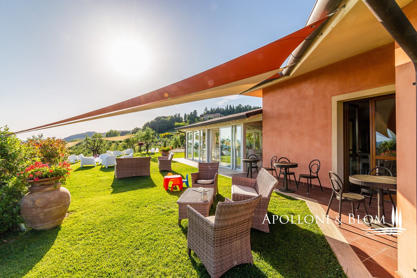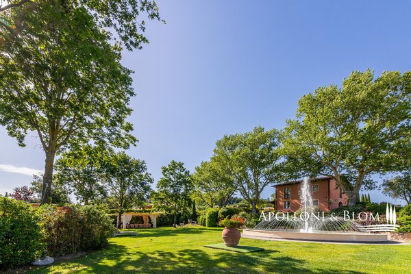 Garten/Gelände: insgesamt 73,50 Hektar, davon 15.000 qm eingezäunter Park mit schmiedeeisernen Mauern und Geländern, Beleuchtungsanlage, 3 Zugangstoren, Terrakottawege und -pfade, Brunnen mit Wasserspielen, Kinderspielplatz, und die restlichen 72 Hektar für die landwirtschaftliche Nutzung mit Ackerland, Weiden, Olivenhainen, Wäldern und 2,5 Hektar mit Chianti DOCG-Weinbergen bepflanzt