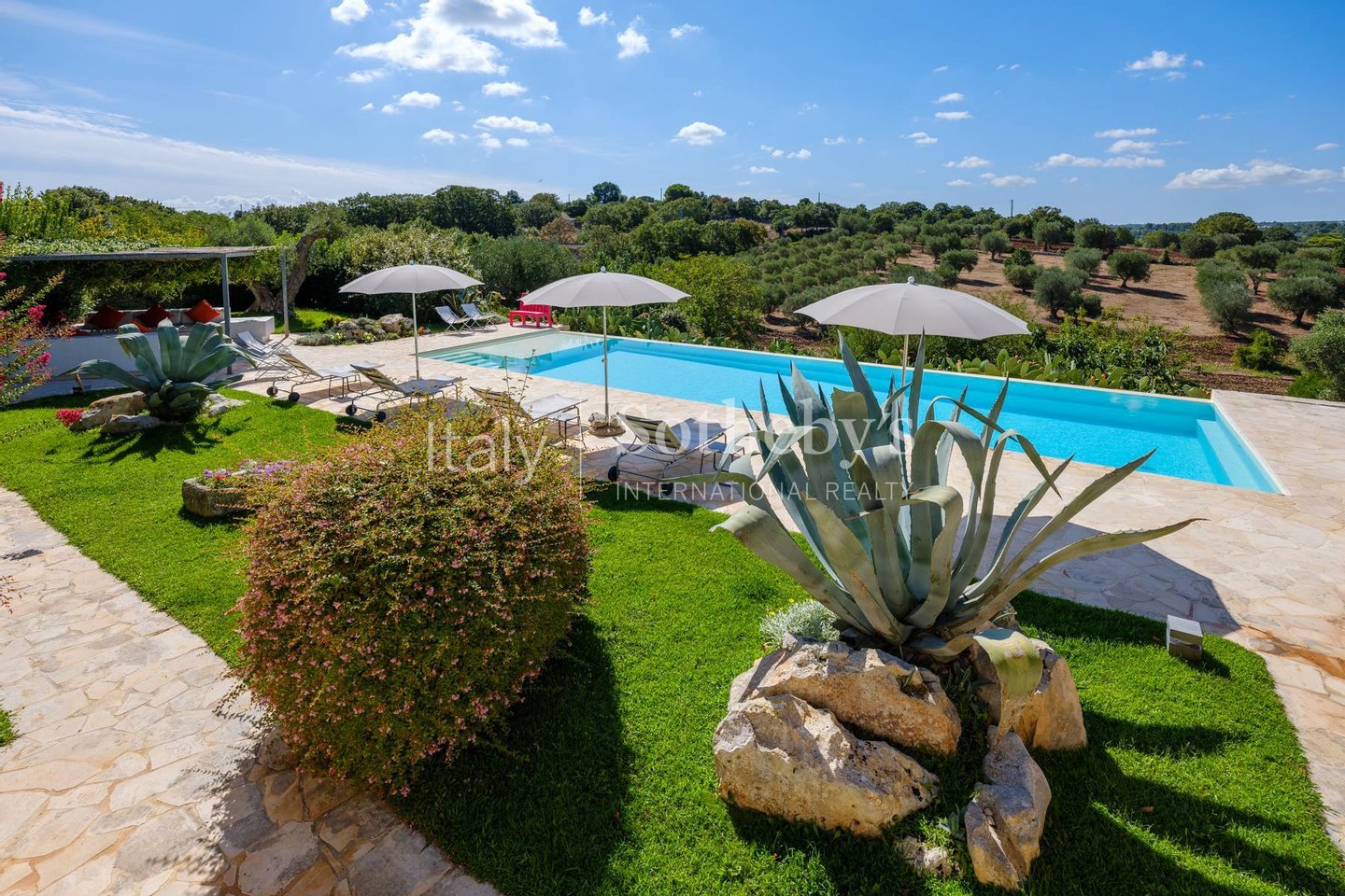 Der Garten, eingerahmt von jahrhundertealten Oliven- und Eichenbäumen, beherbergt einen 12 x 6 m Infinity-Pool mit Salzwasseraufbereitungssystem, Terrasse aus lokalem Stein, Sonnenliegen, Außendusche und einem Technikraum von etwa 15 m².