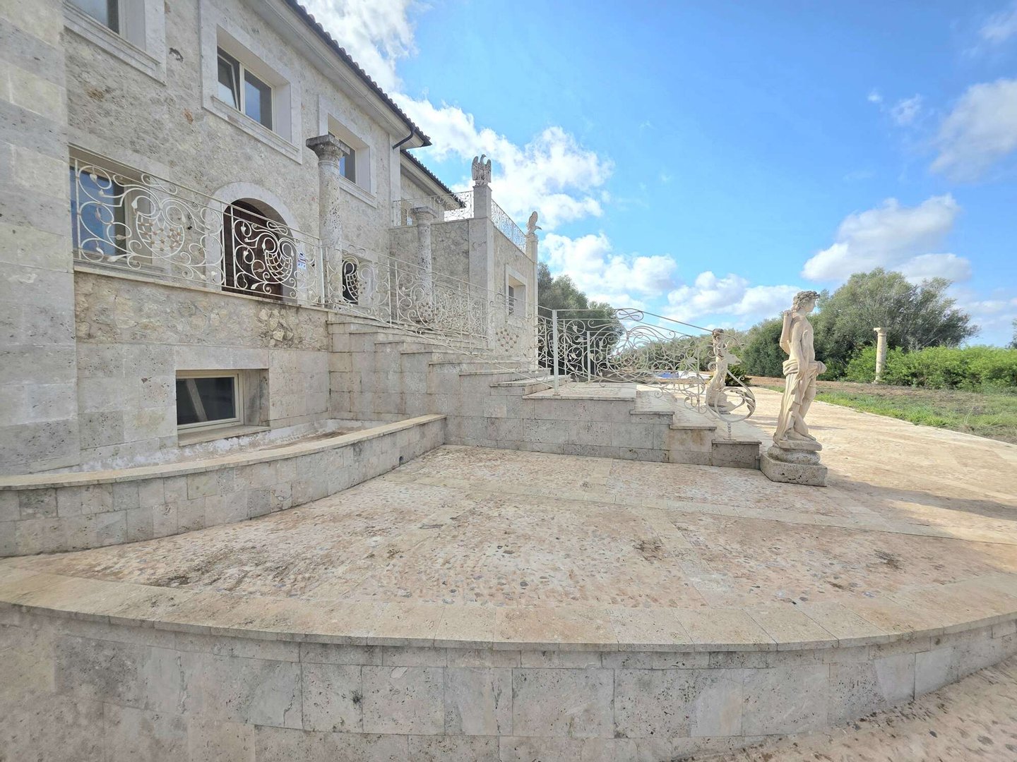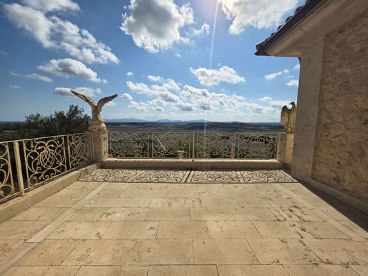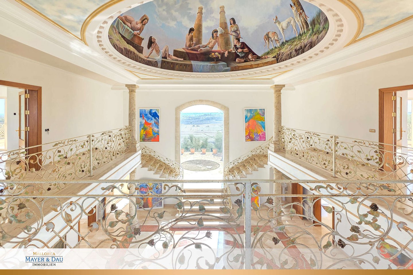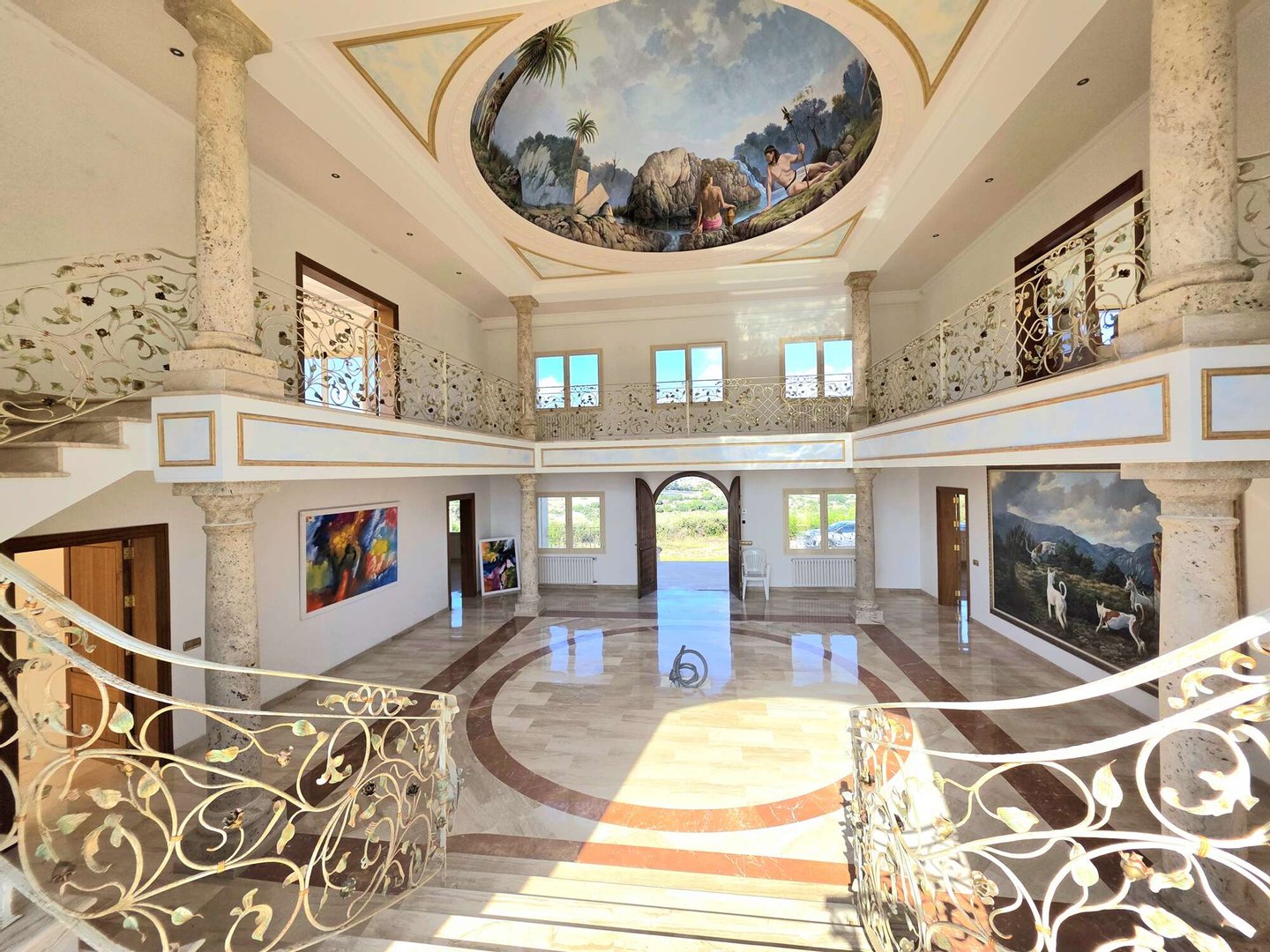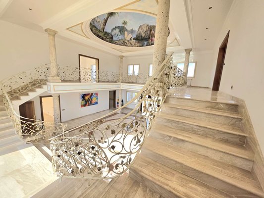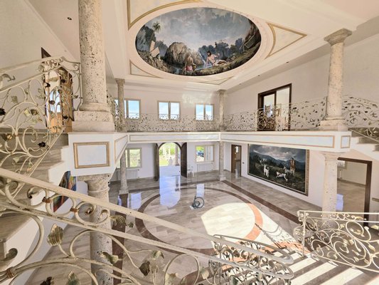 Das spektakuläre Entrée mit imposantem Panoramafenster und freitragenden Kragarmtreppen, die wie in einer Filmszene à la Hollywood in das Obergeschoss führen, ist der Inbegriff von Eleganz. Kunstvolle Skulpturen, eine verzierte Gewölbekuppel eines renommierten Malers und edle Travertin-Marmorböden setzen Akzente, die Renaissance und mediterranes Flair harmonisch vereinen.