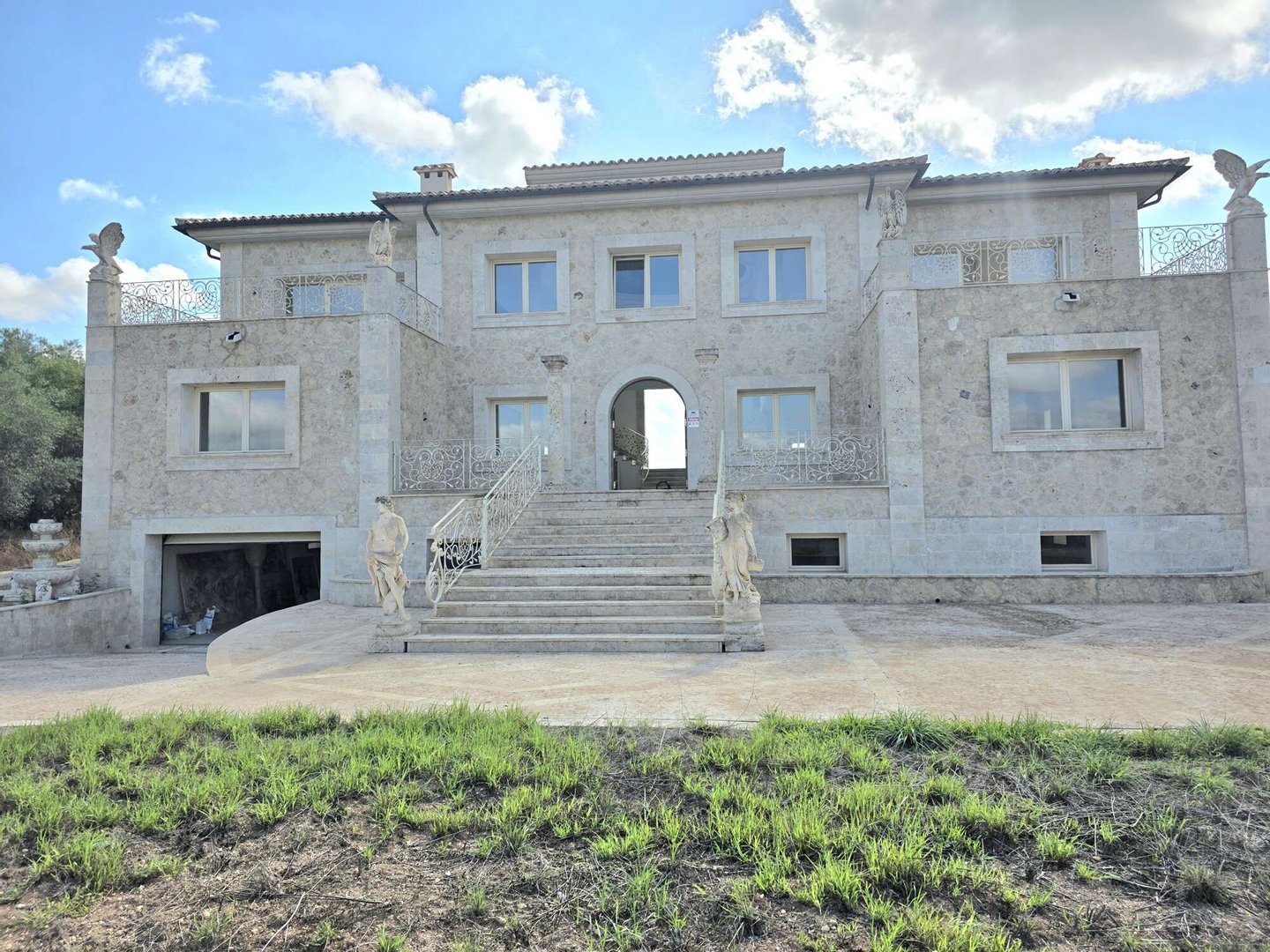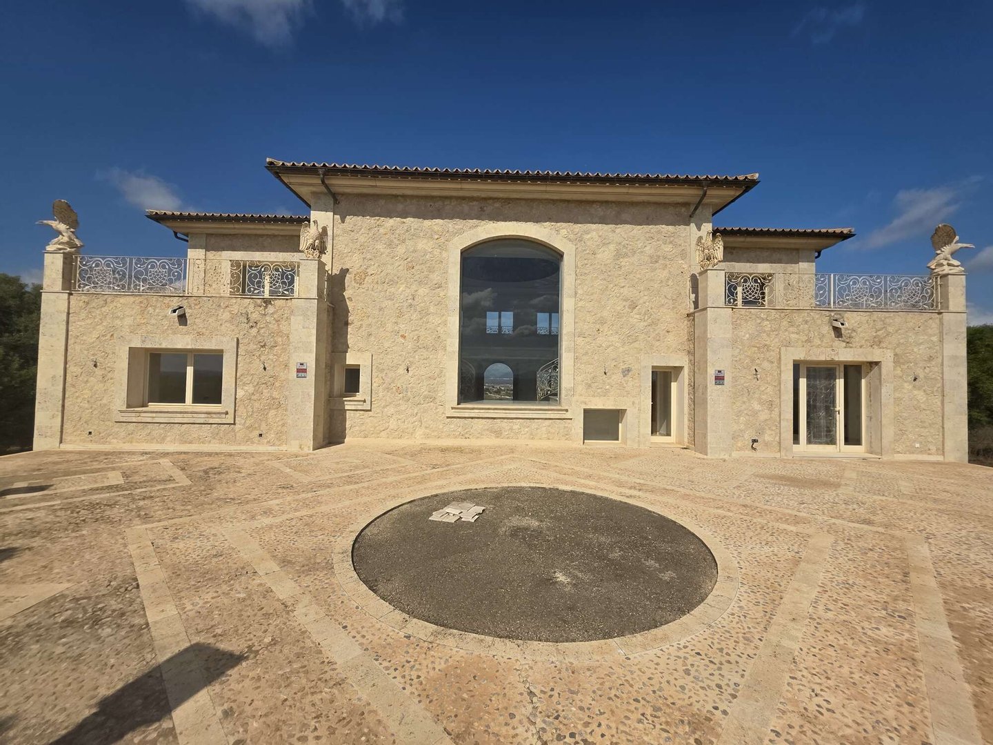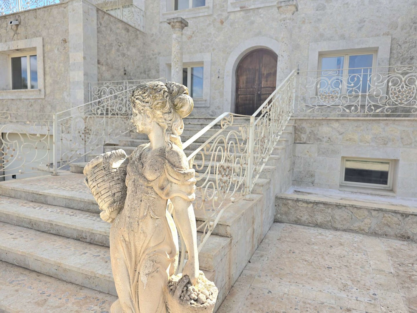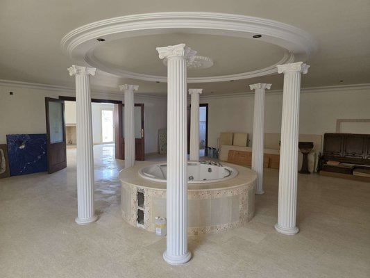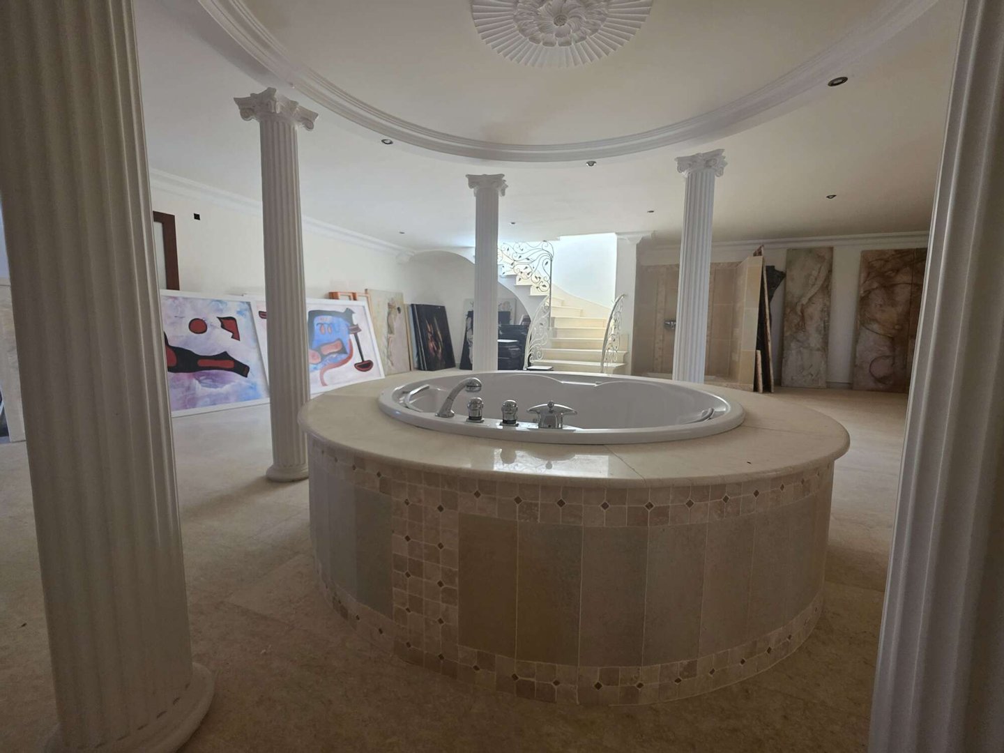 Das spektakuläre Entrée mit imposantem Panoramafenster und freitragenden Kragarmtreppen, die wie in einer Filmszene à la Hollywood in das Obergeschoss führen, ist der Inbegriff von Eleganz. Kunstvolle Skulpturen, eine verzierte Gewölbekuppel eines renommierten Malers und edle Travertin-Marmorböden setzen Akzente, die Renaissance und mediterranes Flair harmonisch vereinen.