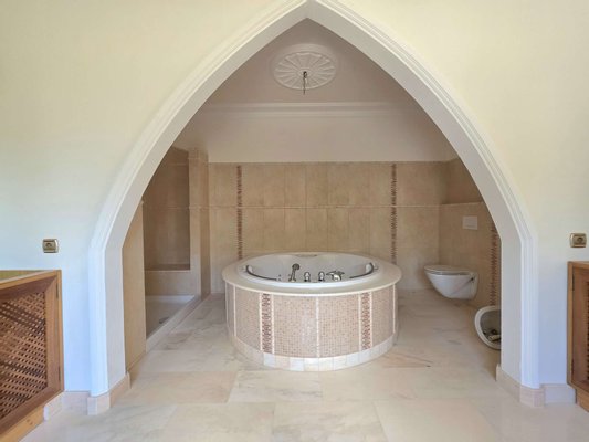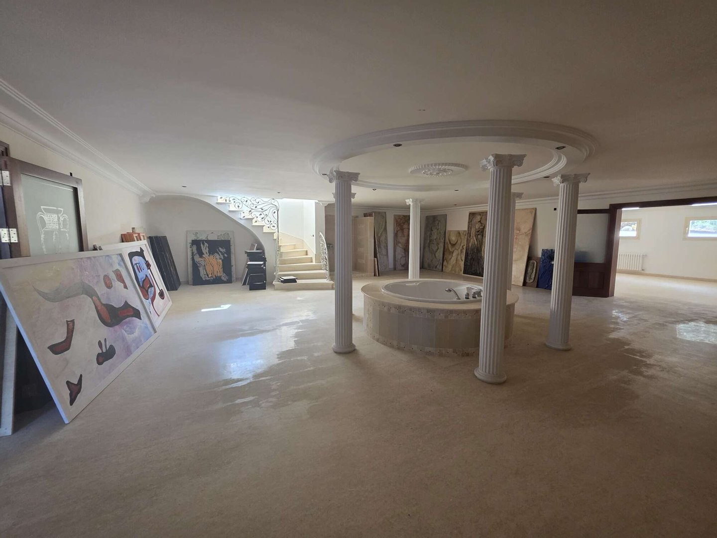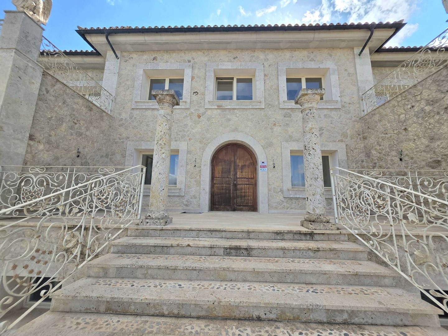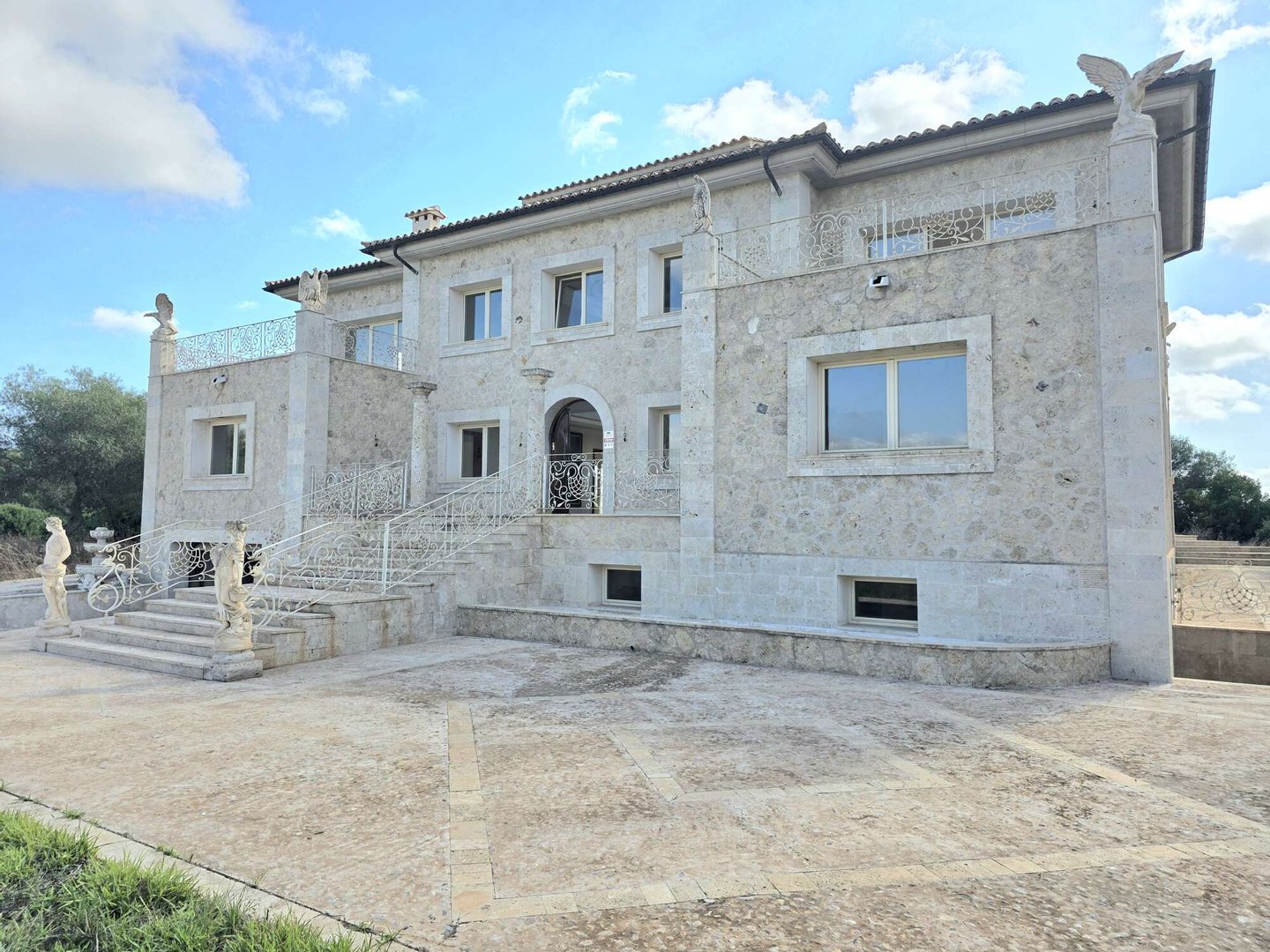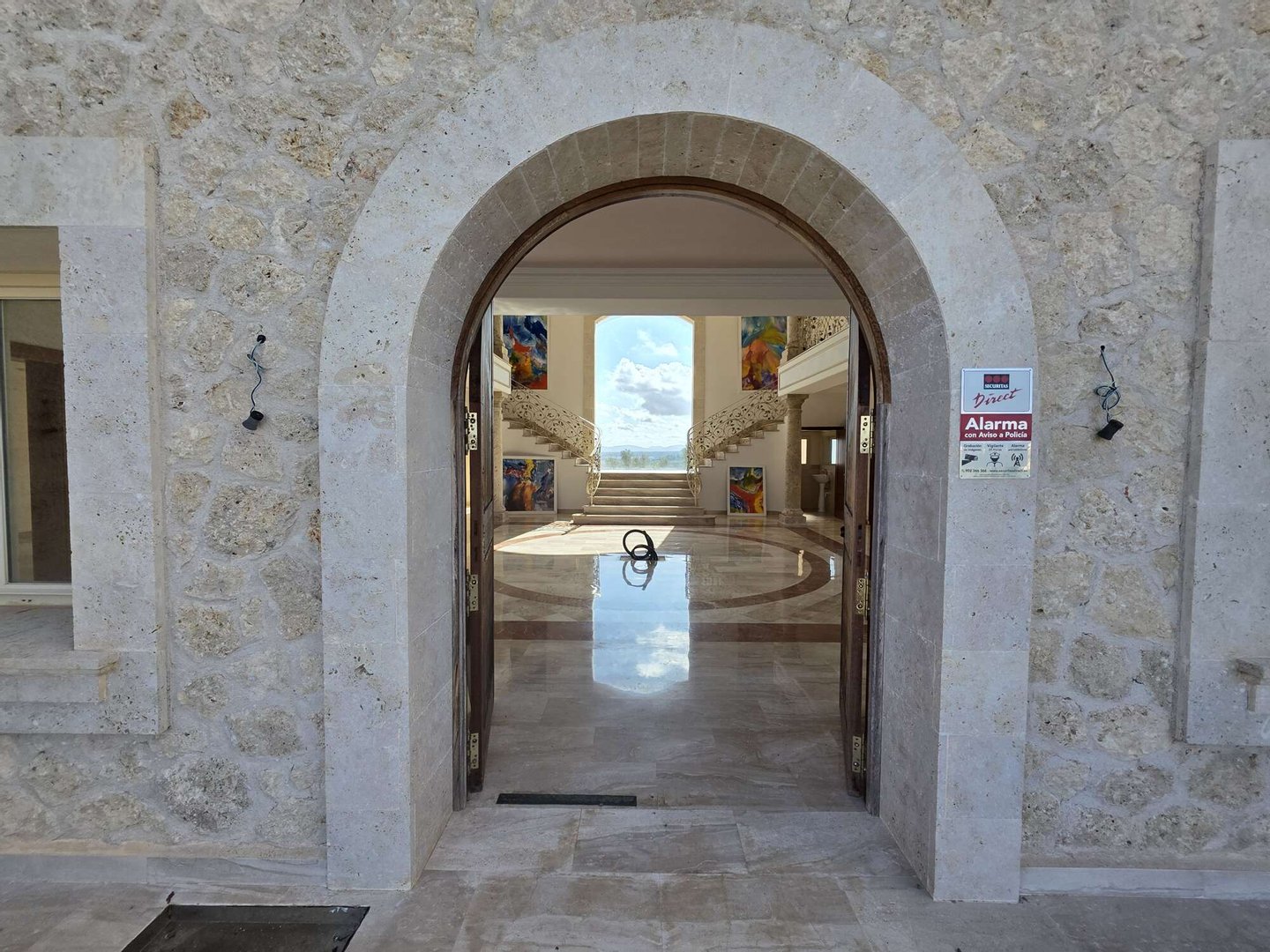 Das spektakuläre Entrée mit imposantem Panoramafenster und freitragenden Kragarmtreppen, die wie in einer Filmszene à la Hollywood in das Obergeschoss führen, ist der Inbegriff von Eleganz. Kunstvolle Skulpturen, eine verzierte Gewölbekuppel eines renommierten Malers und edle Travertin-Marmorböden setzen Akzente, die Renaissance und mediterranes Flair harmonisch vereinen.