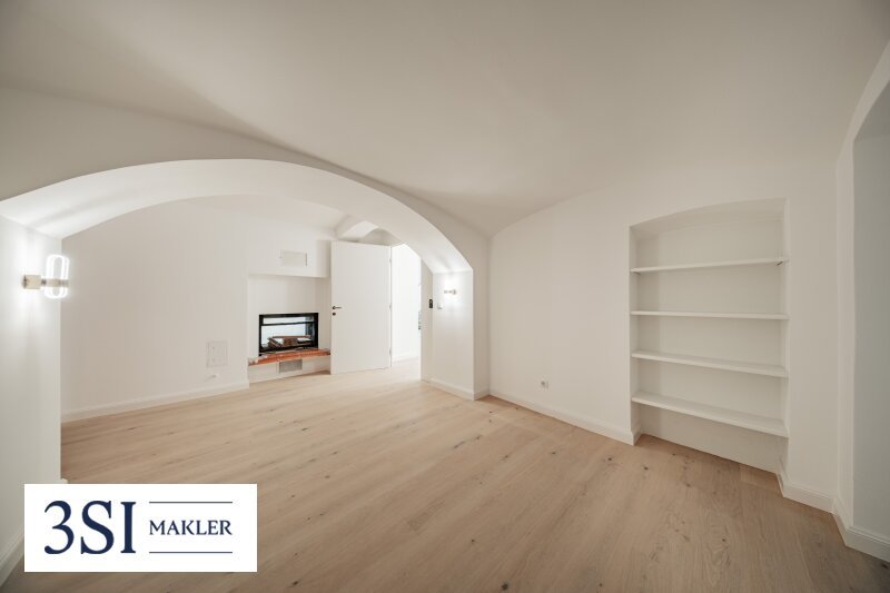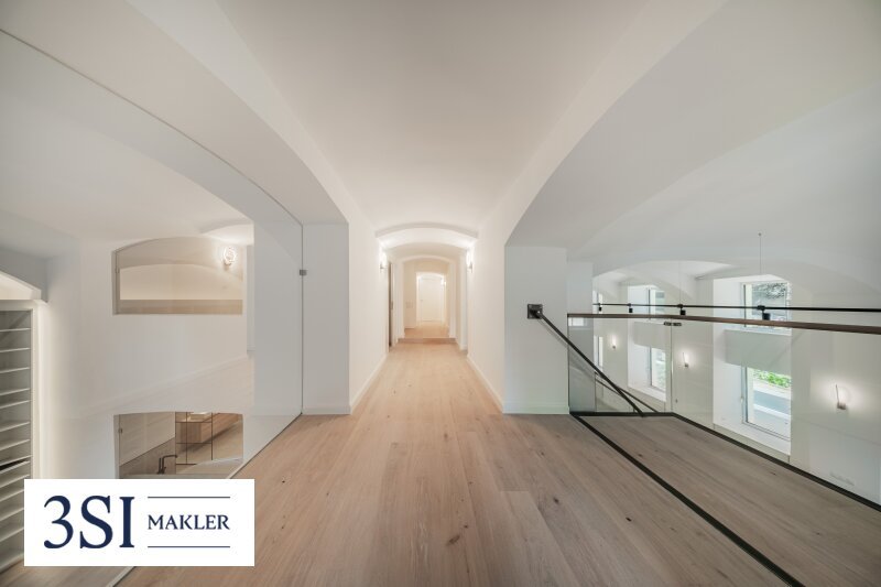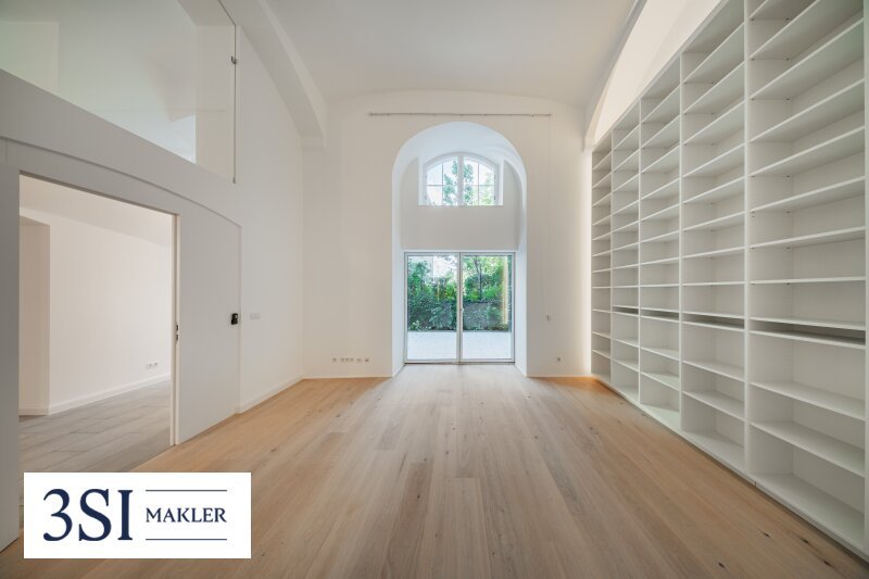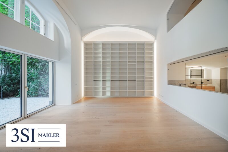 Der Eingang über die Terrasse des Gartengeschoßes führt in ein spektakuläres Wohnambiente mit offenem Grundriss und beeindruckendem Luftraum. Die großzügige Wohnküche mit rund 88 m² ist das Herzstück dieser Ebene – lichtdurchflutet, vielseitig nutzbar und mit Terrassenzugang auf beiden Seiten. Ergänzt wird dieser Bereich durch eine Bibliothek (auch als Schlafzimmer nutzbar), ein Kaminzimmer, ein Badezimmer sowie einen Wirtschaftsraum/Speisekammer direkt neben der Küche.