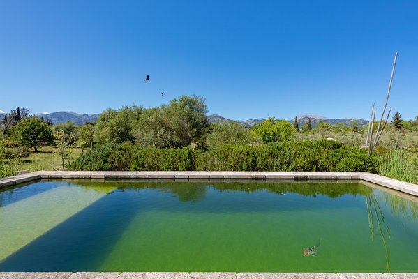 Im Außenbereich finden Sie sonnige Terrassen, eine fantastische Aussicht auf die Berge und einen Pool, der durch die Filterung mit Schilf und Seerosen umweltfreundlich ist und somit kein Chlor benötigt.