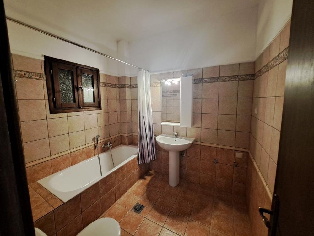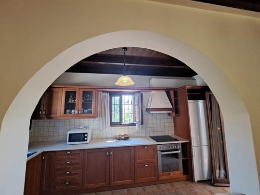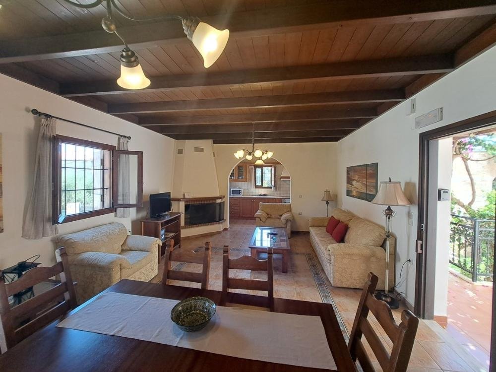 Das Erdgeschoss verfügt über einen einladenden, offenen Wohnbereich mit Kamin, einen Essbereich und eine voll ausgestattete Küche – ideal für den Alltag und die Unterhaltung. Ein geräumiges Schlafzimmer mit Doppelbett und Zugang zu einem großen Balkon mit Blick auf den Pool und die üppige kretische Landschaft ist ebenfalls vorhanden. Ein großes Badezimmer mit Badewanne ist ebenfalls vorhanden. Im ersten Stock befinden sich zwei weitere Schlafzimmer, eines mit Doppelbett und das andere mit zwei Einzelbetten. Beide Schlafzimmer haben Zugang zu Balkonen. Ein separater Waschraum und ein Badezimmer mit Badewanne sind ebenfalls vorhanden.