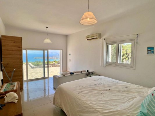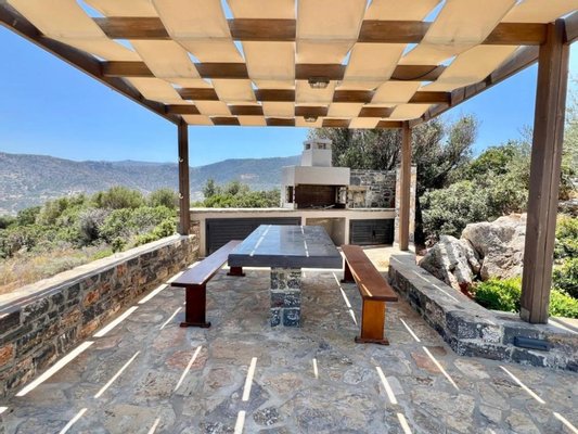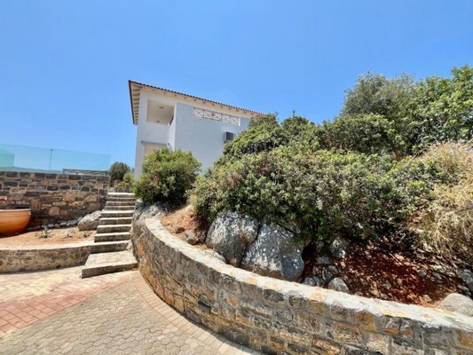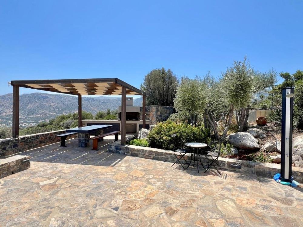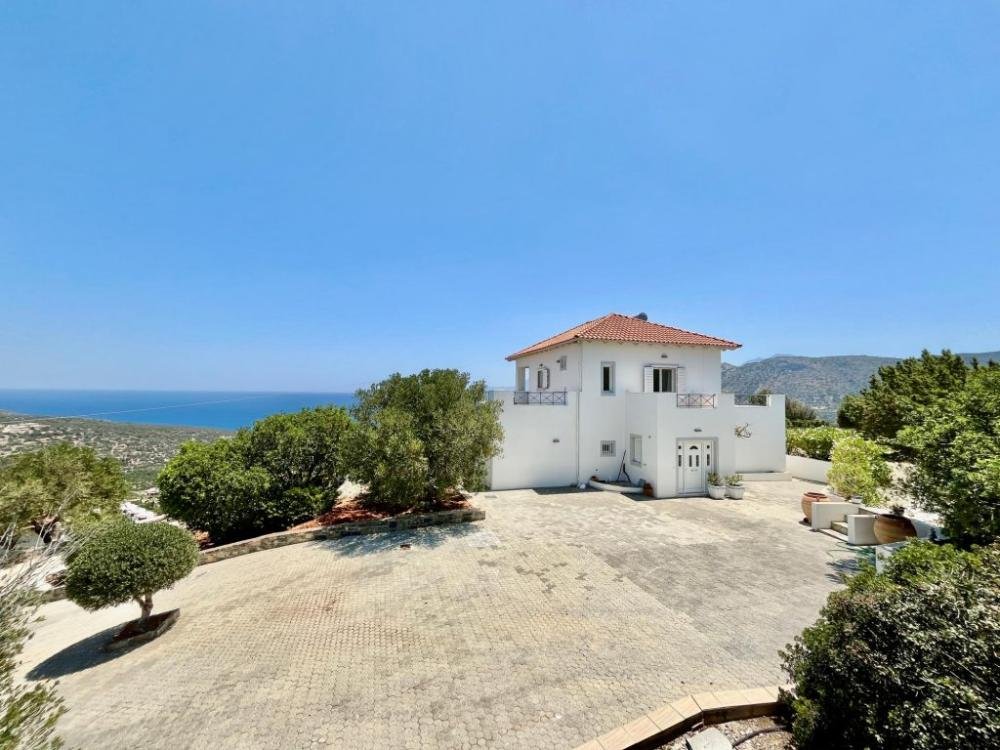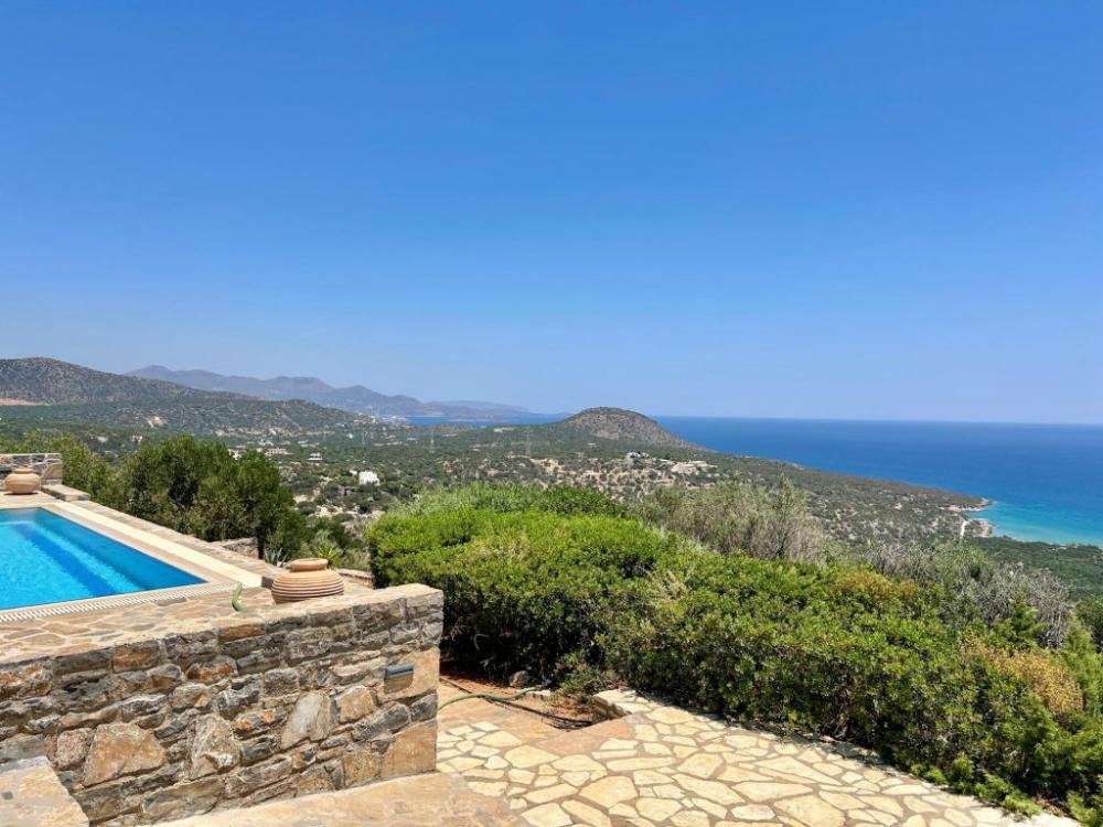 Auf einem ruhigen Hügel in der begehrten Gegend von Kalo Horio nahe Agios Nikolaos gelegen, bietet diese exquisite, freistehende Villa einen herrlichen Blick über die Mirabello-Bucht, die Sandstrände von Istron und die beeindruckenden Bergketten von