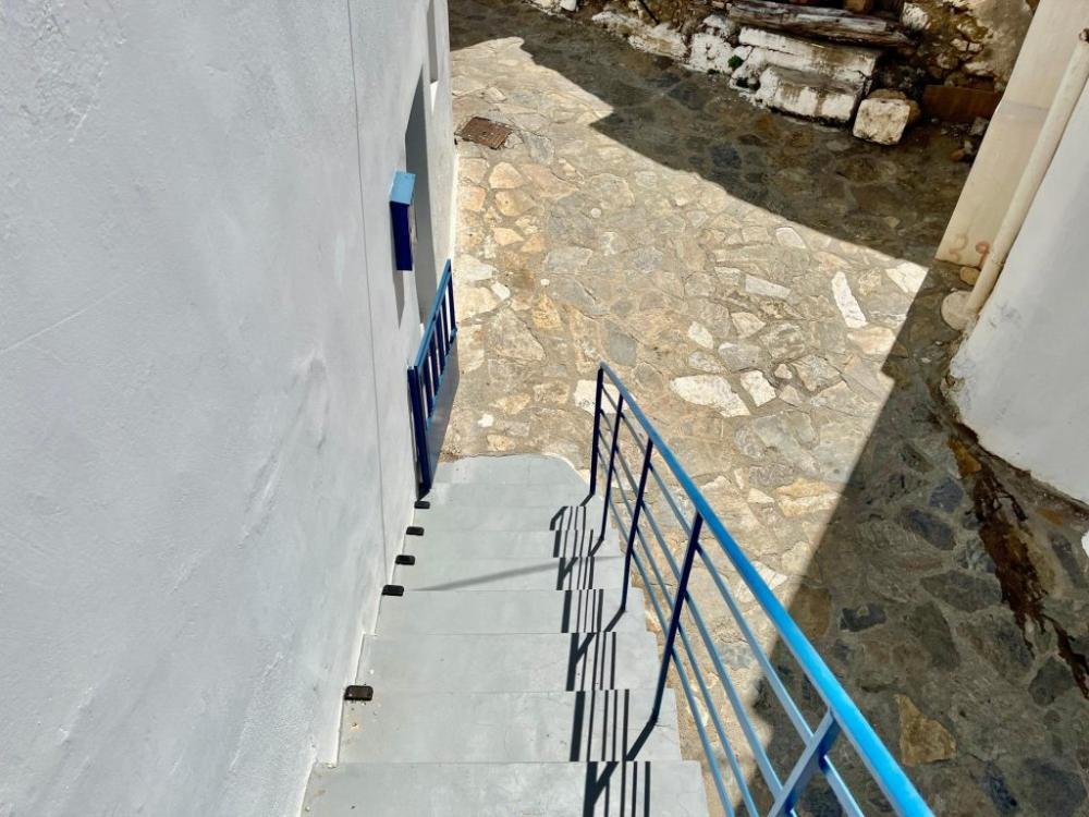 Das Anwesen mit einer Gesamtfläche von 130 Quadratmetern besteht aus zwei eigenständigen Apartments, die durchdacht mit traditionellen blauen Türen und Fenstern gestaltet sind, die authentischen kretischen Charme verleihen. Das erste Apartment befindet sich im Erdgeschoss, eine Außentreppe führt zur zweiten Wohnung im ersten Stock.