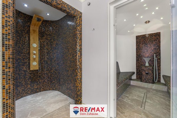 Das Herzstück des Anwesens bildet der rund 150 Quadratmeter große Wellnessbereich. Er umfasst einen Indoor-Pool mit Salzwasser und Gegenstromanlage, Whirlpool, Dampfsauna und Infrarotsauna. Eine integrierte Farblichttherapie in den Saunen und im Poolbereich sorgt für entspannende und wohltuende Wellnessmomente. Die angrenzende Sonnenterrasse mit Naturteich und Wasserfall lädt zu erholsamen Stunden in vollkommener Ruhe ein und bietet einen exklusiven Rückzugsort.