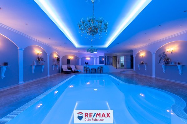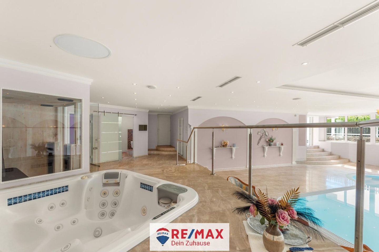 Das Herzstück des Anwesens bildet der rund 150 Quadratmeter große Wellnessbereich. Er umfasst einen Indoor-Pool mit Salzwasser und Gegenstromanlage, Whirlpool, Dampfsauna und Infrarotsauna. Eine integrierte Farblichttherapie in den Saunen und im Poolbereich sorgt für entspannende und wohltuende Wellnessmomente. Die angrenzende Sonnenterrasse mit Naturteich und Wasserfall lädt zu erholsamen Stunden in vollkommener Ruhe ein und bietet einen exklusiven Rückzugsort.