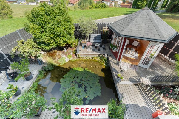 Der Außenbereich beeindruckt mit einem sehr gepflegten Garten, einem großzügigen Gemüsegarten, einer Vielzahl an Obstbäumen sowie einer Teichanlage mit zwei Teichen und Wasserfall. Das Anwesen verfügt über eine eigene Quelle mit großer Zisterne, die eine nachhaltige Wasserversorgung garantiert. Ein stilvoller Pavillon auf der Terrasse schafft ideale Orte für Erholung, Gartenfeste oder naturnahe Momente und verbindet das Anwesen harmonisch mit der Umgebung.