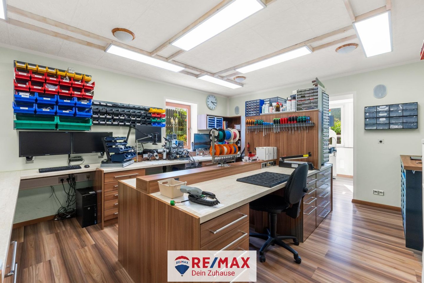 Eine separate Zufahrt sowie ein eigener Eingang führen in einen zusätzlichen Bereich, der sich flexibel als Arbeits- oder Wohnbereich nutzen lässt und vielseitige Nutzungsmöglichkeiten bietet.