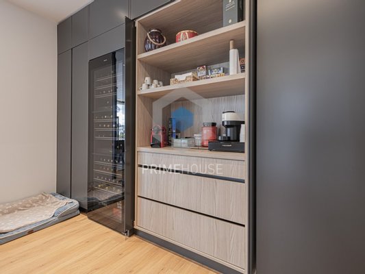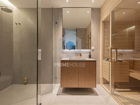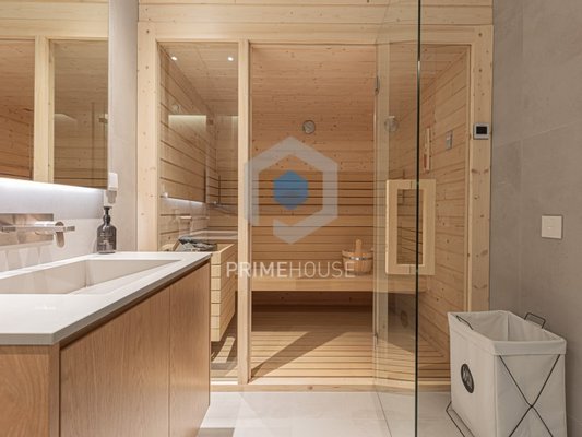 Im Untergeschoss finden Sie eine Garage mit Platz für vier Autos sowie eine Wäscherei, eine Sauna und einen privaten Fitnessraum, ideal für Momente der Entspannung und Freizeit.