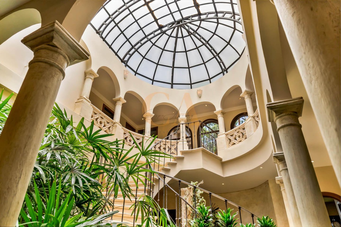 Vom Eingang aus erhellt ein kuppelförmiger Lichtschacht einen herrlichen tropischen Innengarten, ein wahres Meisterwerk des Hauses, das eine zarte Leuchtkraft verleiht.