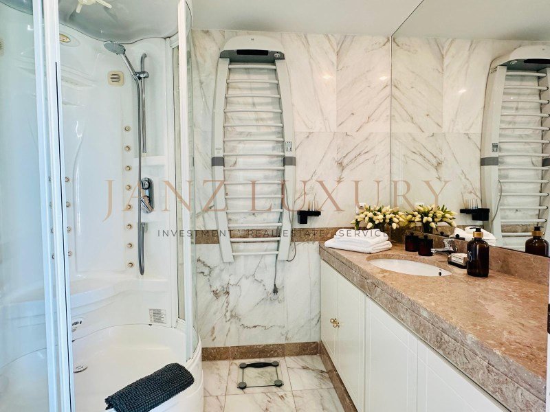 . 1 modernes Badezimmer, ausgestattet mit Jacuzzi-Duschkabine und beheizbarem Handtuchhalter