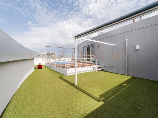 . Eine private Terrasse von 200 m² mit Terrasse, Kunstrasen, Markisen, Windjacken und Jacuzzi-Minipool für vier Personen