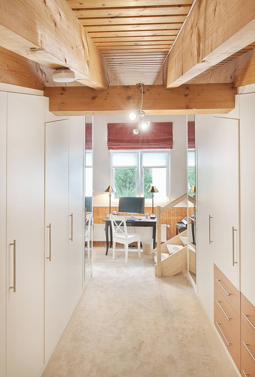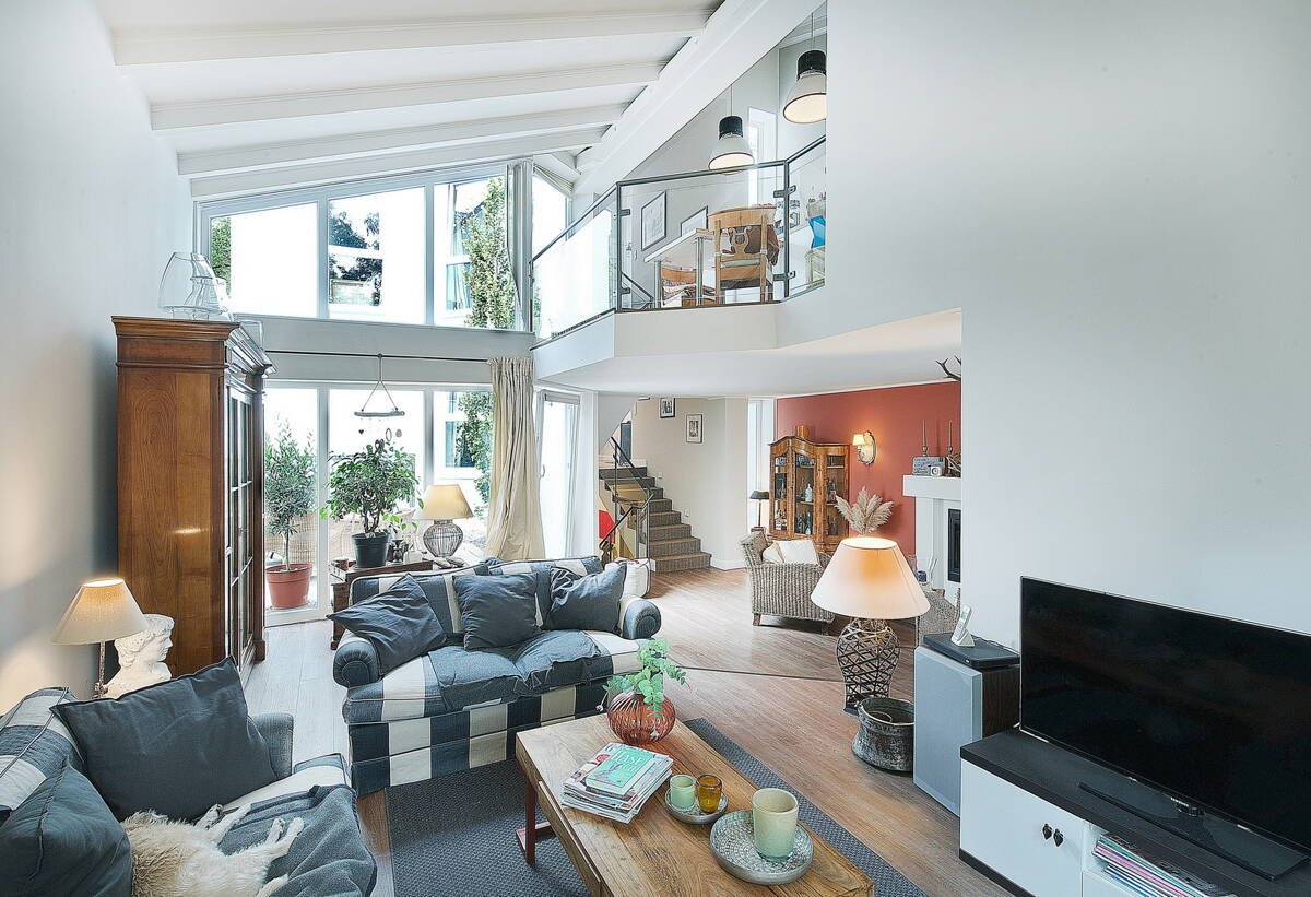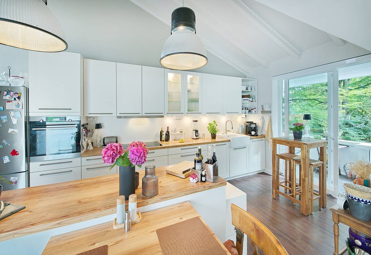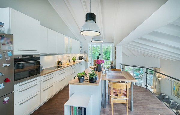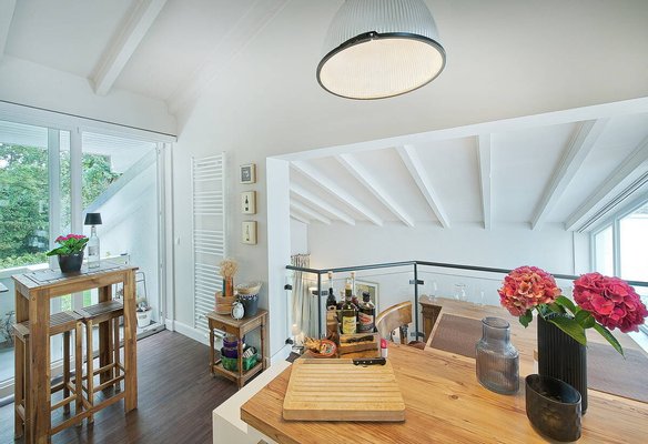 Die zentrale Galerie mit integrierter Küche ist das kommunikative Herzstück. Von hier aus öffnet sich der Blick in den Wohnbereich, gleichzeitig gelangt man auf einen Balkon mit Gartenblick.